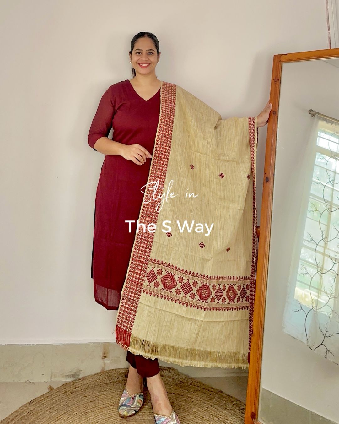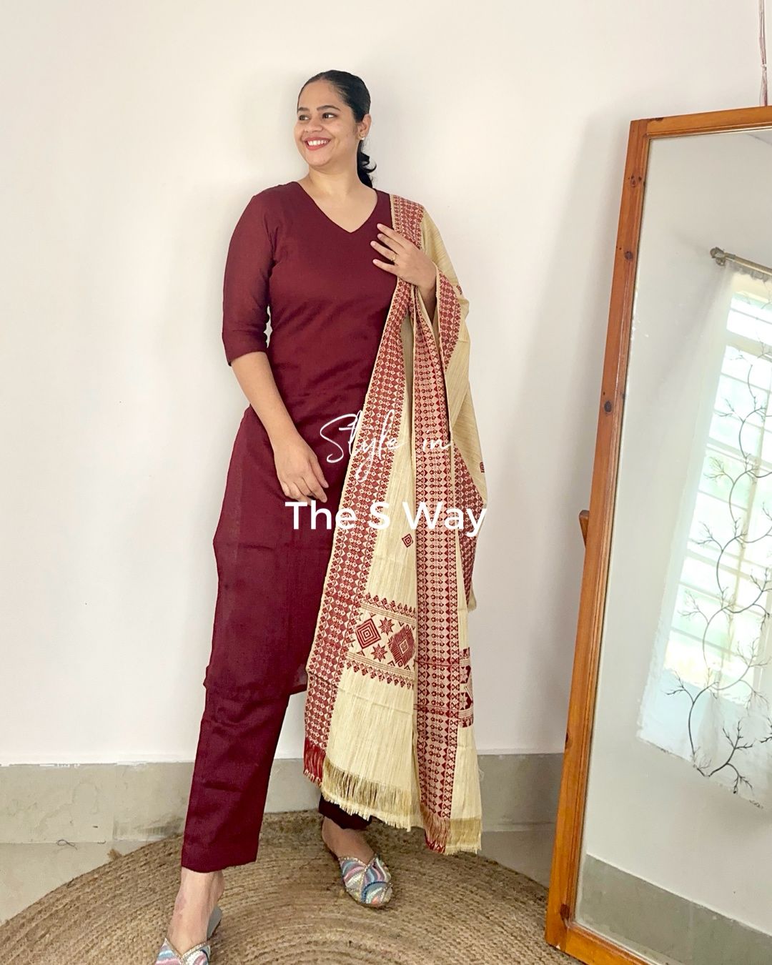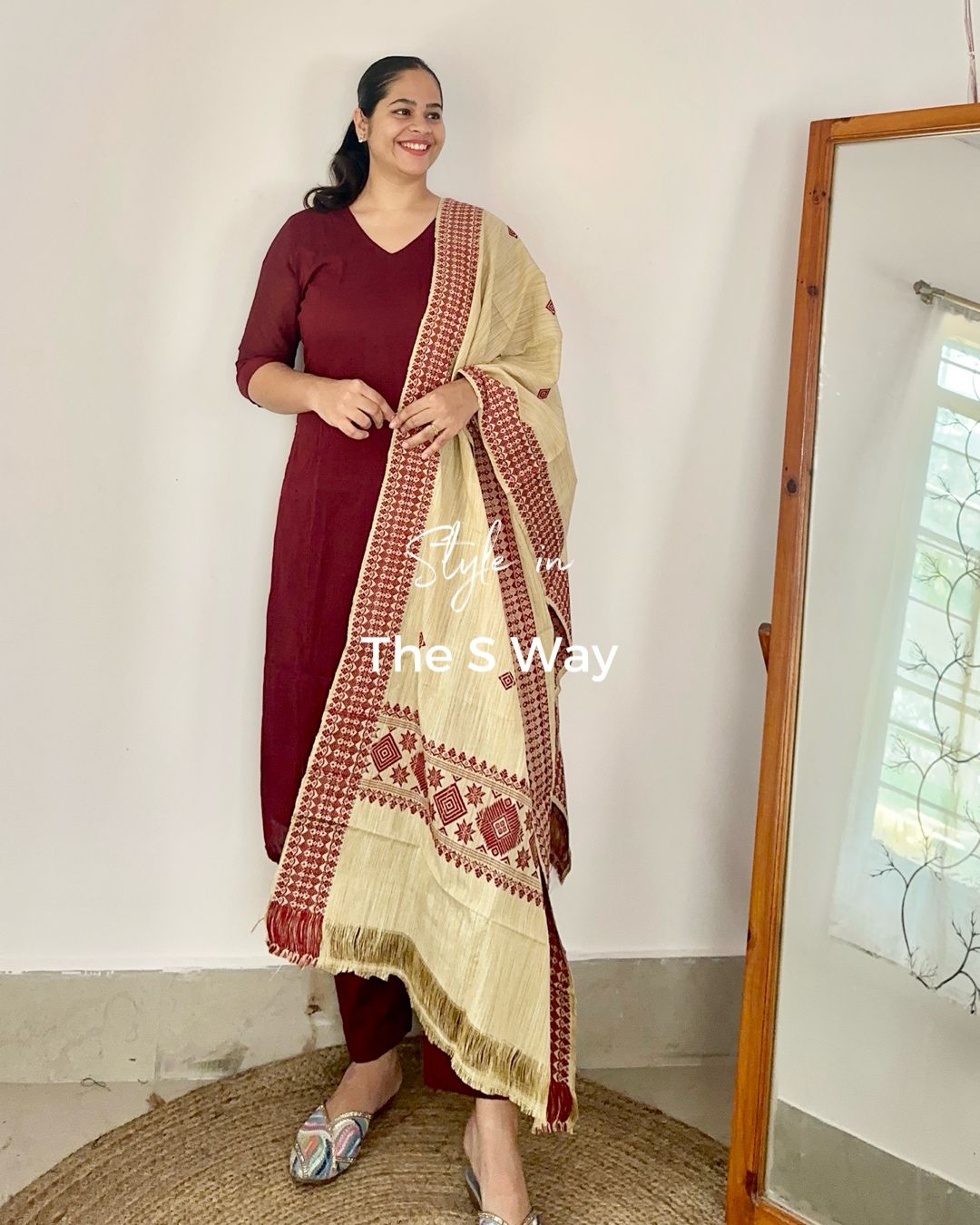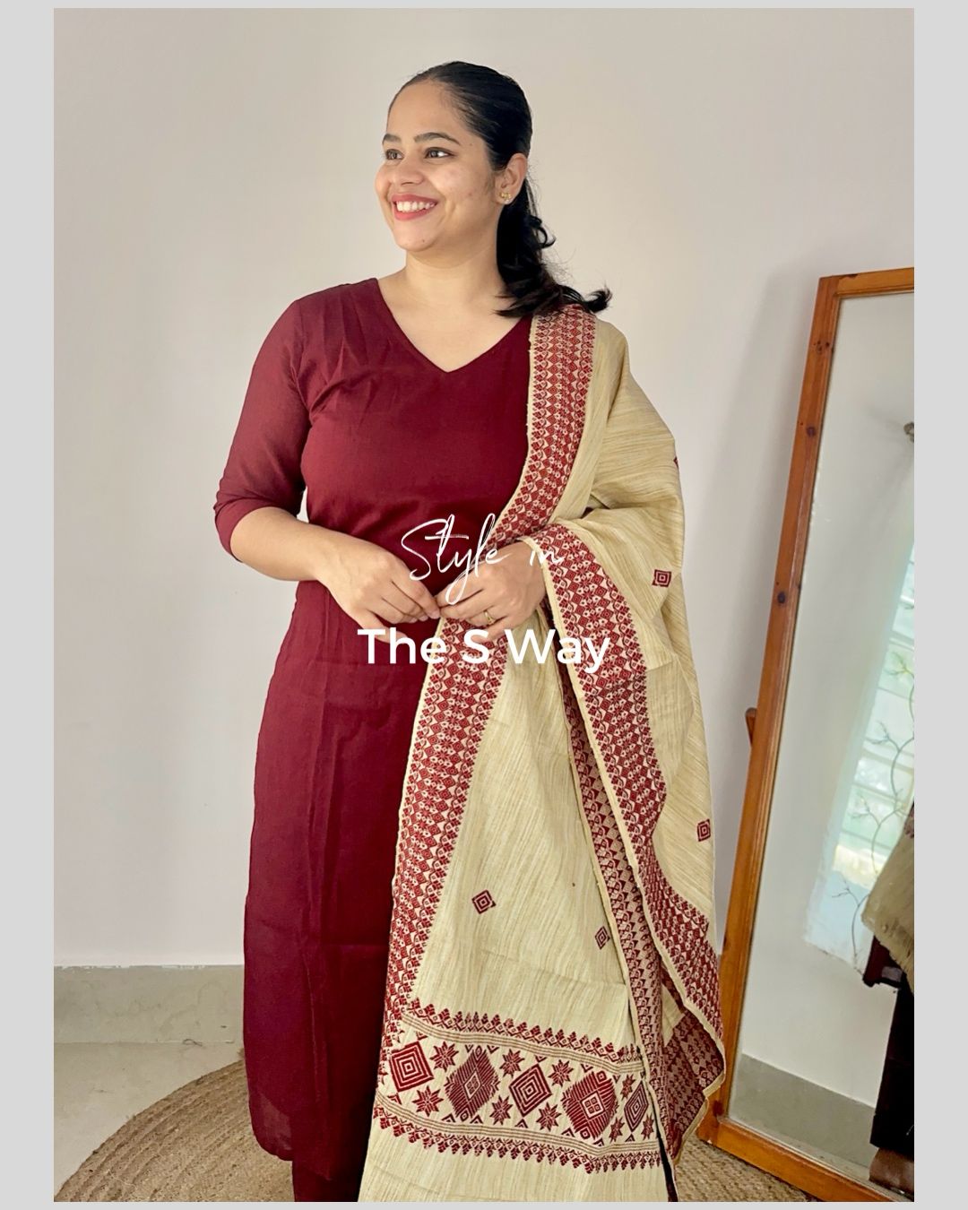Experience effortless elegance with this soft and lightweight handloom cotton kurta and dupatta set in a deep maroon hue. Designed for comfort and style, this set is complemented by a khadi blend dupatta adorned with traditional maroon motifs, adding a touch of heritage charm. Perfect for festive gatherings and cultural celebrations, this ensemble exudes understated sophistication. Handle with care for lasting beauty.