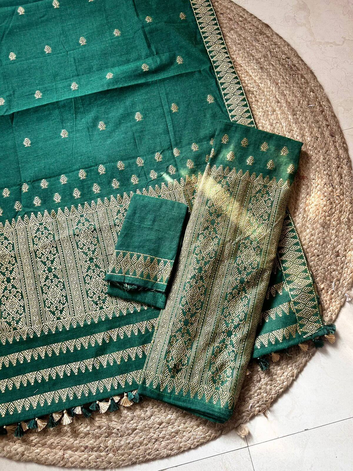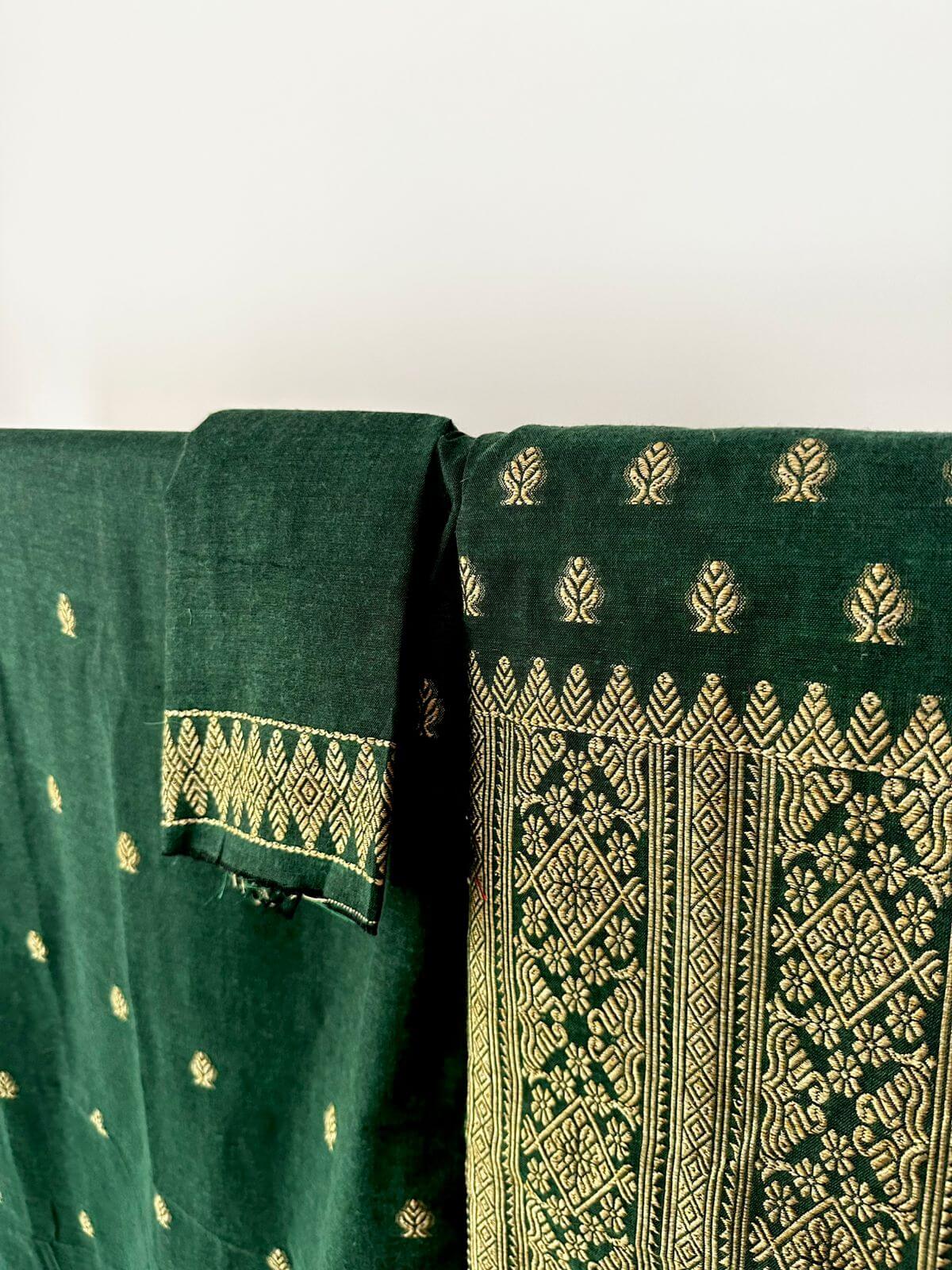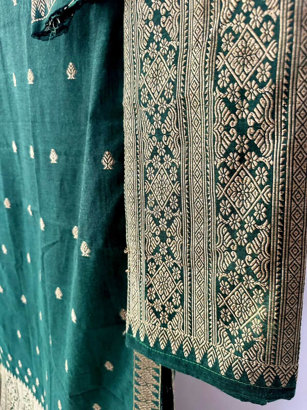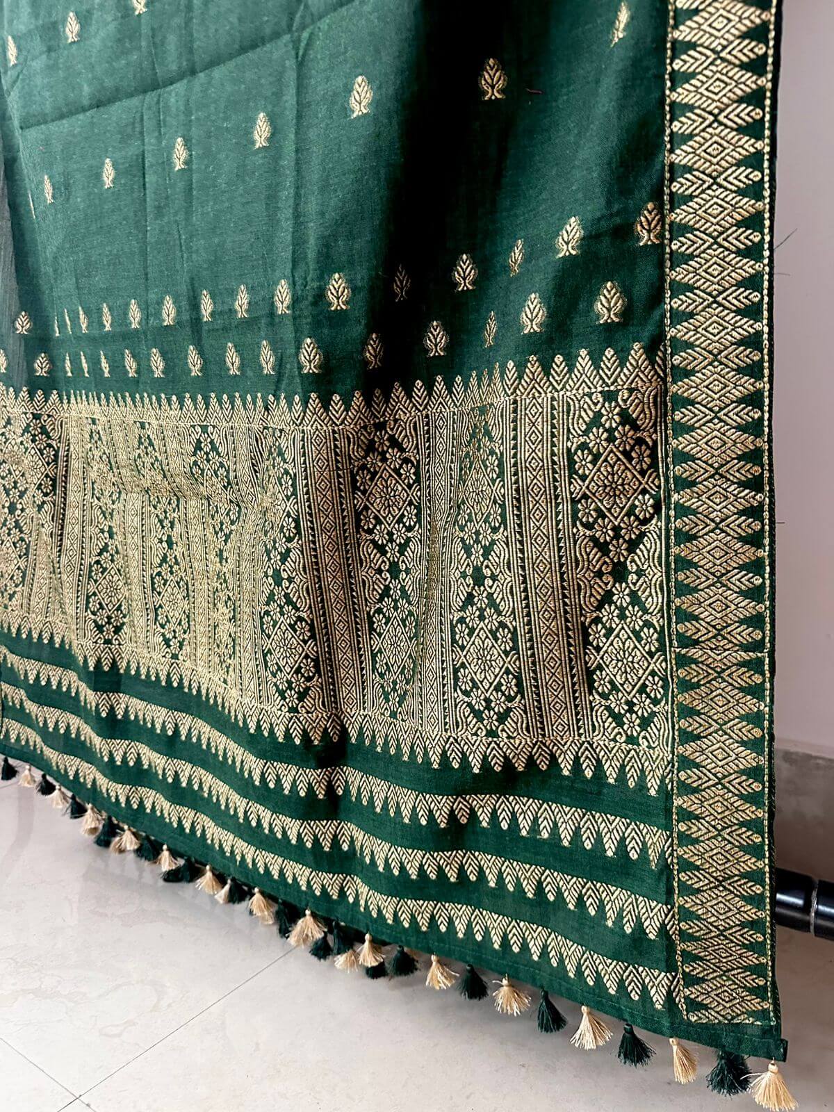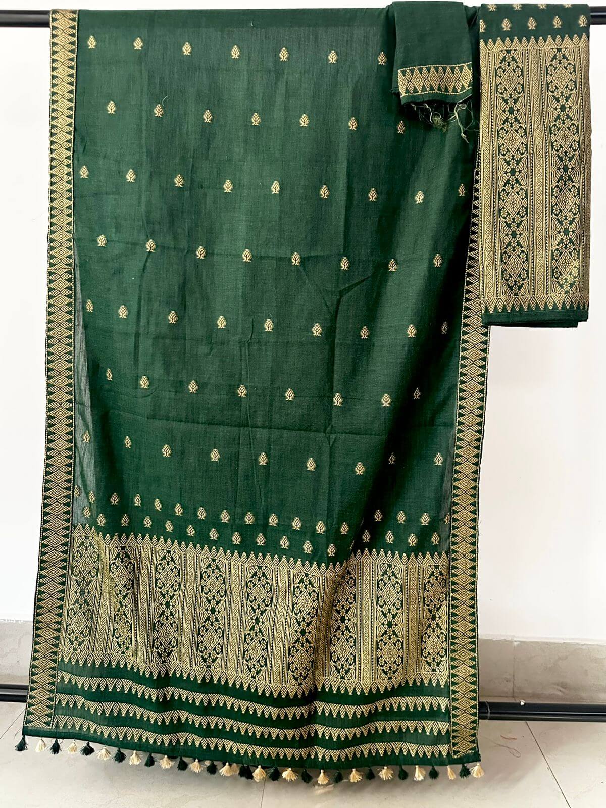 Ready-to-wear Mekhela Sador set, crafted in exceptionally high-quality premium cotton, intricately woven with ghisa/tussar silk fine threads blended with lyocell to create a rich, muga silk-like sheen—offering a luxurious look without being muga. Designed in elegant, earthy tones, the body features beautiful textured weaves that enhance its refined, traditional appeal. The mekhela stands out with its generously detailed borders in signature golden fine threads, adding depth and grandeur to the ensemble. Sophisticated yet versatile, this set is perfect for weddings, larger gatherings, or intimate celebrations, especially for those who prefer understated, elegant hues over vibrant tones. Comes with an attached unstitched blouse piece.