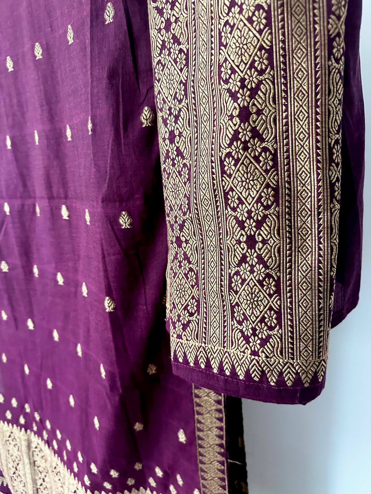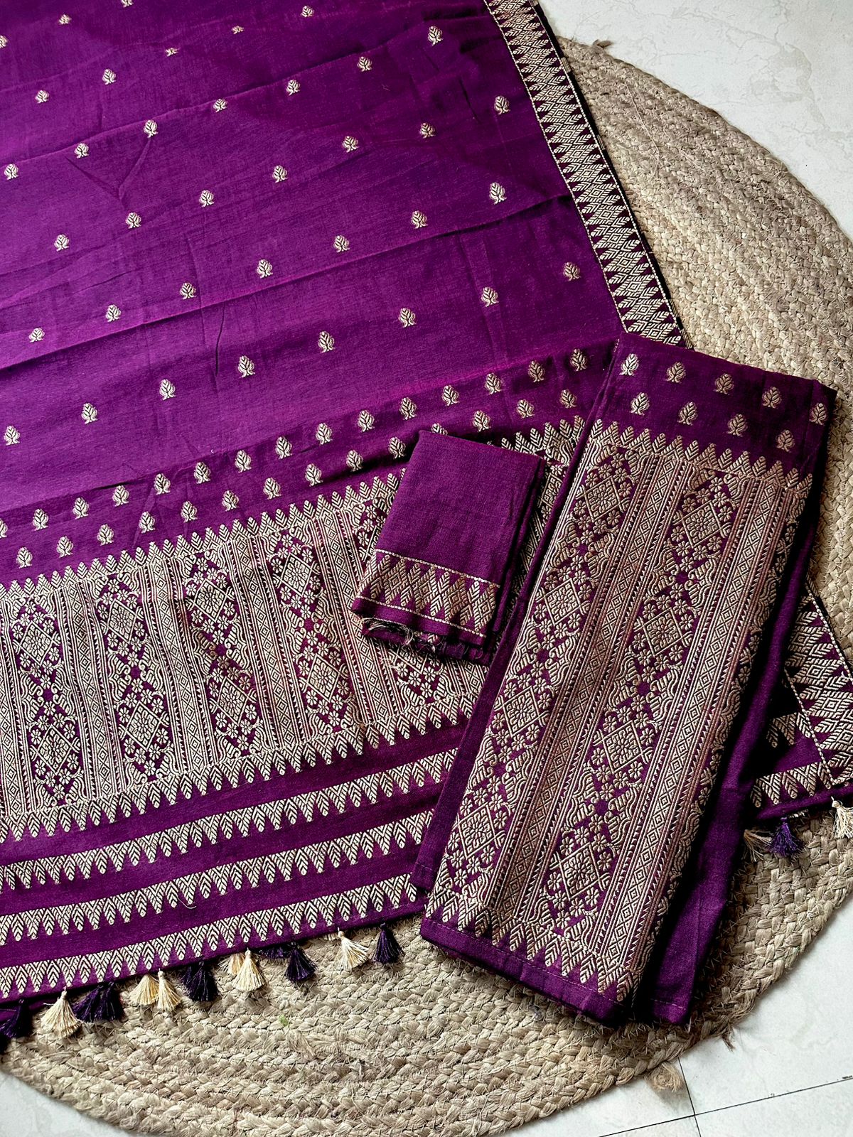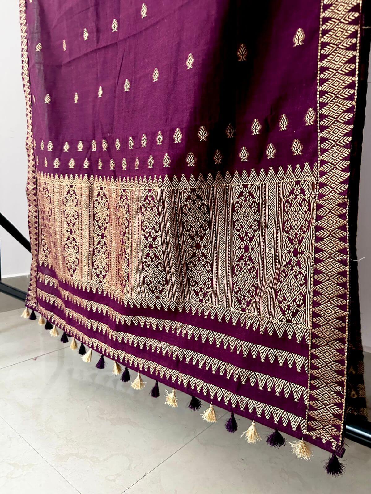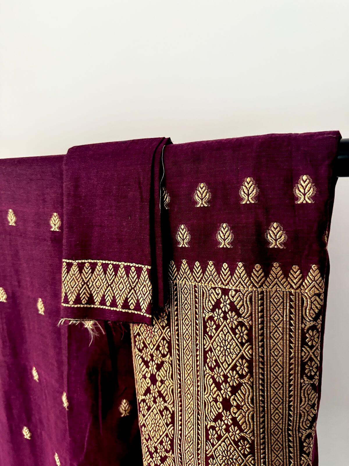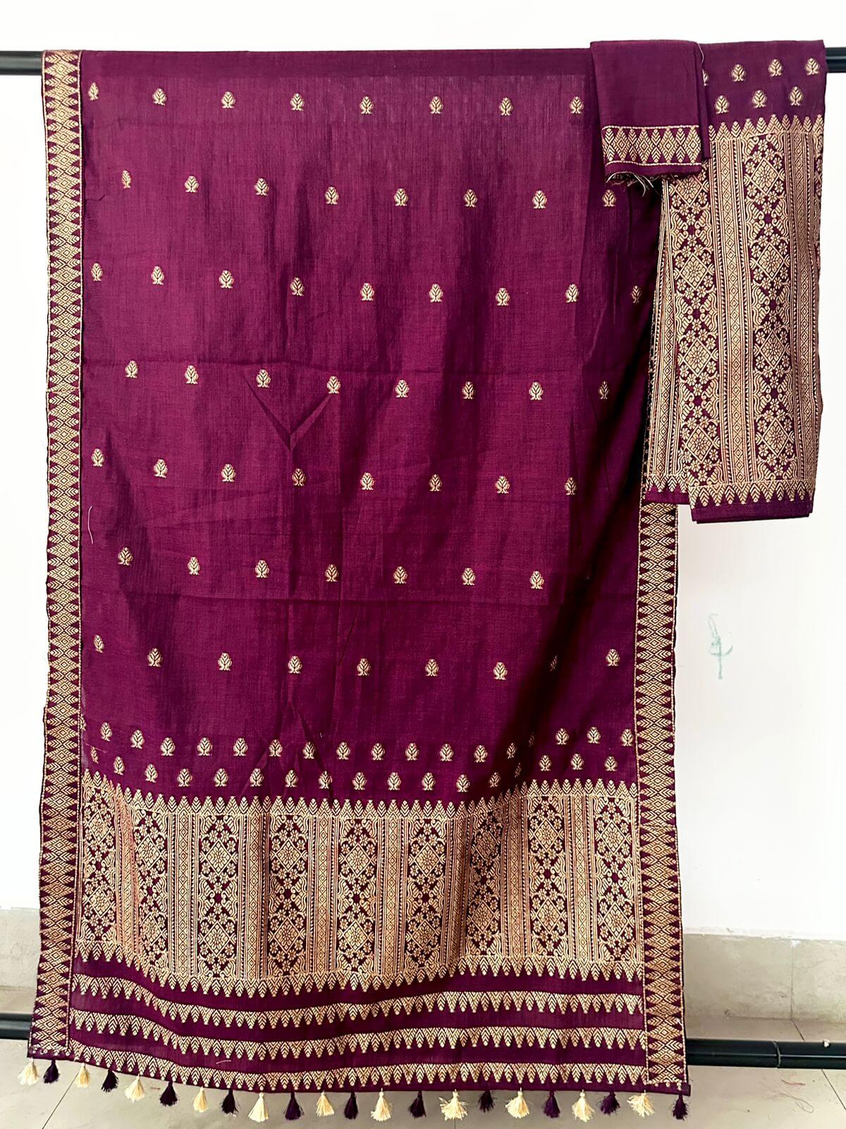 Ready-to-wear Mekhela Sador set, crafted in exceptionally high-quality premium cotton, intricately woven with ghisa/tussar silk fine threads blended with lyocell to create a rich, muga silk-like sheen—offering a luxurious look without being muga. Designed in elegant, earthy tones, the body features beautiful textured weaves that enhance its refined, traditional appeal. The mekhela stands out with its generously detailed borders in signature golden fine threads, adding depth and grandeur to the ensemble. Sophisticated yet versatile, this set is perfect for weddings, larger gatherings, or intimate celebrations, especially for those who prefer understated, elegant hues over vibrant tones. Comes with an attached unstitched blouse piece.