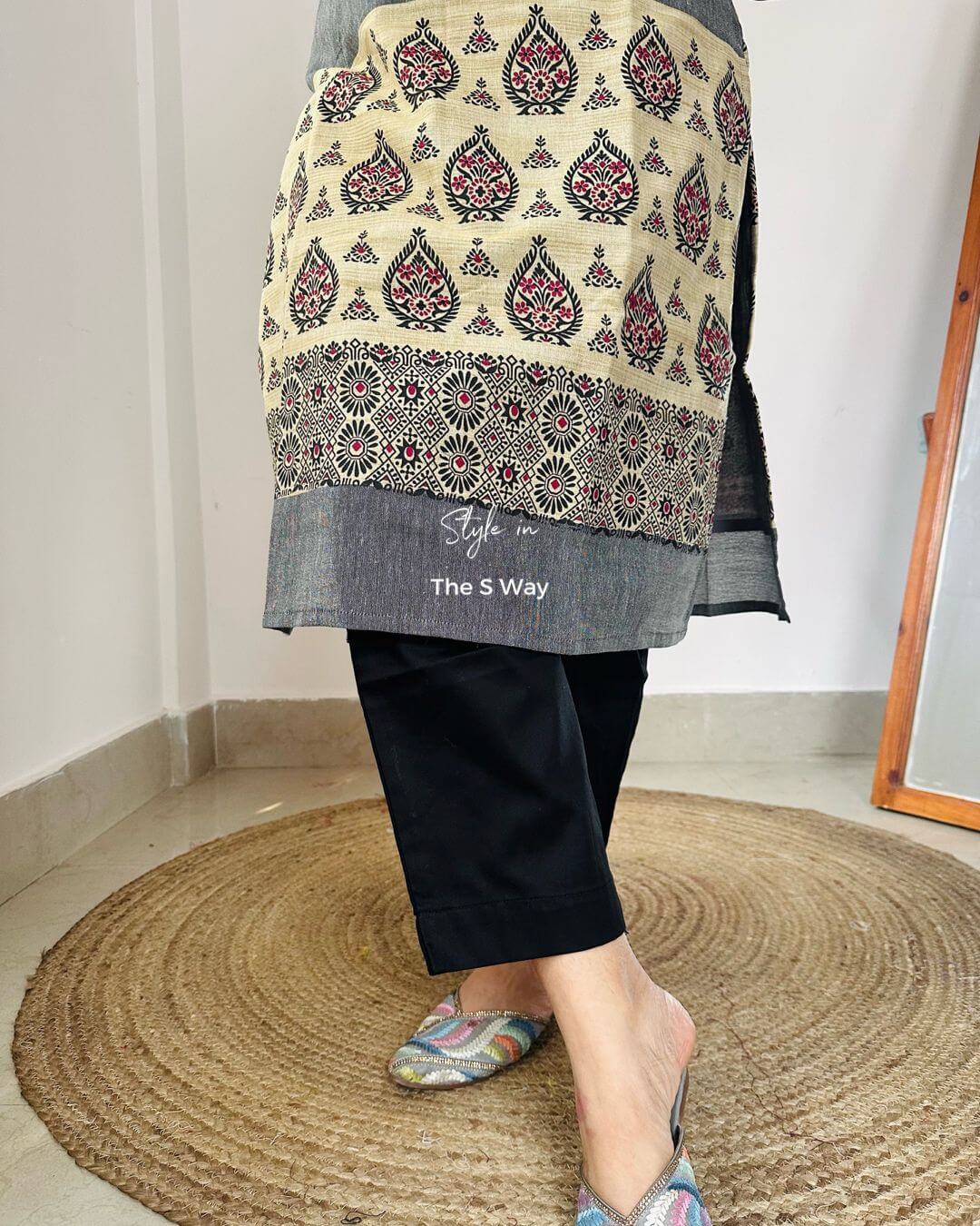 A formal Khadi cotton straight kurta designed with a clean, minimalist silhouette for an elegant and polished look. The highlight of the piece is its Assamese traditional motif print, a rare design element that brings a subtle cultural identity to a contemporary garment. Exclusive to The S Way, this kurta blends heritage with modern minimalism.