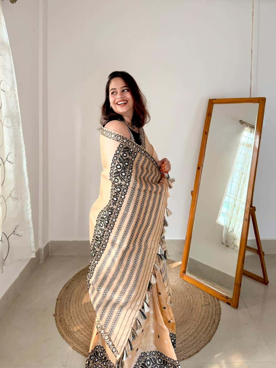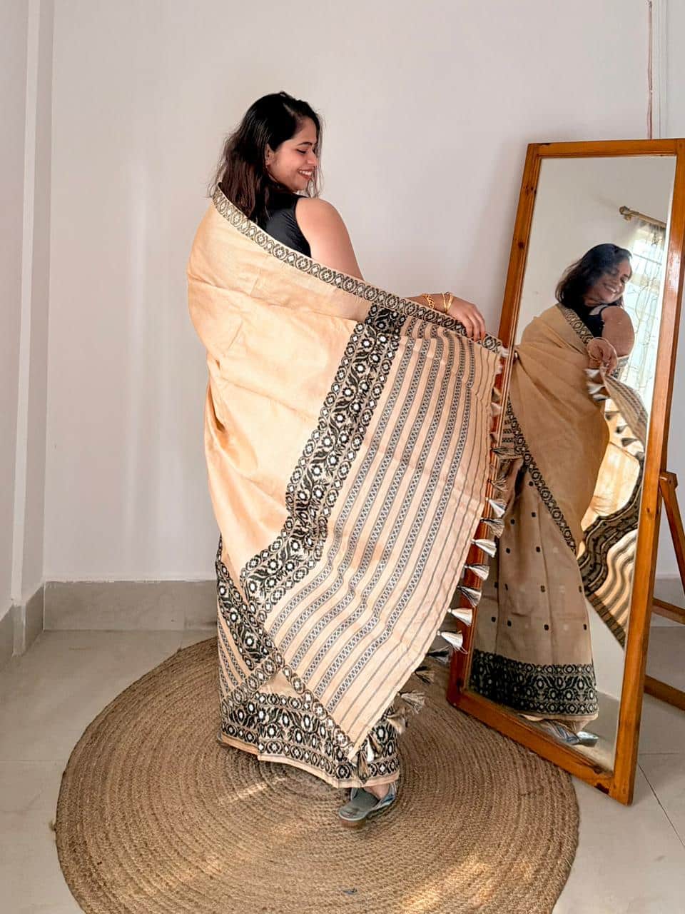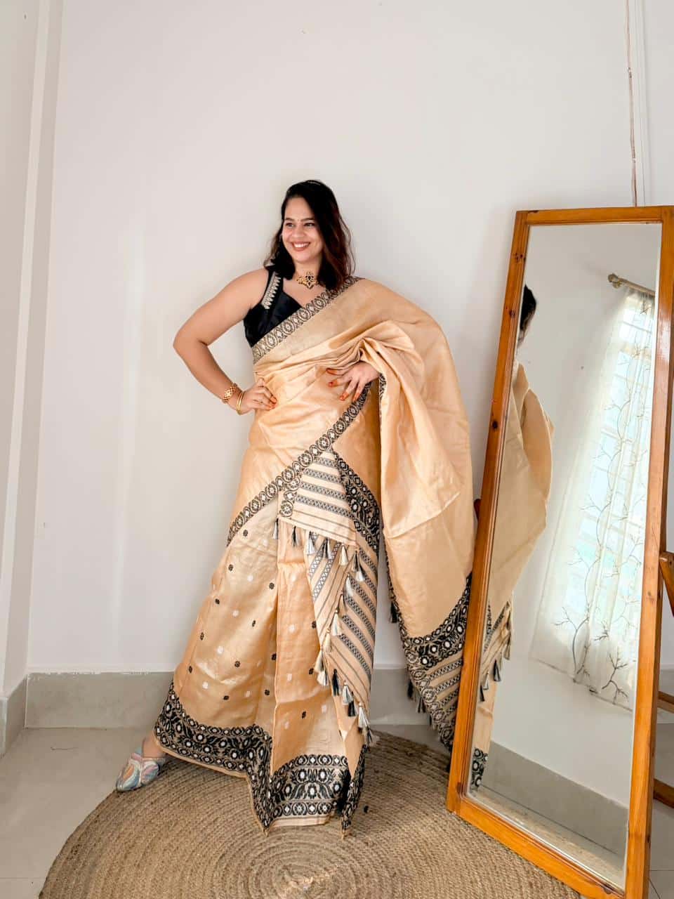 From our Luxe Collection, this pure silk Mekhela Sador is crafted from the finest organic Tussar silk, showcasing its natural, timeless hue. Designed for understated elegance, it features minimal black and white meenakari work along delicate, narrow borders, creating a refined and sophisticated look.
