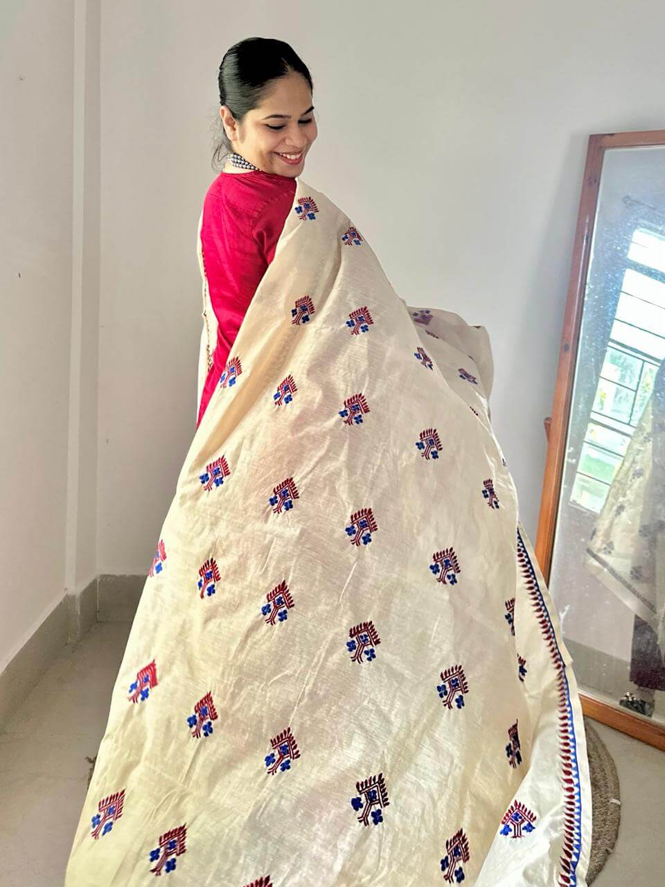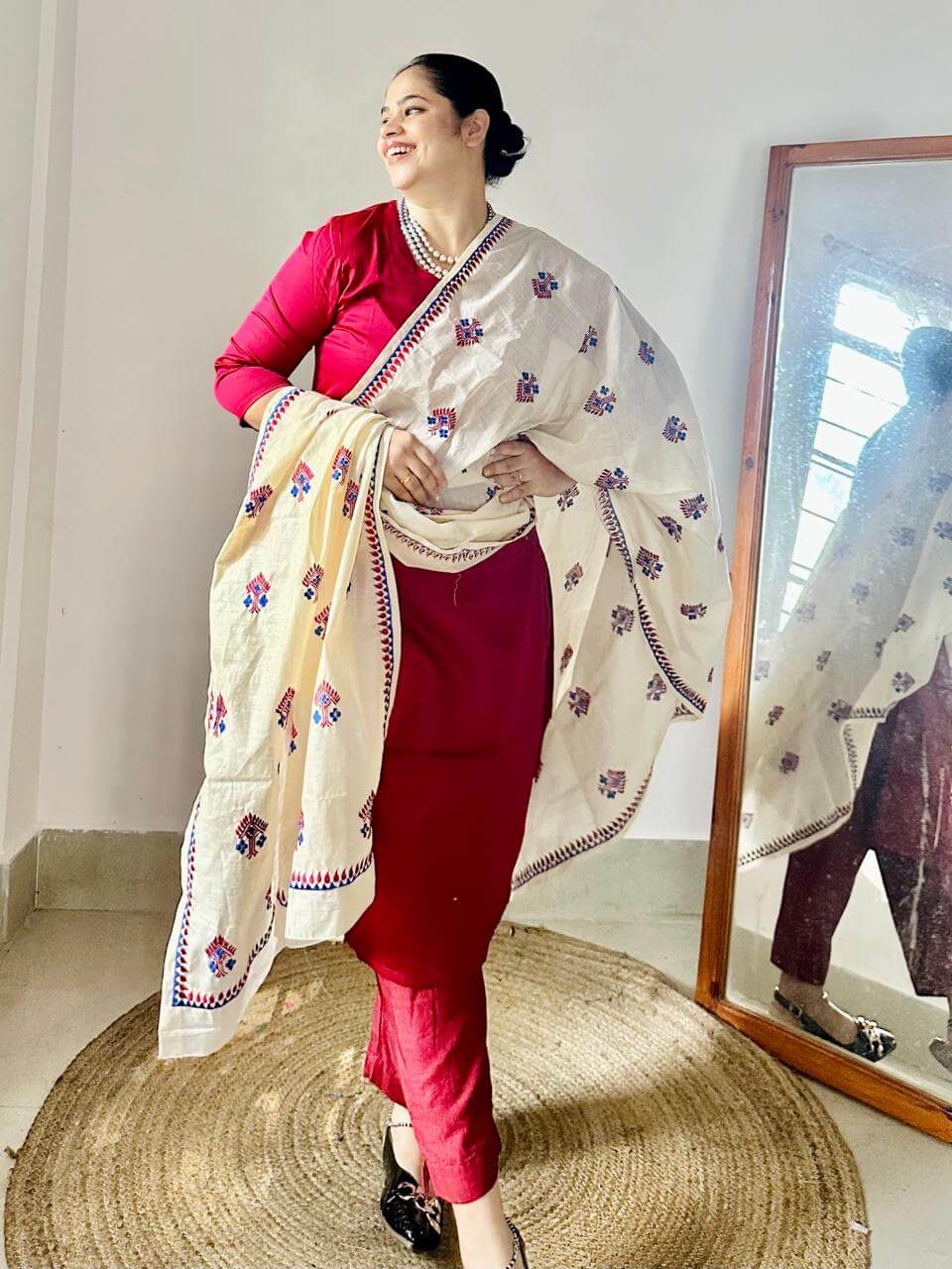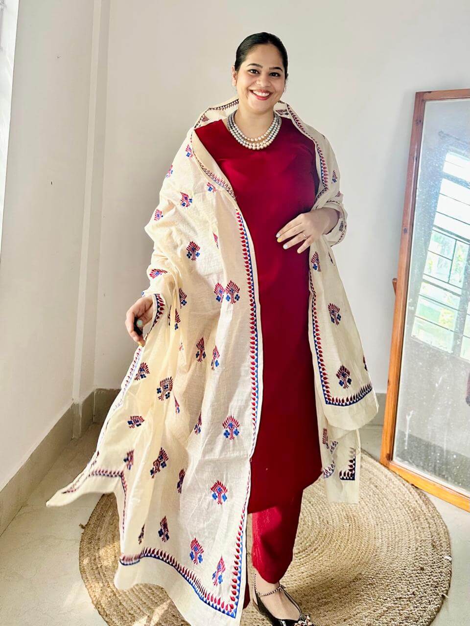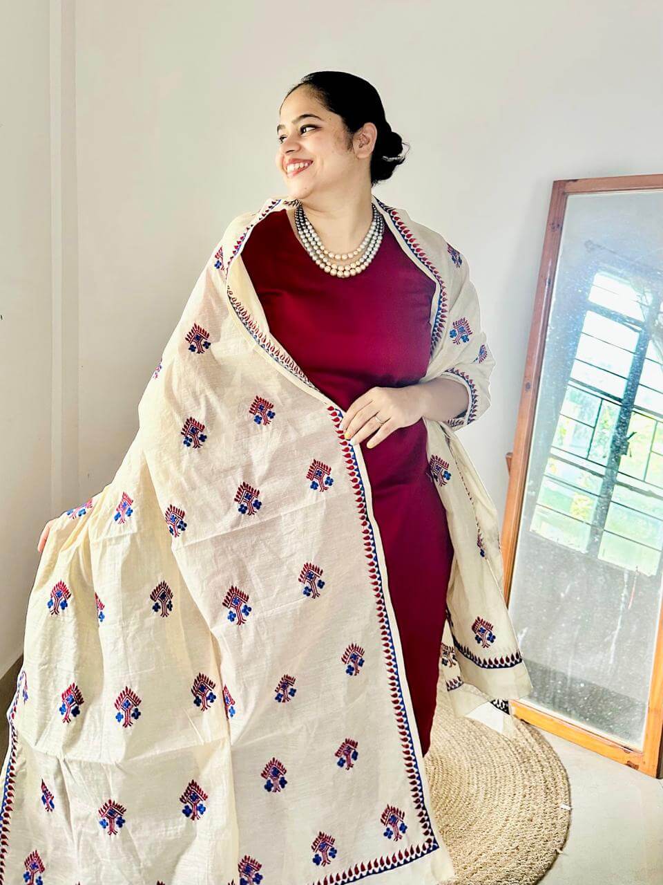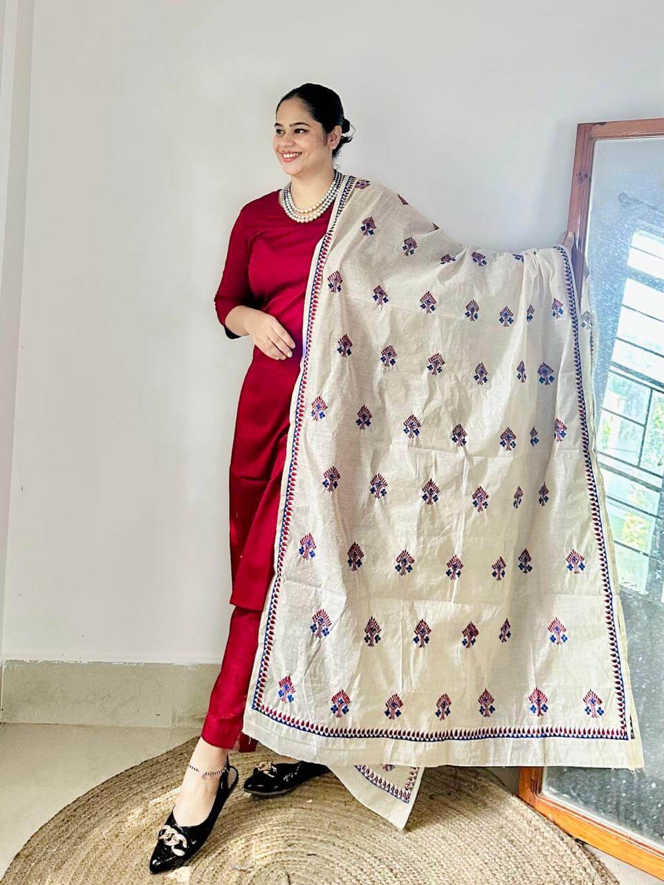 A silk-shine Banarasi cotton kurta paired with a pure cotton dupatta adorned in Assamese phulkari-inspired embroidery. Elegant, festive, and timeless! Pant not included.