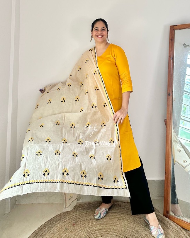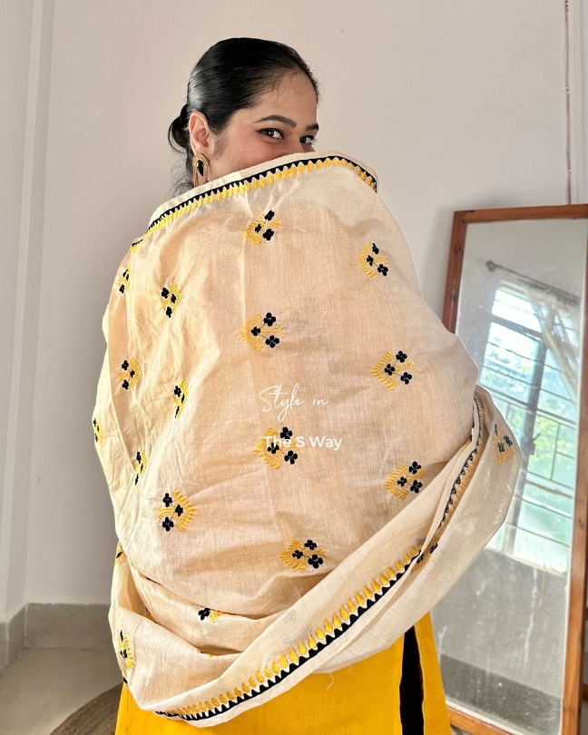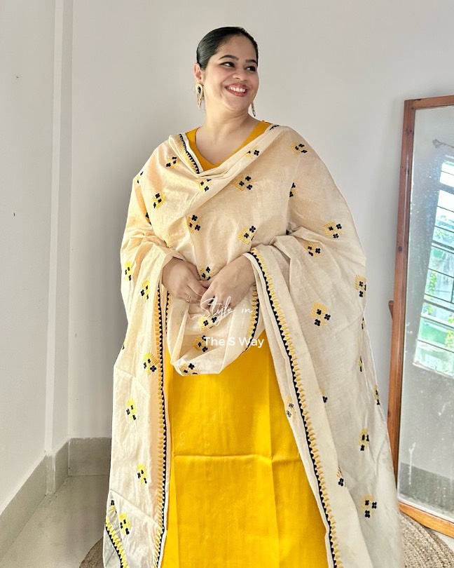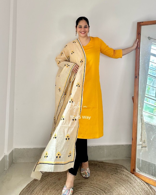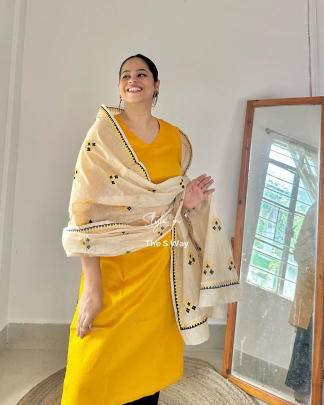 A silk-shine Banarasi cotton kurta paired with a pure cotton dupatta adorned in Assamese phulkari-inspired embroidery. Elegant, festive, and timeless! Pant not included.