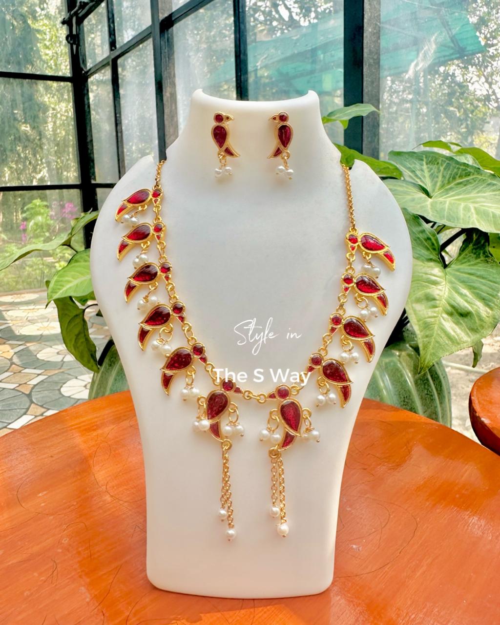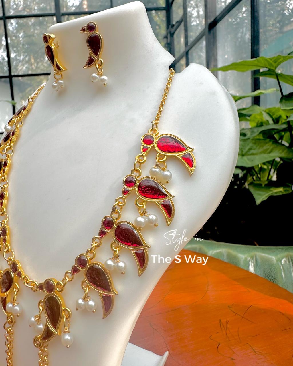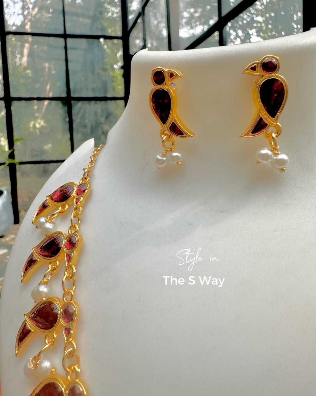 A heritage-inspired parrot motif necklace highlighted with delicate pearl accents. Designed to beautifully balance traditional craftsmanship with contemporary elegance, making it perfect for festive as well as modern styling.