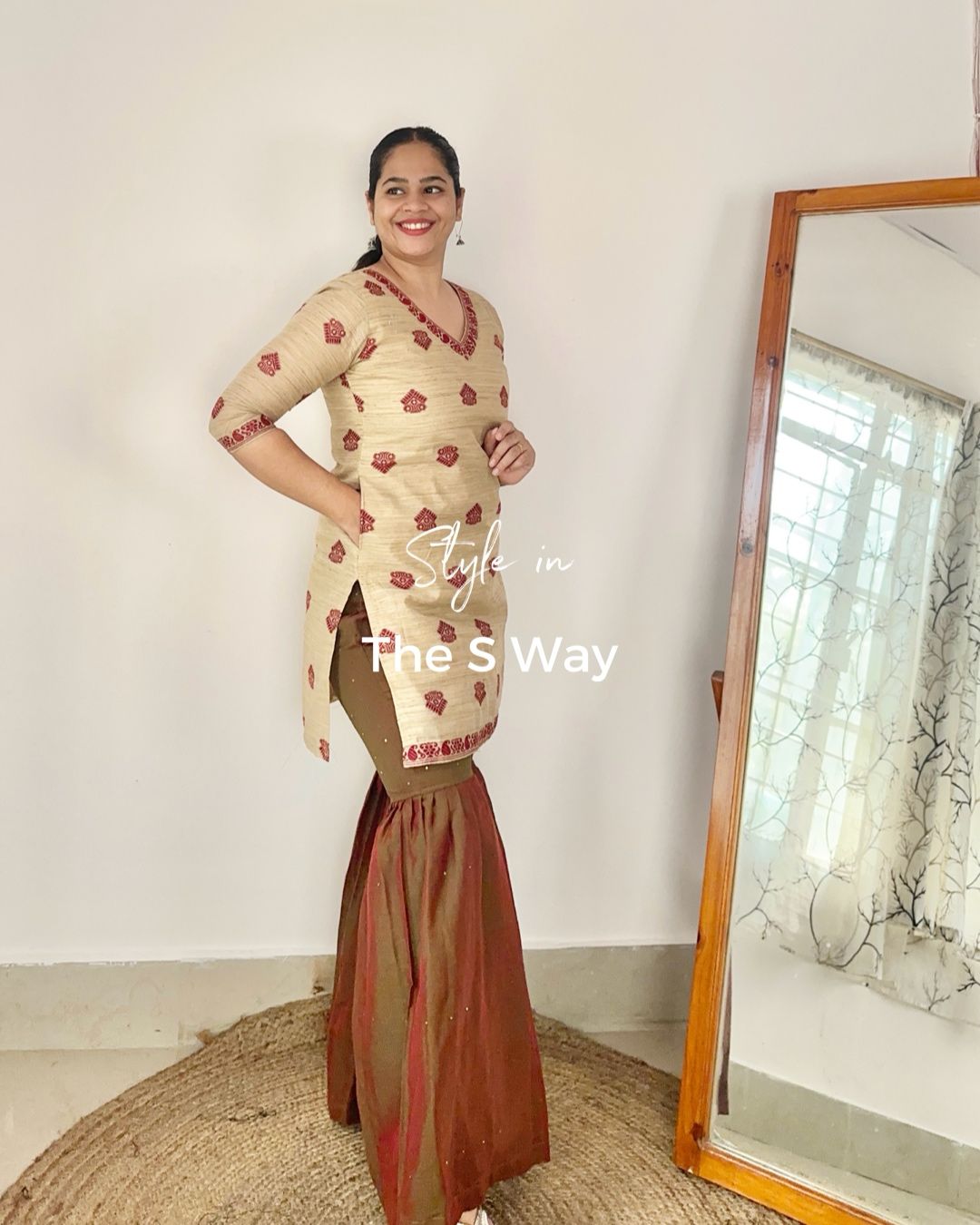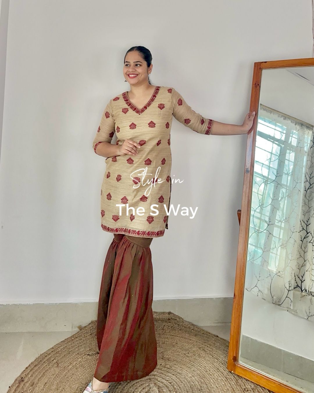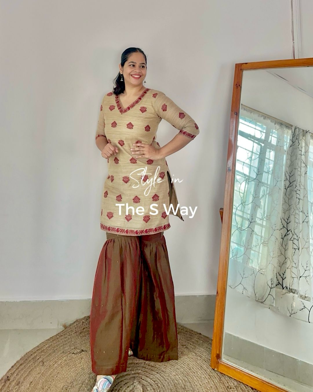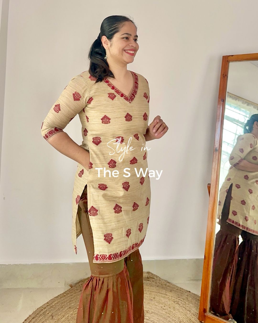 A maroonish red handloom sharara with green sequin work, paired with a ghisa short kurta featuring maroon goss motifs and a functional pocket. A perfect blend of style and tradition!