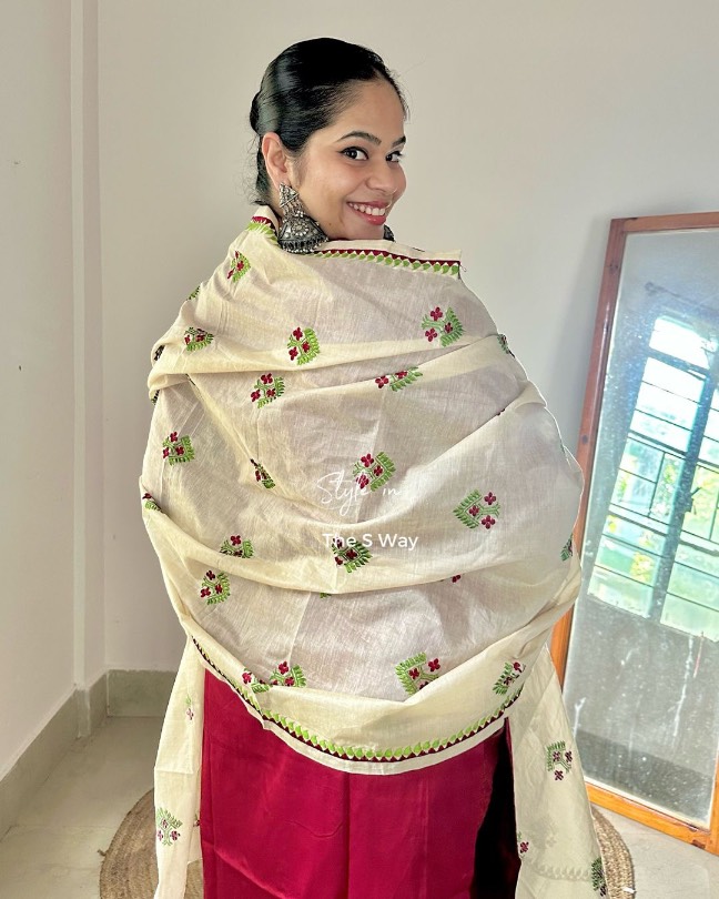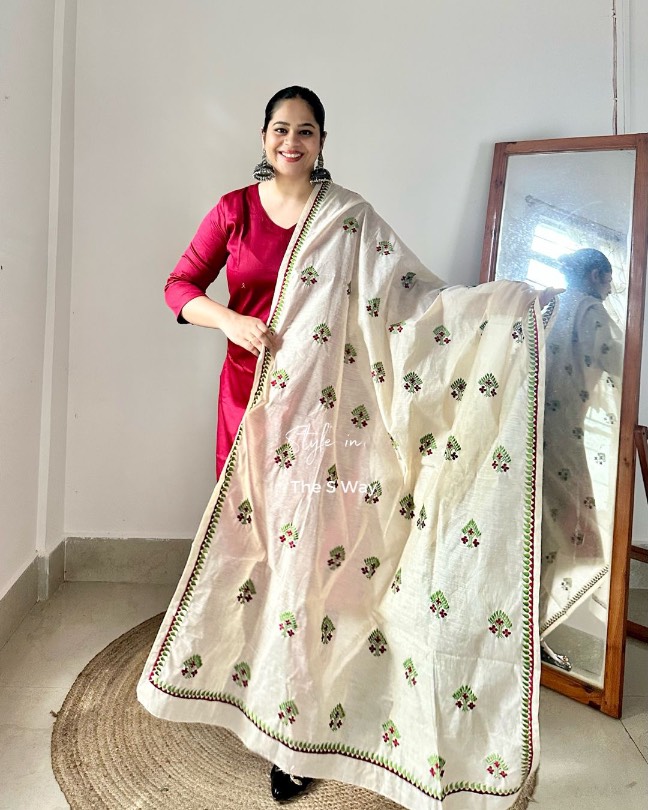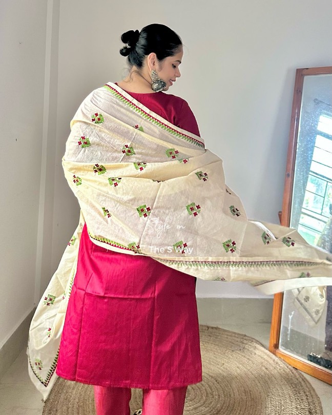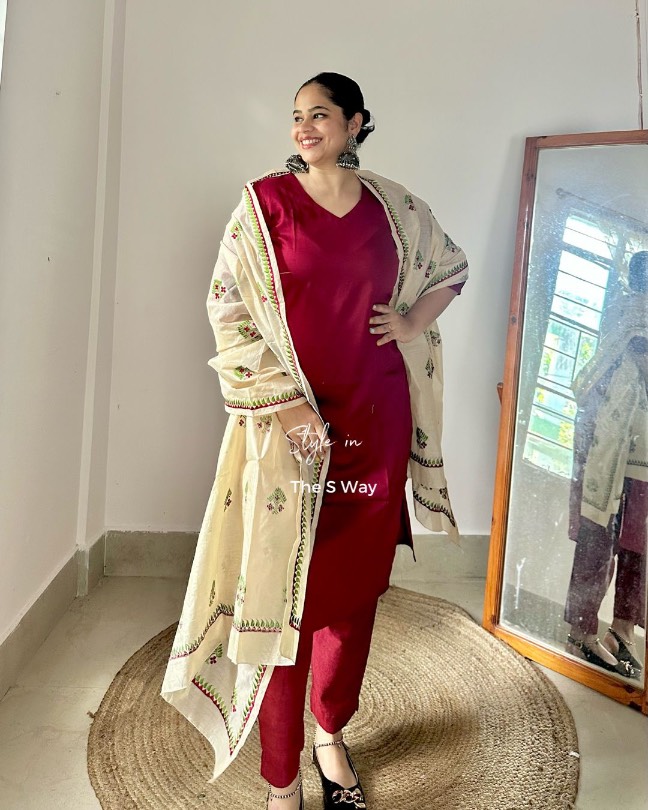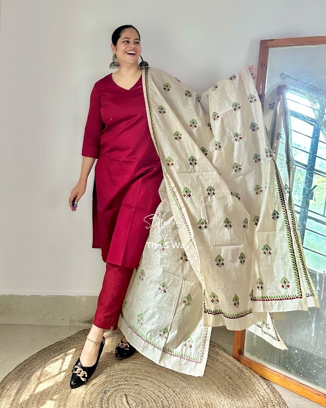 A striking Blue and Maroon Kurta with Dupatta Set, blending tradition with elegance. The kurta is crafted from Banarasi silk-woven cotton, offering a silk-like sheen with the comfort of cotton. Paired with a pure cotton dupatta, inspired by Phulkari-style Assamese embroidery, it features intricate traditional motifs that celebrate heritage craft. Pant not included.