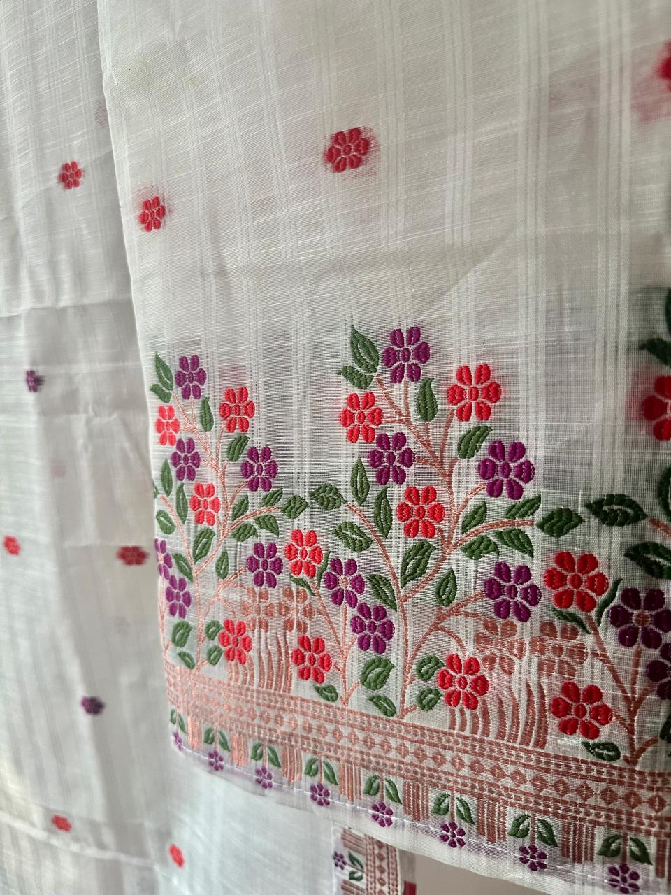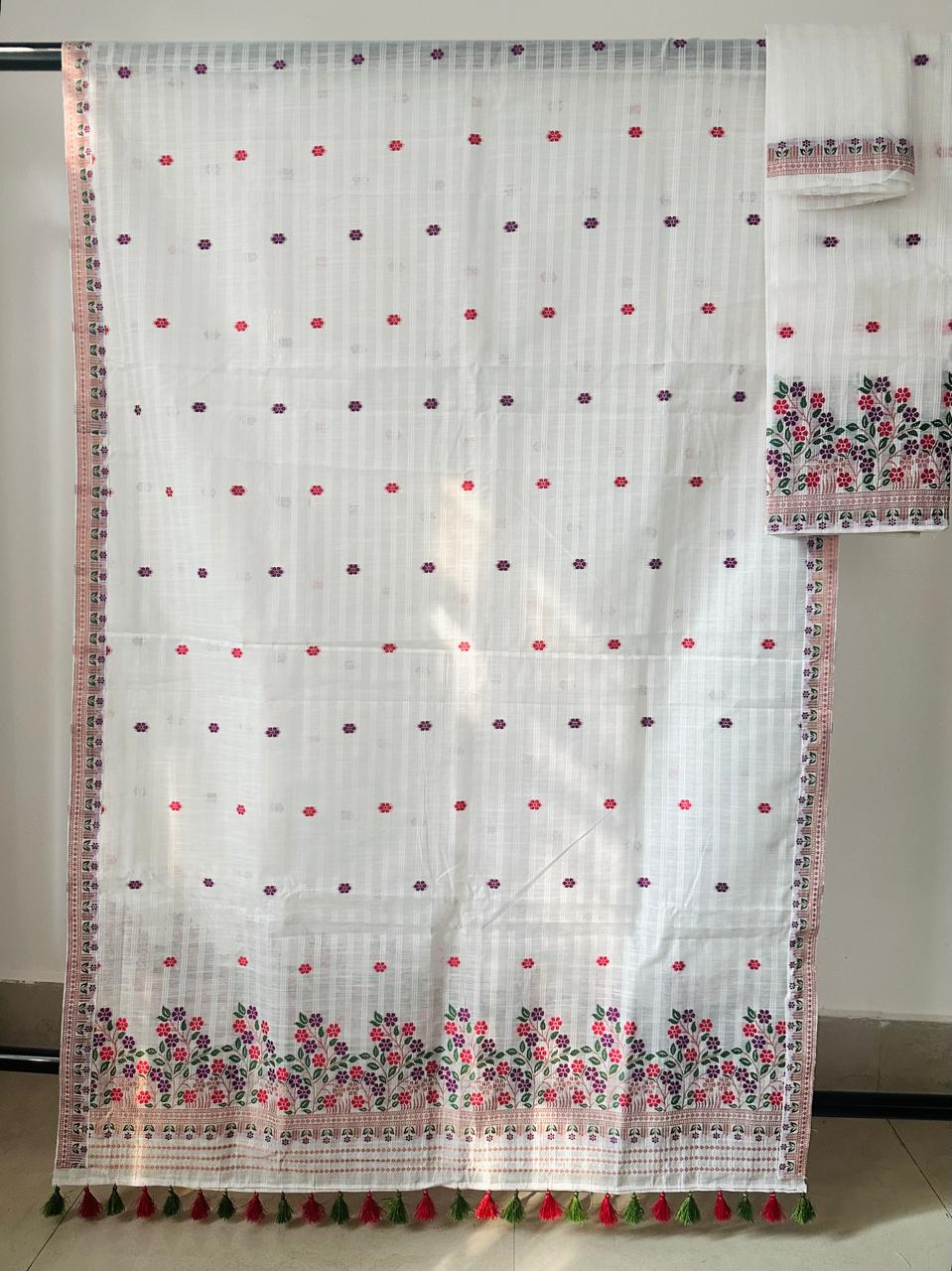 This premium Gari Cotton by Nuni woven set is accentuated with vibrant magenta, red, and green motifs, adding a rich pop of colour to its textured handloom weave. Designed for comfort and elegance, the fabric reflects refined craftsmanship. Ready to wear with an unstitched blouse piece, it is ideal for both office wear and special occasions.