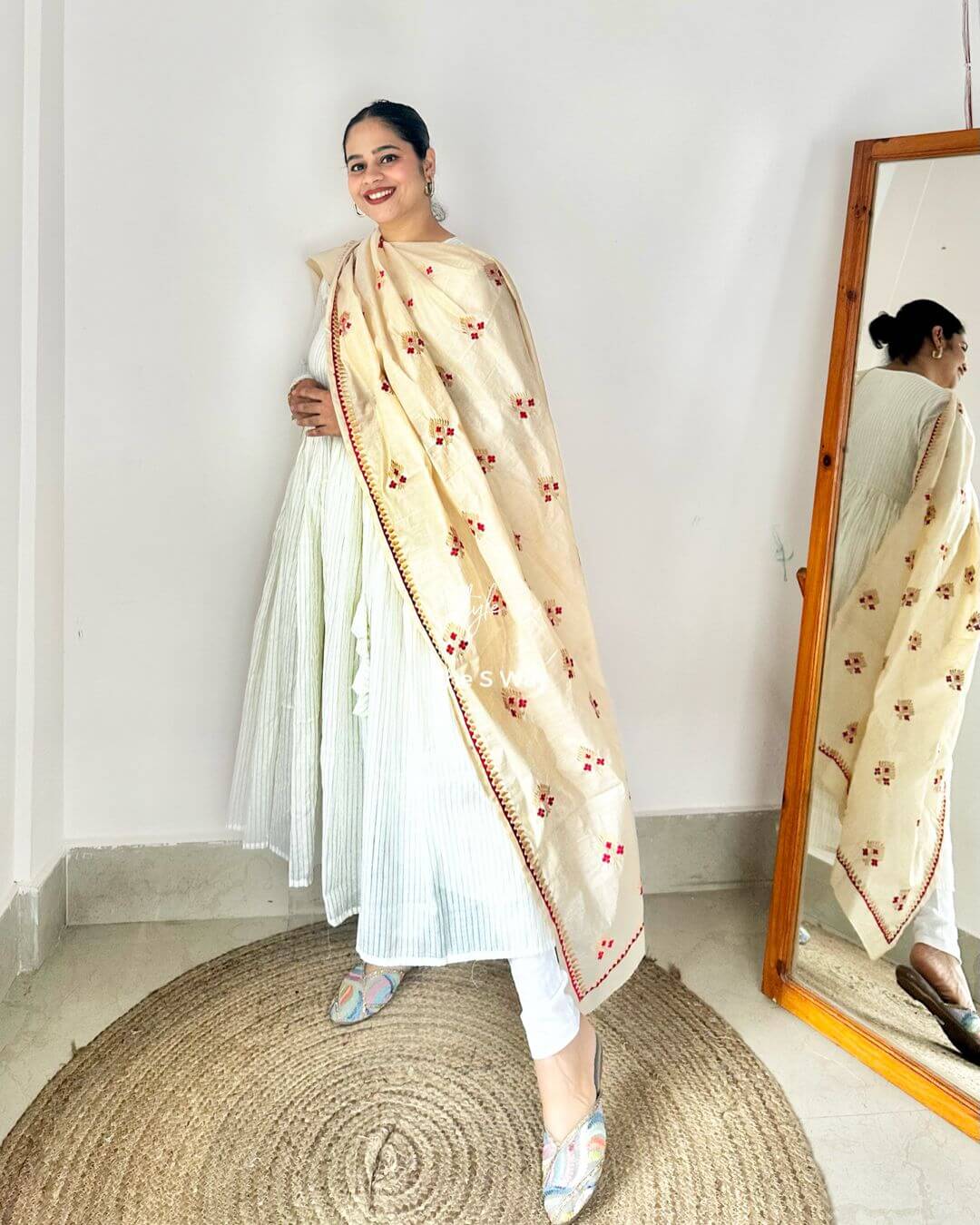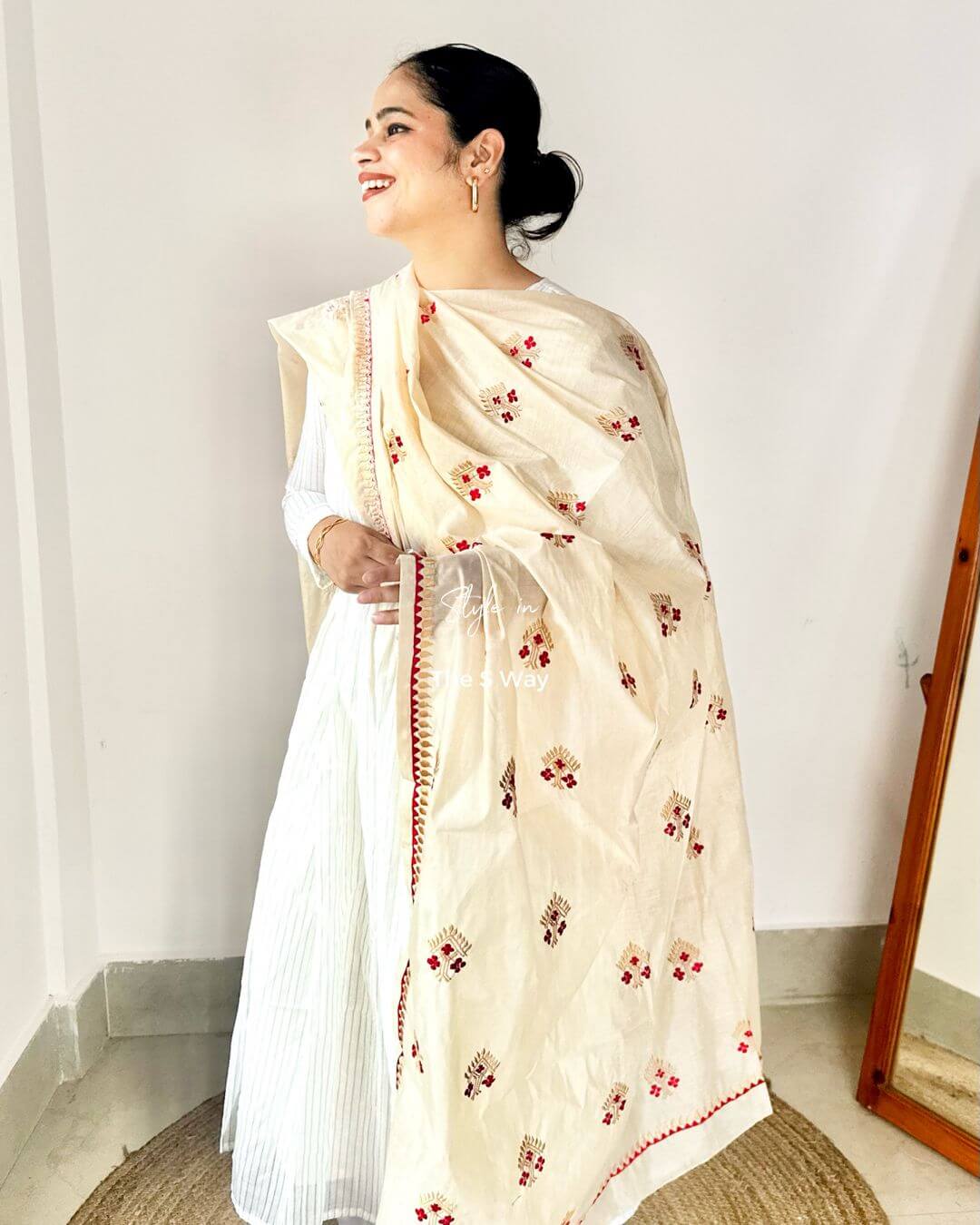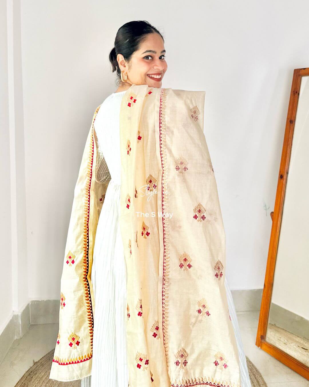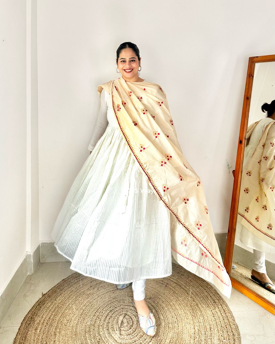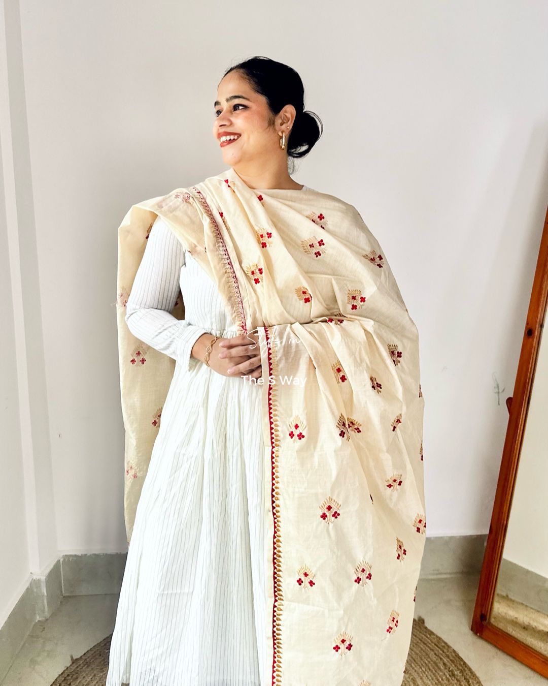 A truly grand and statement-making kurta dupatta set, this ensemble beautifully blends elegance with artisanal craftsmanship. The Anarkali kurta is crafted in soft handloom cotton, adorned with subtle golden zari stripes that lend a refined sheen without overpowering its grace. Paired with it is an exquisite dupatta in organic Tussar-by-cotton based fabric, featuring a rich sandalwood hue and intricately detailed “Goss” buta embroidery in red and sandalwood silk threads. Exclusive to The S Way, this dupatta draws inspiration from traditional Punjabi Phulkari craftsmanship, thoughtfully reinterpreted into the brand’s signature aesthetic. One-of-a-kind and timeless, this set is designed for occasions where you want to embody understated luxury with a distinctive edge