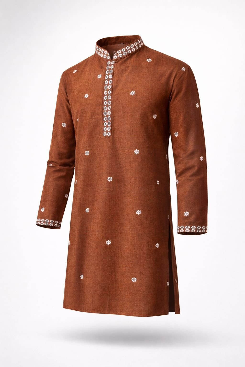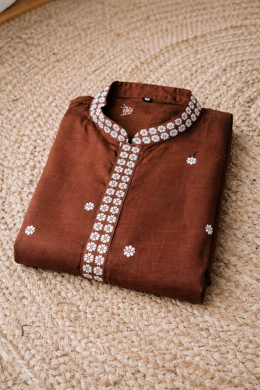 This men’s handloom reshmi cotton-by-cotton kurta is crafted in a lightweight, breathable fabric for all-day comfort. Designed in a rich cocoa brown base with crisp white motifs, the kurta offers a refined, earthy aesthetic rooted in handloom craftsmanship. A versatile piece suited for festive occasions as well as elevated everyday wear.