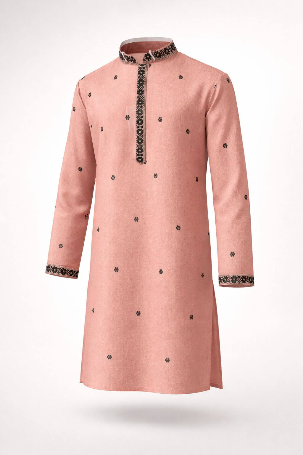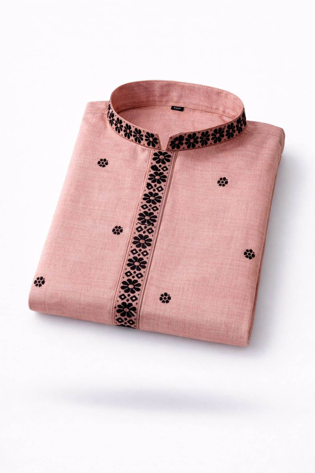 This men’s handloom reshmi cotton-by-cotton kurta is crafted in a lightweight, breezy fabric for effortless comfort. Featuring a soft dusty pink base with contrasting black motifs, the kurta balances subtle elegance with a contemporary edge. A refined handloom piece suitable for festive occasions as well as elevated everyday wear.