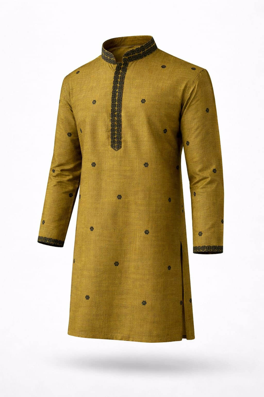 This men’s handloom reshmi cotton-by-cotton kurta is crafted in a lightweight, breathable fabric for all-day comfort. Featuring a yellowish olive (mehendi green) base with bold black motifs, the kurta carries a warm, earthy appeal with refined handloom detailing. Ideal for festive occasions as well as elevated everyday wear.
