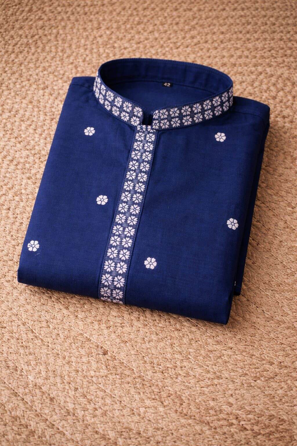 This handloom reshmi cotton-by-cotton kurta is crafted in a lightweight, breezy fabric, ideal for comfortable all-day wear. Featuring a rich royal blue base with white motifs, the kurta reflects refined handloom craftsmanship with a soft, airy feel.