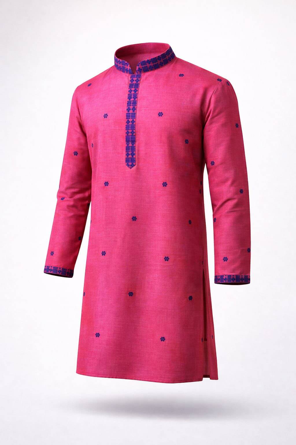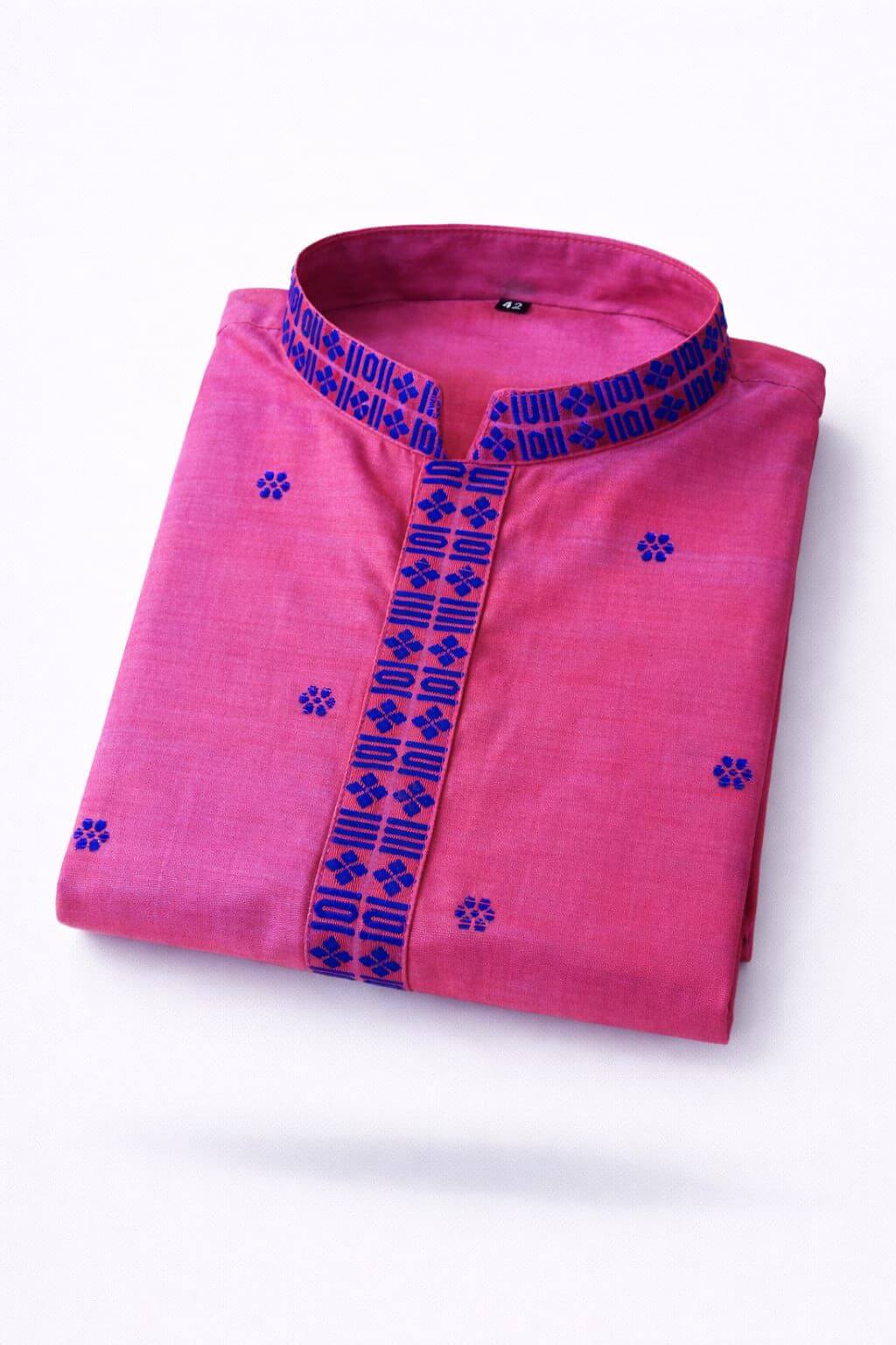 This men’s handloom reshmi cotton-by-cotton kurta is crafted in a lightweight, breathable fabric for all-day comfort. Featuring a soft pink base with striking royal blue motifs, the kurta blends classic handloom craftsmanship with a fresh, contemporary contrast. Ideal for festive occasions as well as refined everyday wear.