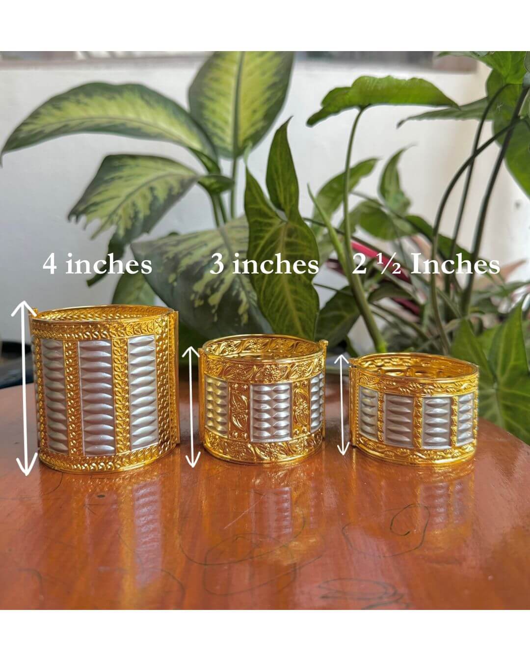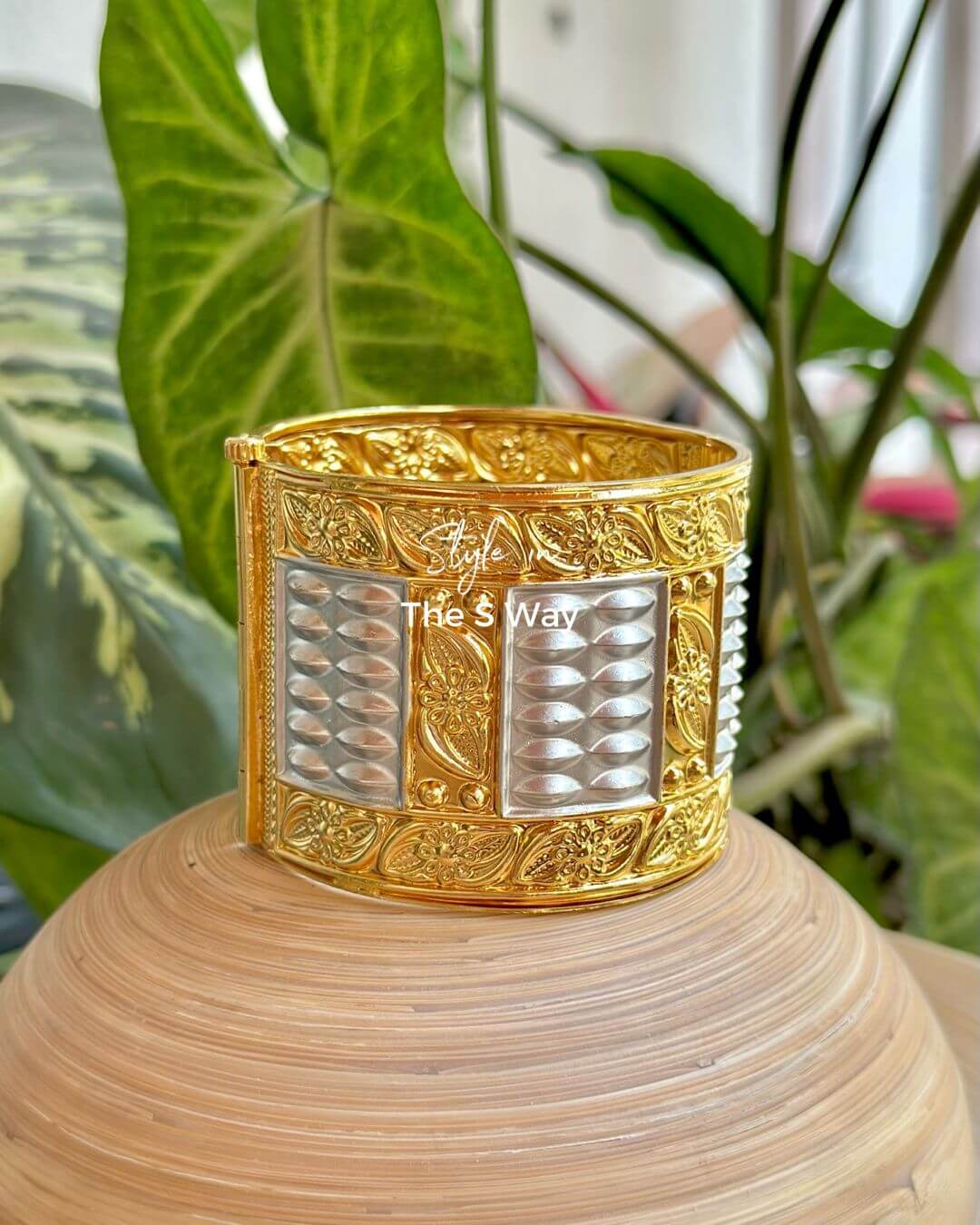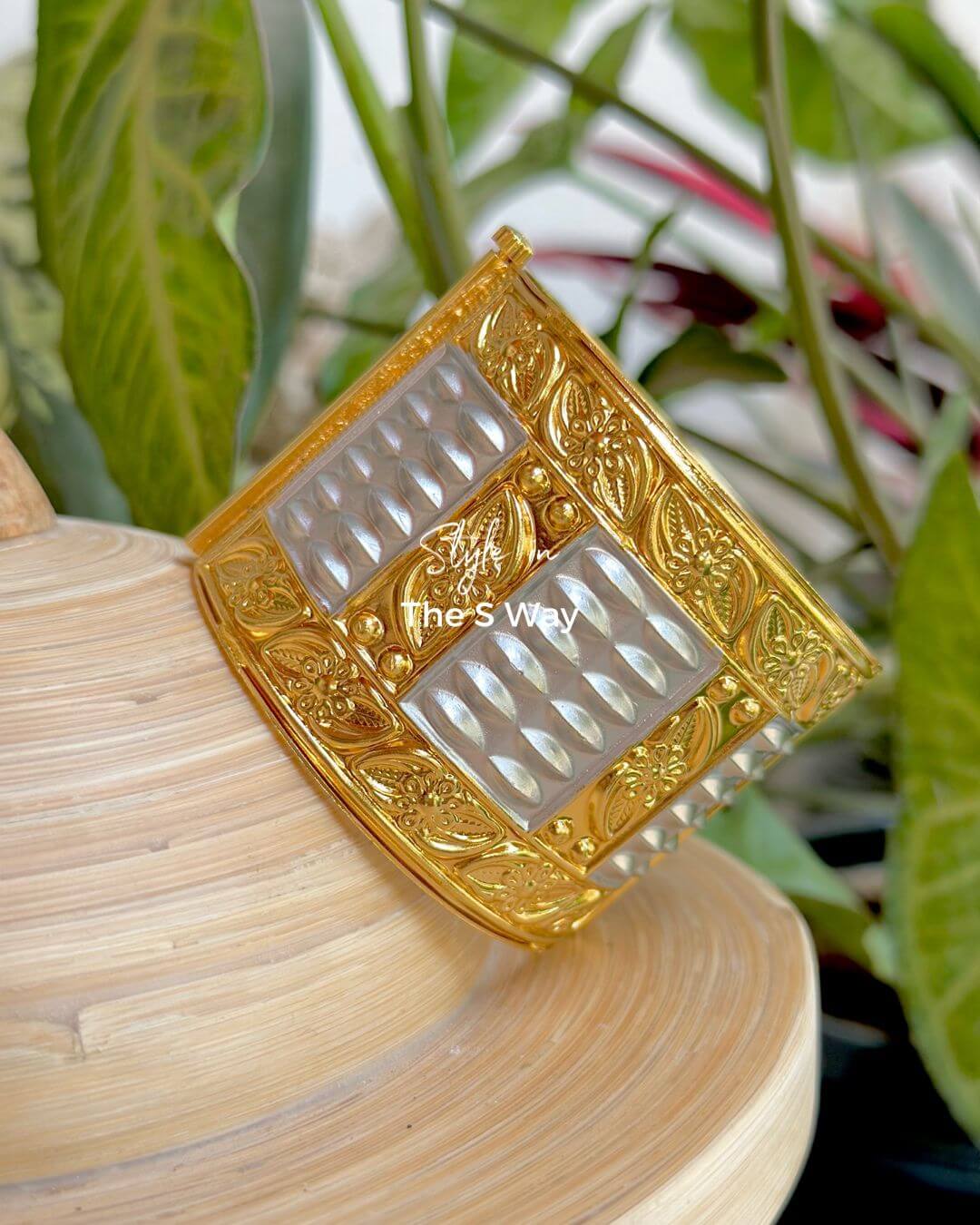 Crafted as part of our Bohag Bihu Demi-Fine Collection, this traditional Assamese metal cuff bracelet reflects timeless design with a refined contemporary finish. These are 4 inches, structured like a bangle with an openable side for ease of wear, it features intricate detailing of a traditional “Gaam Kharu” highlighted with silver on gold accents. Lightweight yet statement-making, this piece is designed to complement festive ensembles while celebrating the elegance of Assamese jewellery heritage. Free size from S to XL.