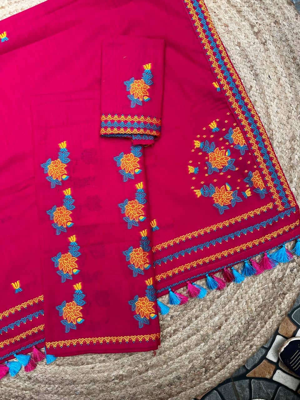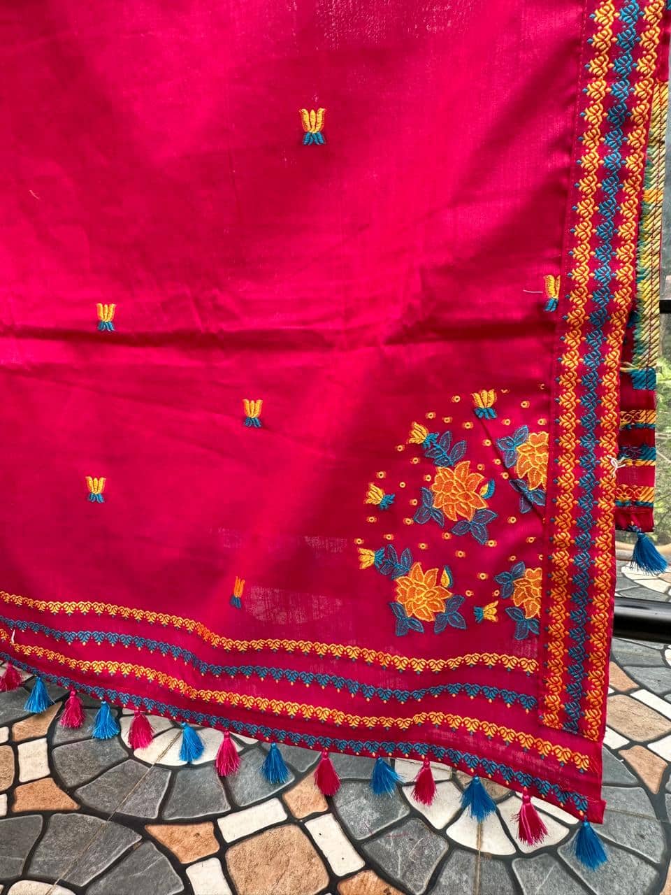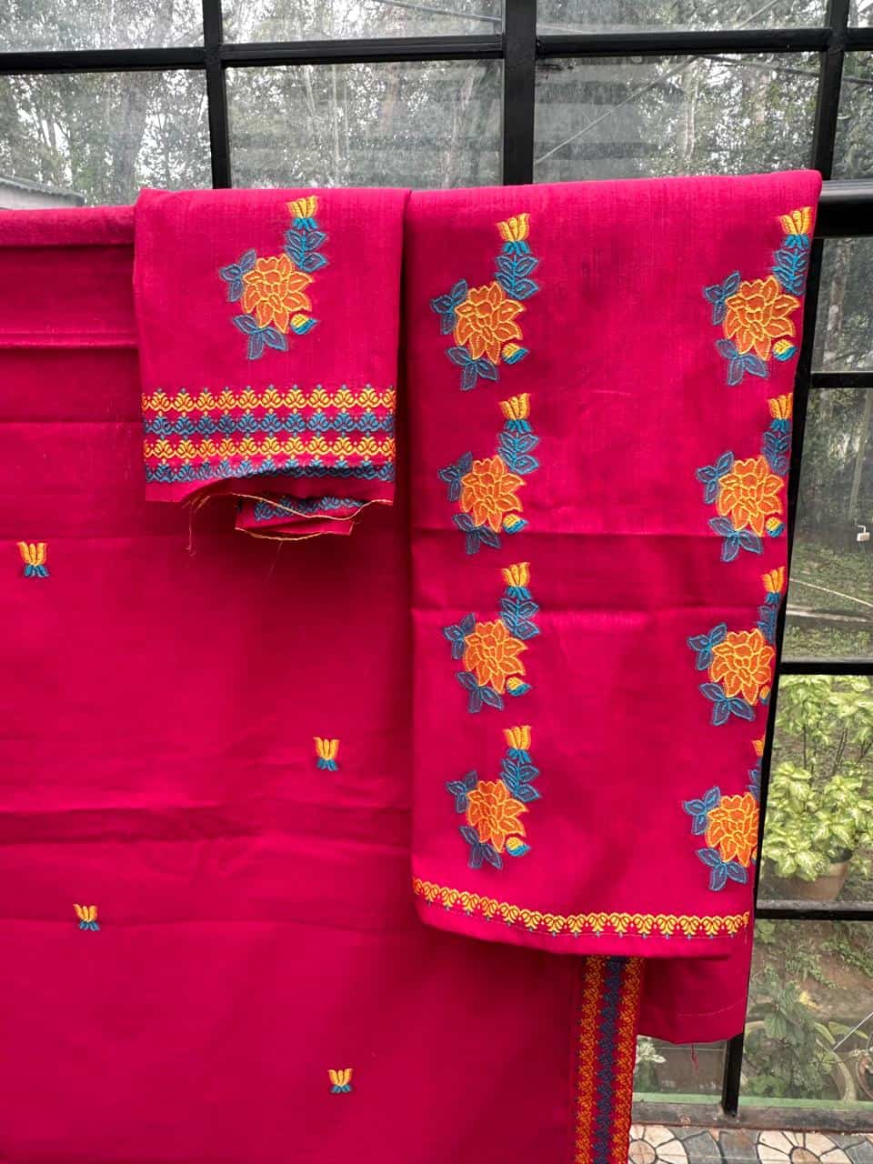Ready-to-wear mekhela sador crafted in soft, breathable cotton for effortless comfort and ease, this piece stands out with its unique and refreshing design. The mekhela features elegant rose vine motifs flowing vertically, creating a distinctive and graceful silhouette, while the blouse piece is thoughtfully designed with single floral motifs instead of traditional borders for a modern, minimal touch. Rendered in vibrant, special colors, it brings a lively yet refined appeal that is perfect for the spring and summer seasons. Light, comfortable, and visually striking, it comes with an attached unstitched blouse piece, making it a versatile choice for everyday wear, casual outings, or subtle festive moments.