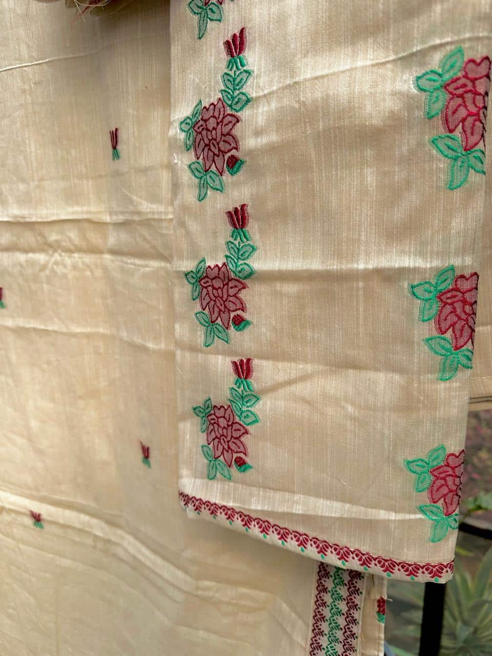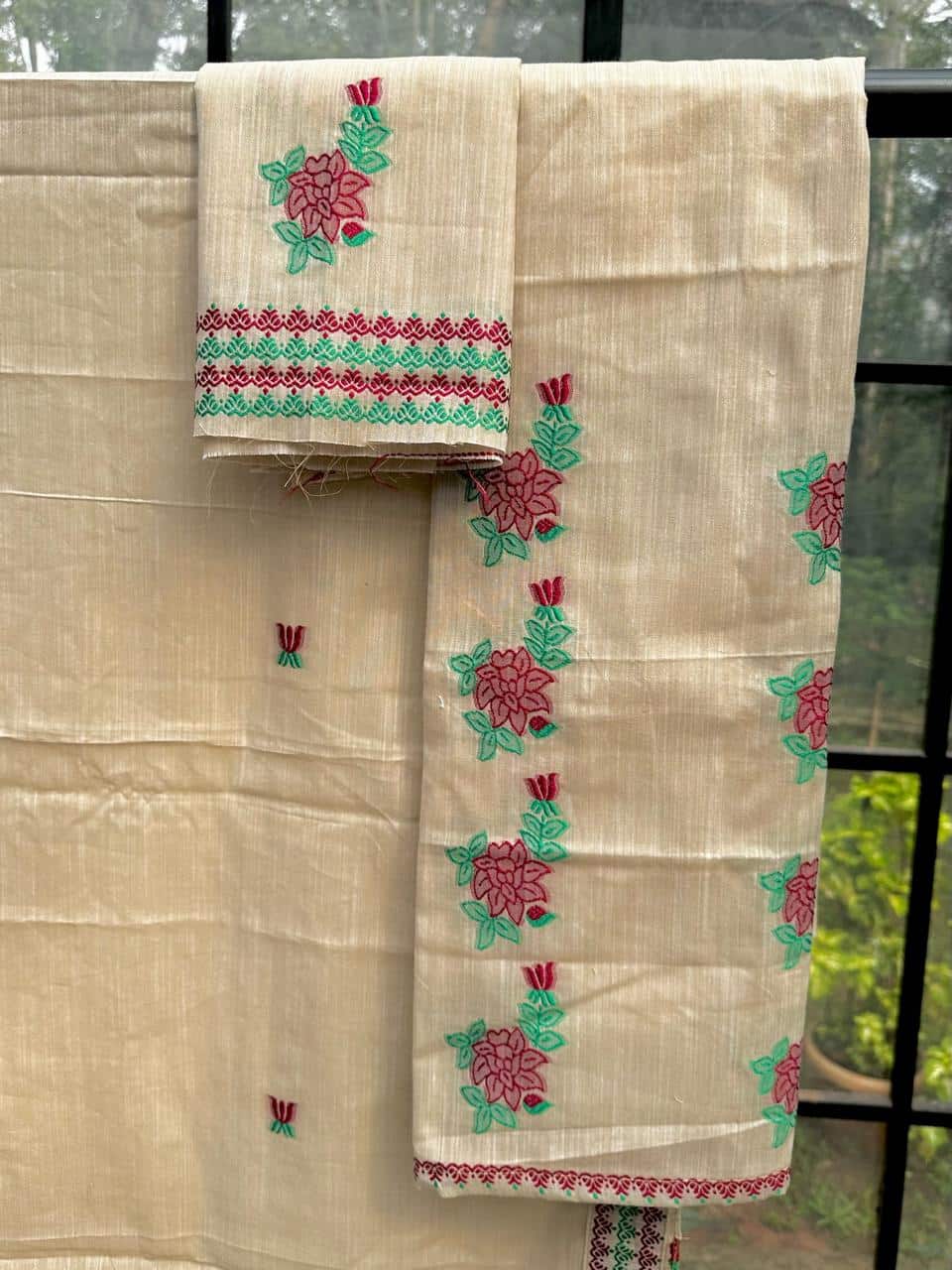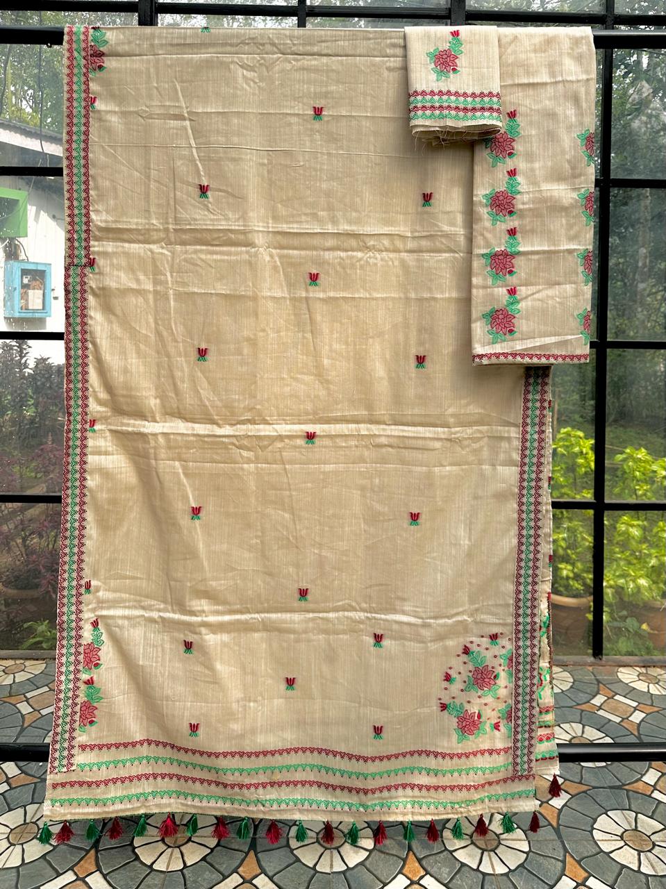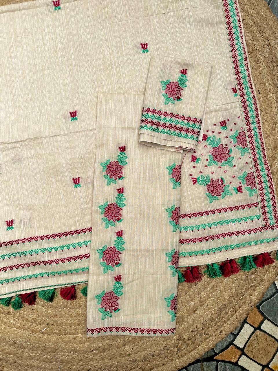 Ready-to-wear mekhela sador crafted in soft, breathable cotton for effortless comfort and ease, this piece stands out with its unique and refreshing design. The mekhela features elegant rose vine motifs flowing vertically, creating a distinctive and graceful silhouette, while the blouse piece is thoughtfully designed with single floral motifs instead of traditional borders for a modern, minimal touch. Rendered in vibrant, special colors, it brings a lively yet refined appeal that is perfect for the spring and summer seasons. Light, comfortable, and visually striking, it comes with an attached unstitched blouse piece, making it a versatile choice for everyday wear, casual outings, or subtle festive moments.