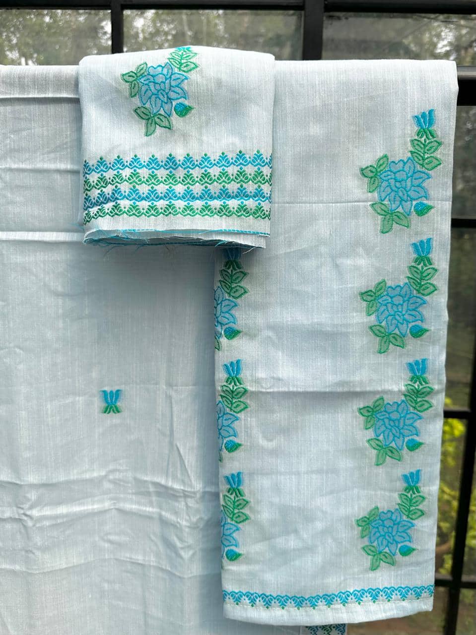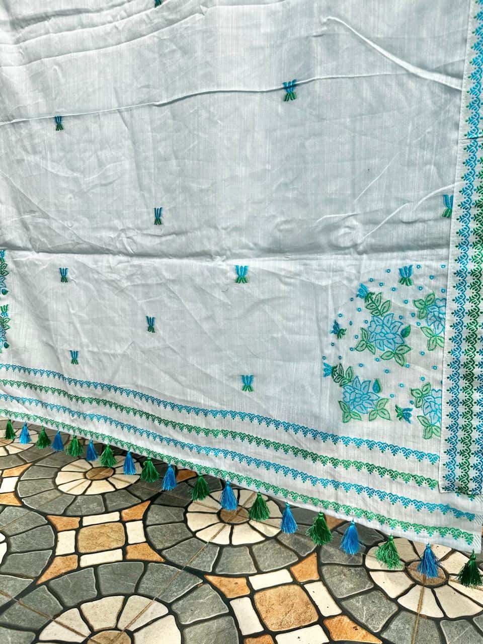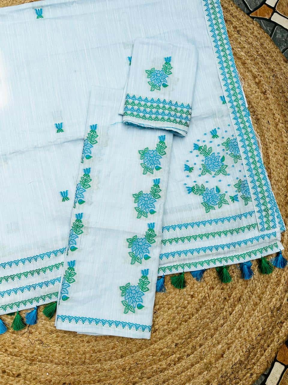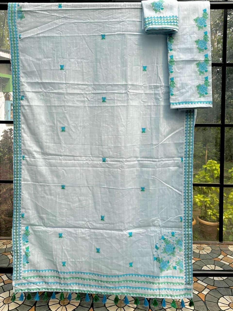 Ready-to-wear mekhela sador crafted in soft, breathable cotton for effortless comfort and ease, this piece stands out with its unique and refreshing design. The mekhela features elegant rose vine motifs flowing vertically, creating a distinctive and graceful silhouette, while the blouse piece is thoughtfully designed with single floral motifs instead of traditional borders for a modern, minimal touch. Rendered in vibrant, special colors, it brings a lively yet refined appeal that is perfect for the spring and summer seasons. Light, comfortable, and visually striking, it comes with an attached unstitched blouse piece, making it a versatile choice for everyday wear, casual outings, or subtle festive moments.