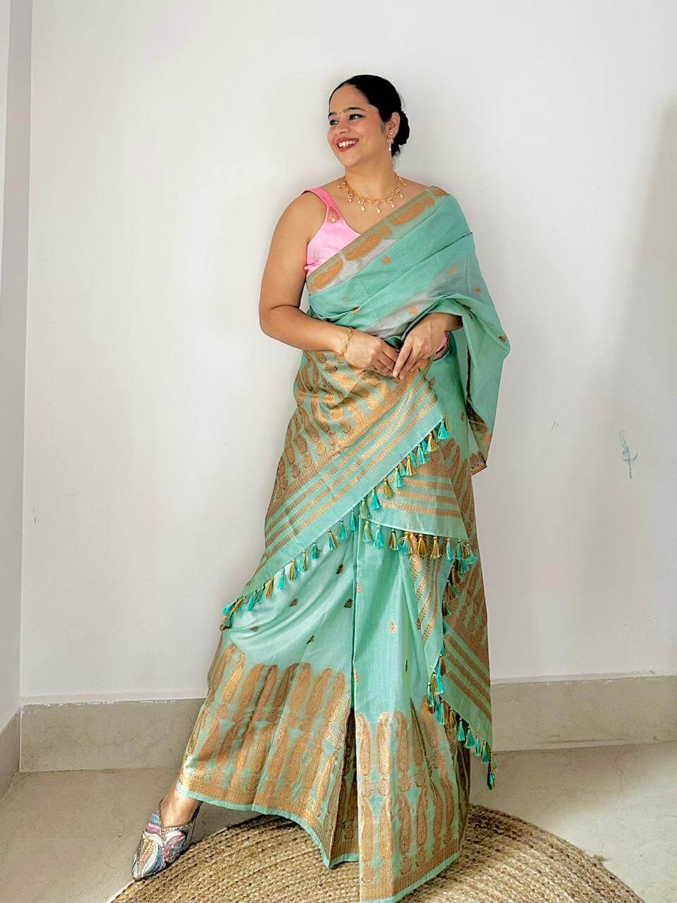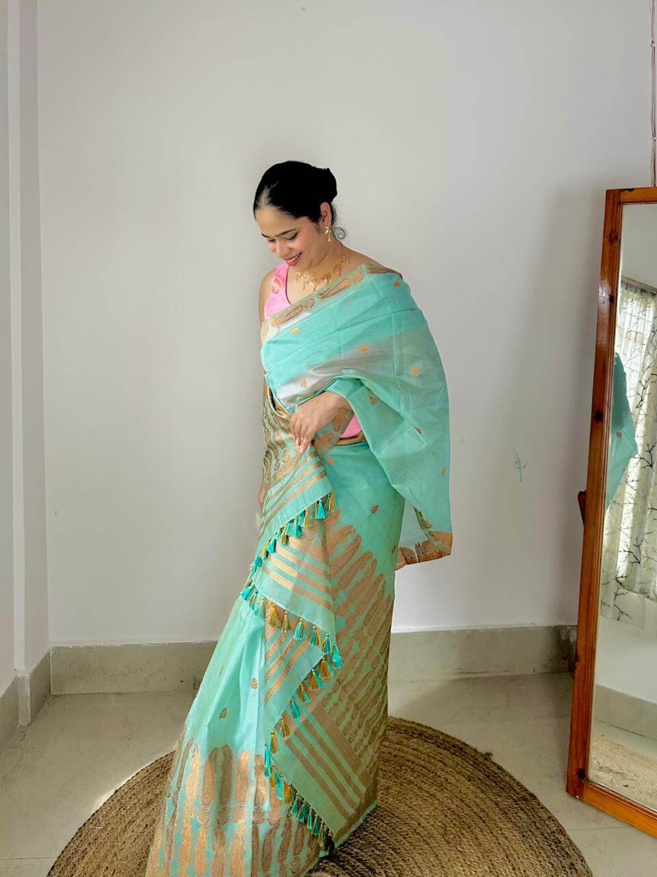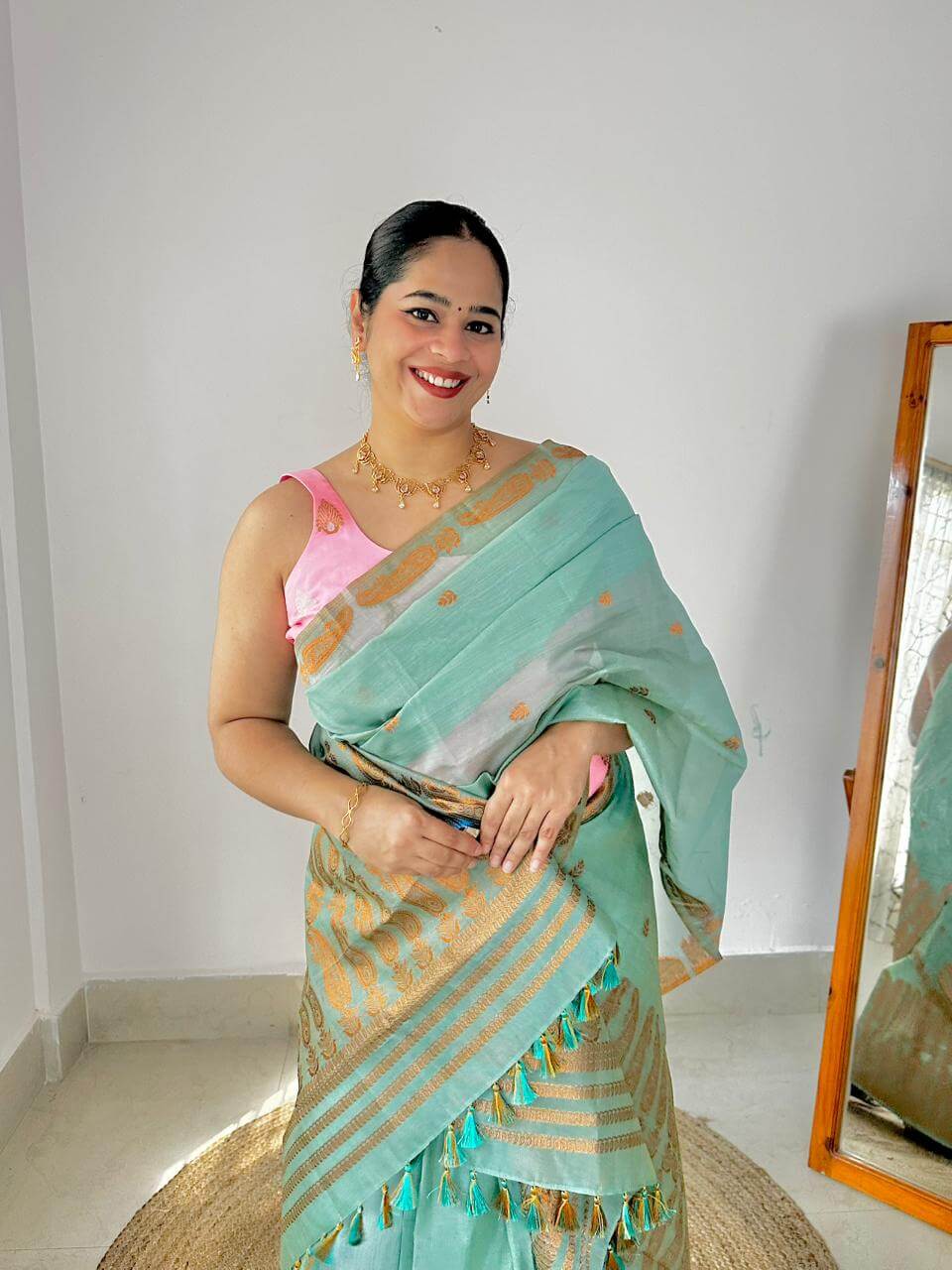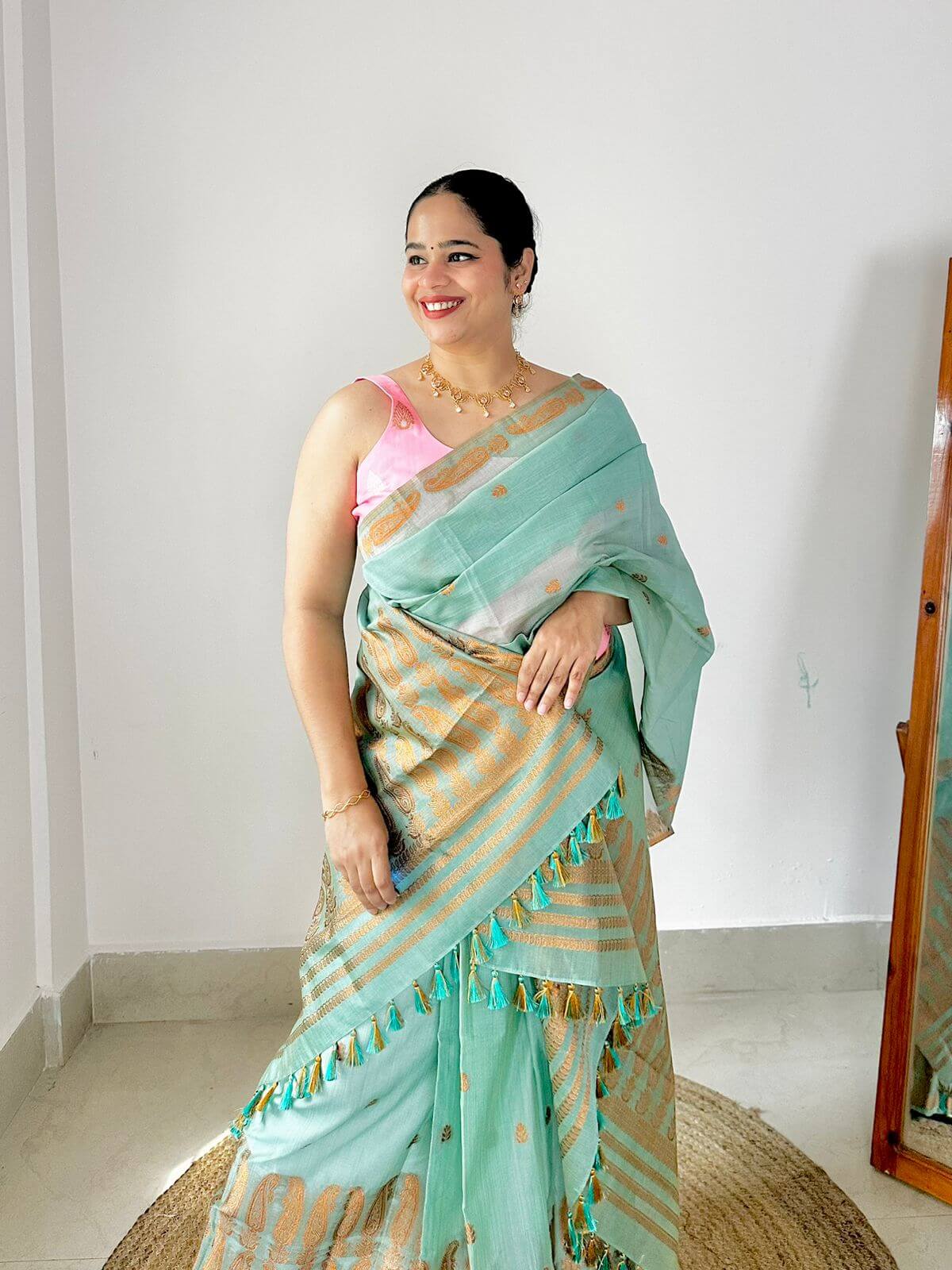 This is our gorgeous Ready to Wear set. Our Khadi Cotton & Bafta Tussar Mekhela Sador combines the textured look of Tussar silk with the soft feel and fall of Kesapaat. Woven in a mint green hue, it features intricate copper Zari motifs and side borders on the Sador, adding a touch of elegance. The blouse piece included is unstitched. Despite its rich, grand appeal, it remains light on the pocket, making it a perfect blend of luxury and affordability.