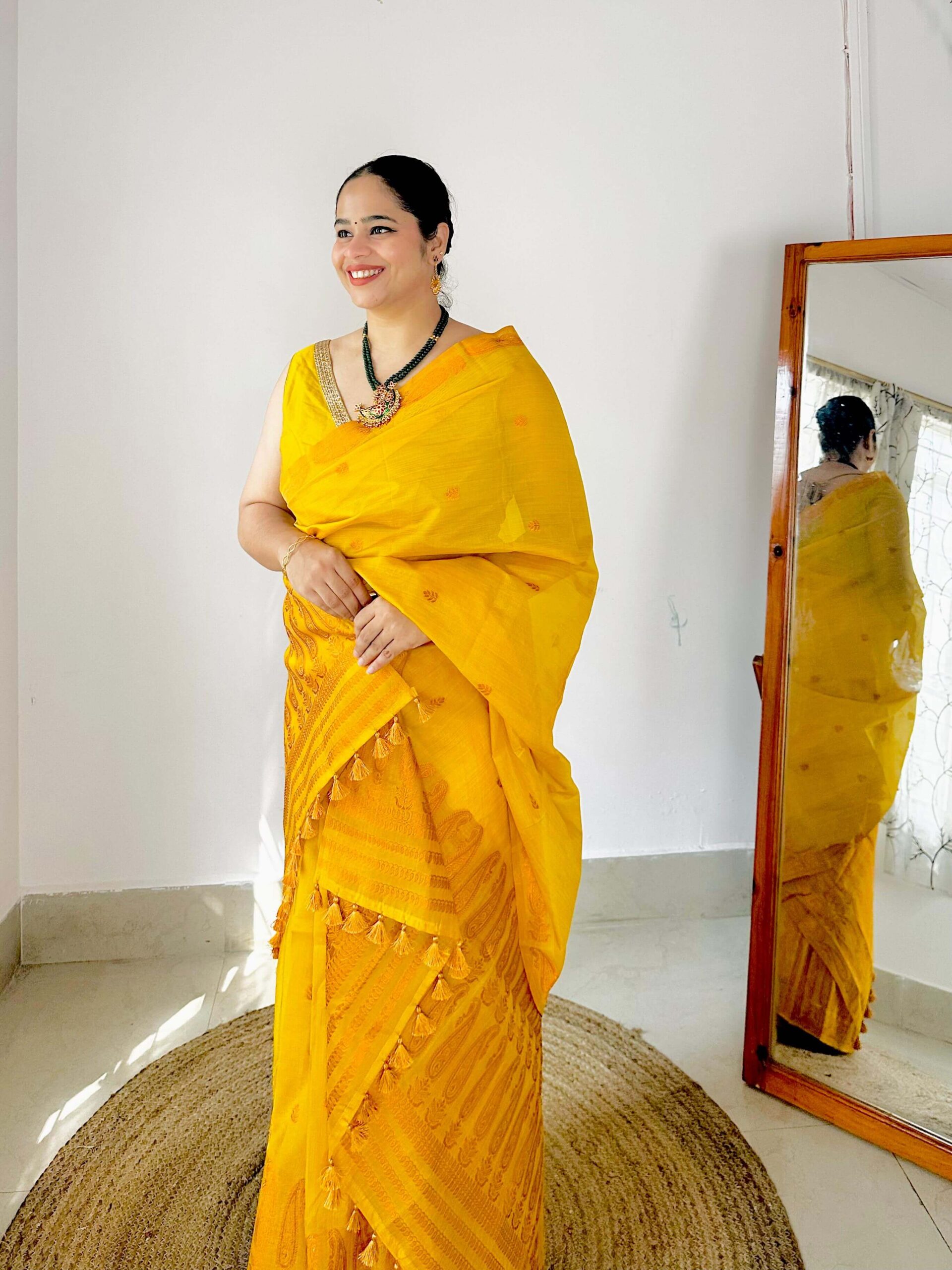 This is our gorgeous Ready to Wear set. Our Khadi Cotton & Bafta Tussar Mekhela Sador combines the textured look of Tussar silk with the soft feel and fall of Kesapaat. Woven in a mustard yellow hue, it features intricate copper Zari motifs and side borders on the Sador, adding a touch of elegance. The blouse piece included is unstitched. Despite its rich, grand appeal, it remains light on the pocket, making it a perfect blend of luxury and affordability.