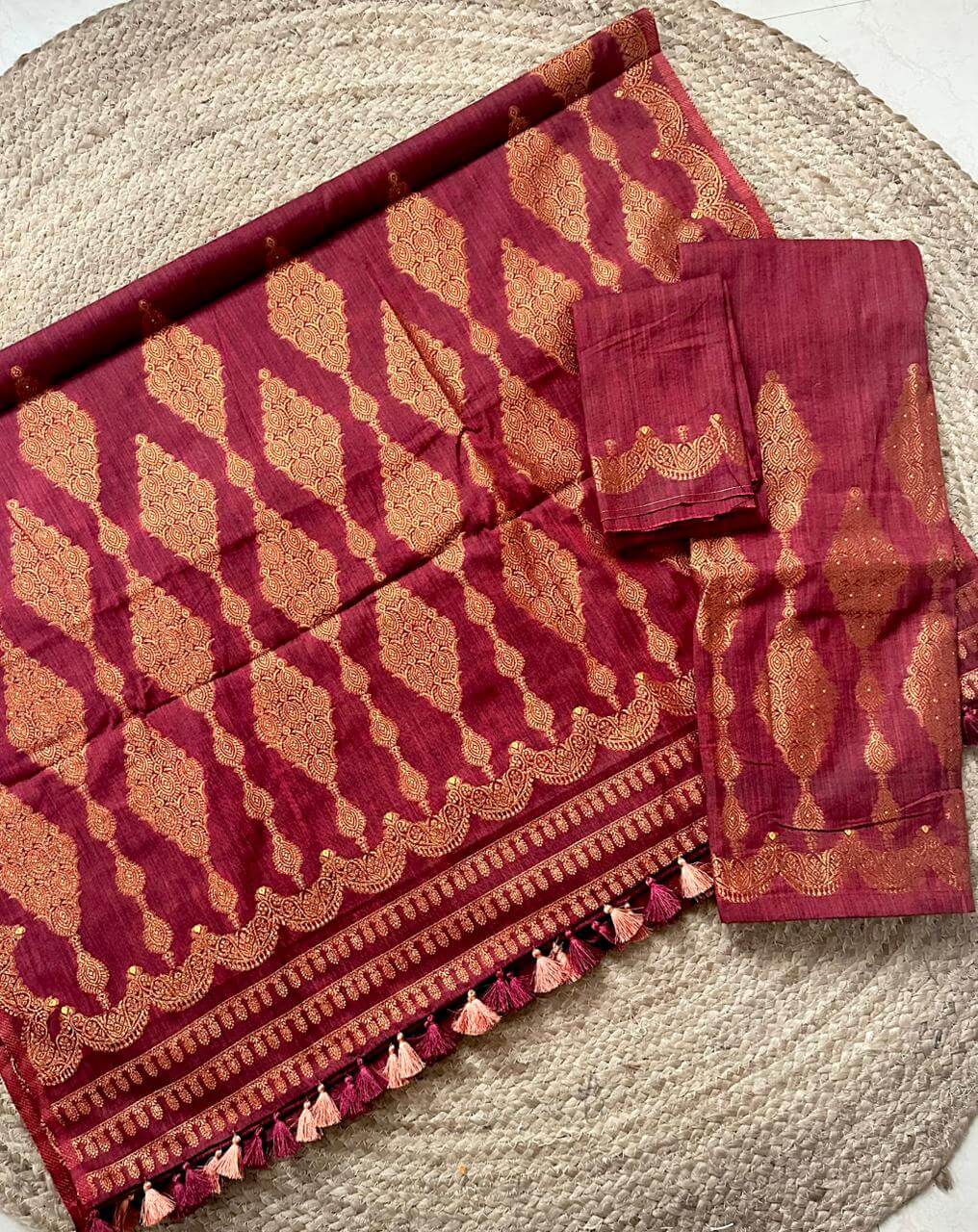 A ready-to-wear cotton ensemble designed for effortless elegance, this piece stands out with its distinctive Jonbiri-inspired motif, echoing the beauty of traditional Assamese jewellery. Rarely seen in contemporary designs, this unique detailing adds a refined cultural touch while maintaining a clean, wearable aesthetic. Crafted in breathable cotton, motifs have a copper zari inspired look which gives it a luxe appearance while being light on pocket. Comes with an unstitched blouse piece.