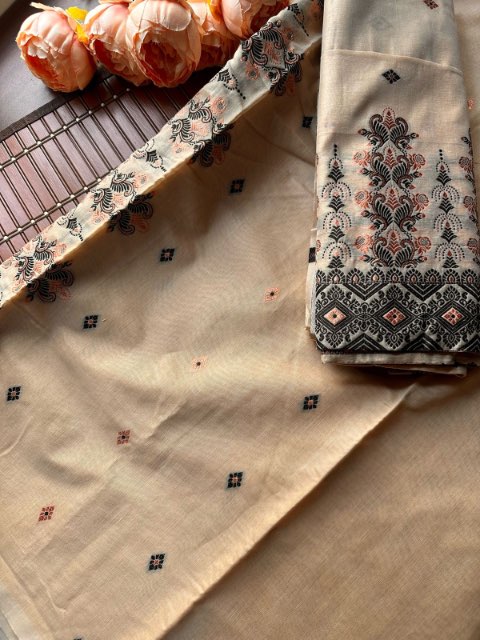 Celebrate Bihu in timeless elegance with this stunning muga colour cotton Mekhela Sador. Adorned with intricate Lota Phool motifs on the border and delicate Bargi Buta across the body in black/golden, it beautifully blends tradition with vibrance. This unstitched set includes the Sador, Mekhela, and blouse piece—perfect for festive celebrations with a touch of Assamese heritage.