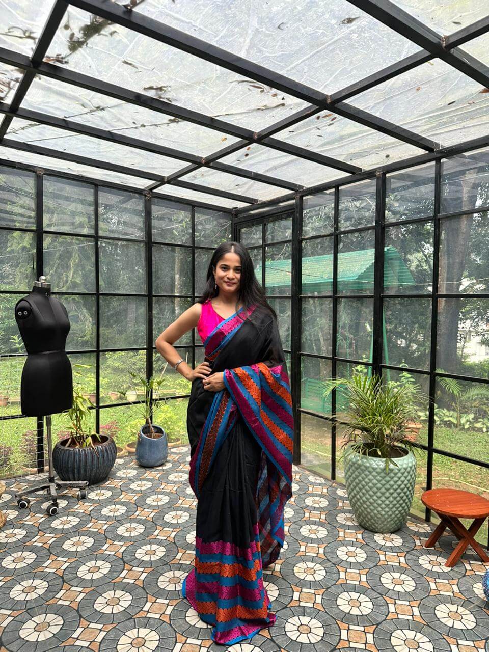 This Handloom Khadi Cotton Black Saree features a vibrant handwoven border that adds a striking contrast to its classic base. Measuring 5 meters, it comes with an 80 cm blouse piece attached. A timeless blend of elegance and craftsmanship.