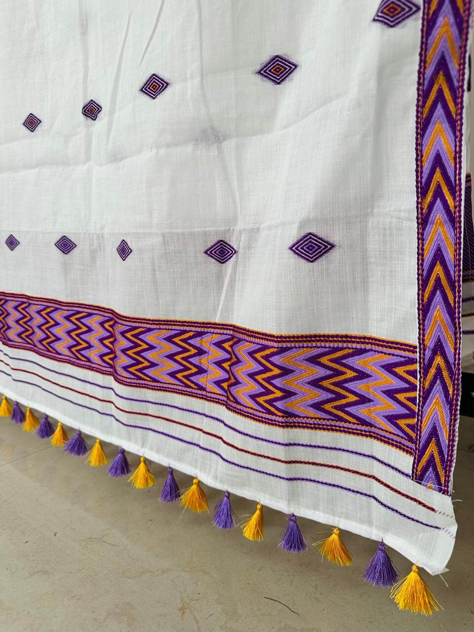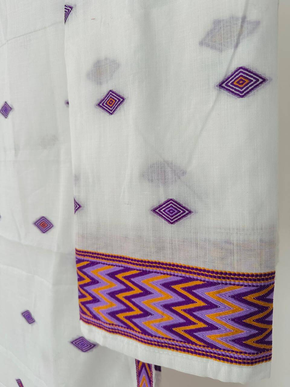 Our premium cotton ready-to-wear Mekhla Sador features a simple, elegant design, thoughtfully created for modern comfort without compromising heritage. Inspired by the vibrant cultures of the tribes of the region, it showcases striking multicoloured zigzag patterns and bold paari (borders) that add subtle character, while delicate Burfi Buta motifs are woven gracefully all over the body. The mekhla comes pre-stitched for effortless wear, paired with a ready-to-drape sador for a polished look within minutes, and includes a matching unstitched blouse piece so you can tailor it to your perfect fit.