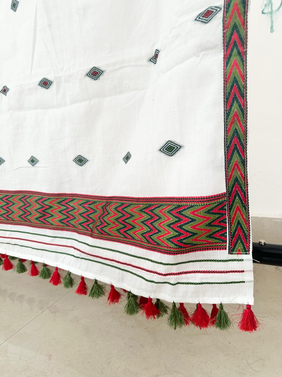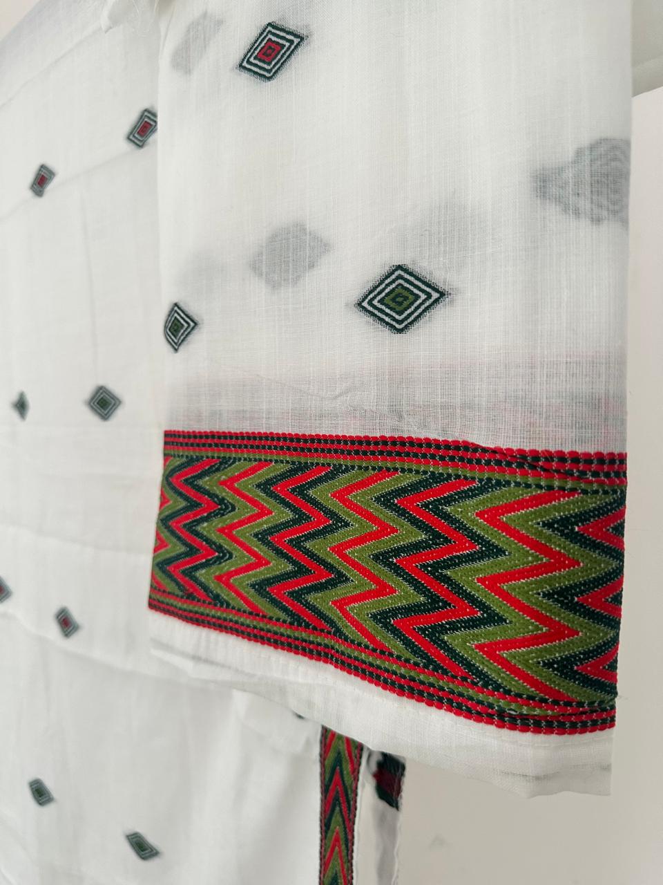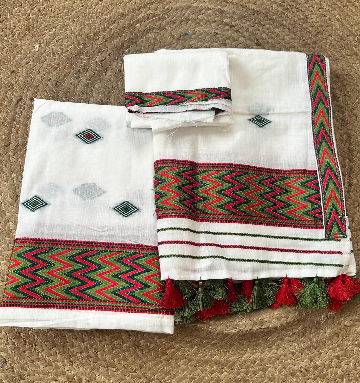 Our premium cotton ready-to-wear Mekhla Sador features a simple, elegant design, thoughtfully created for modern comfort without compromising heritage. Inspired by the vibrant cultures of the tribes of the region, it showcases striking multicoloured zigzag patterns and bold paari (borders) that add subtle character, while delicate Burfi Buta motifs are woven gracefully all over the body. The mekhla comes pre-stitched for effortless wear, paired with a ready-to-drape sador for a polished look within minutes, and includes a matching unstitched blouse piece so you can tailor it to your perfect fit.
