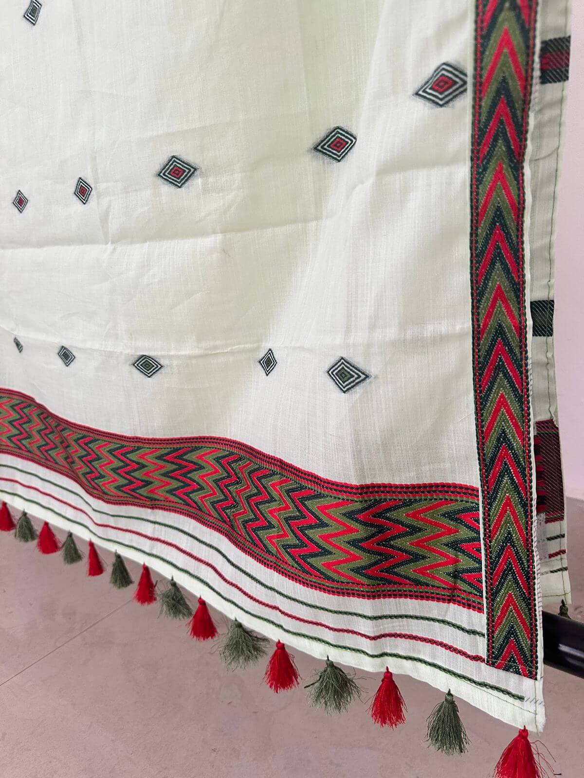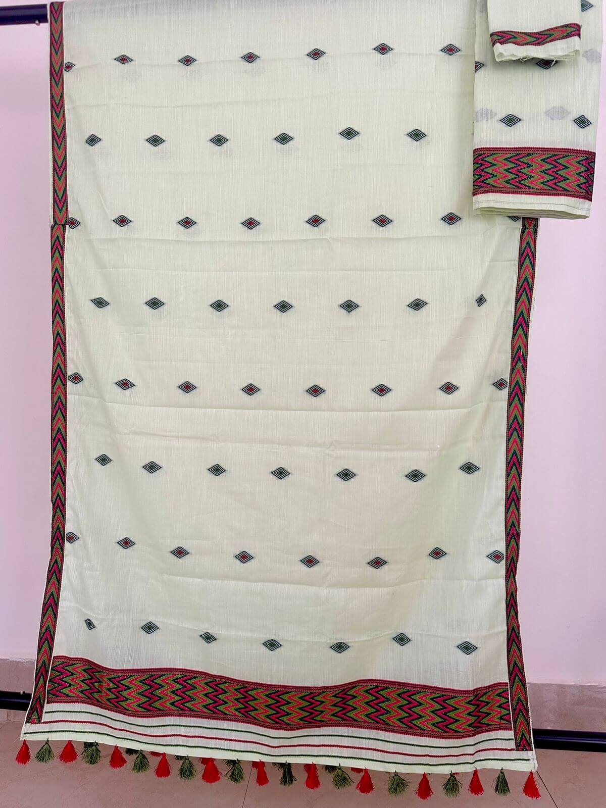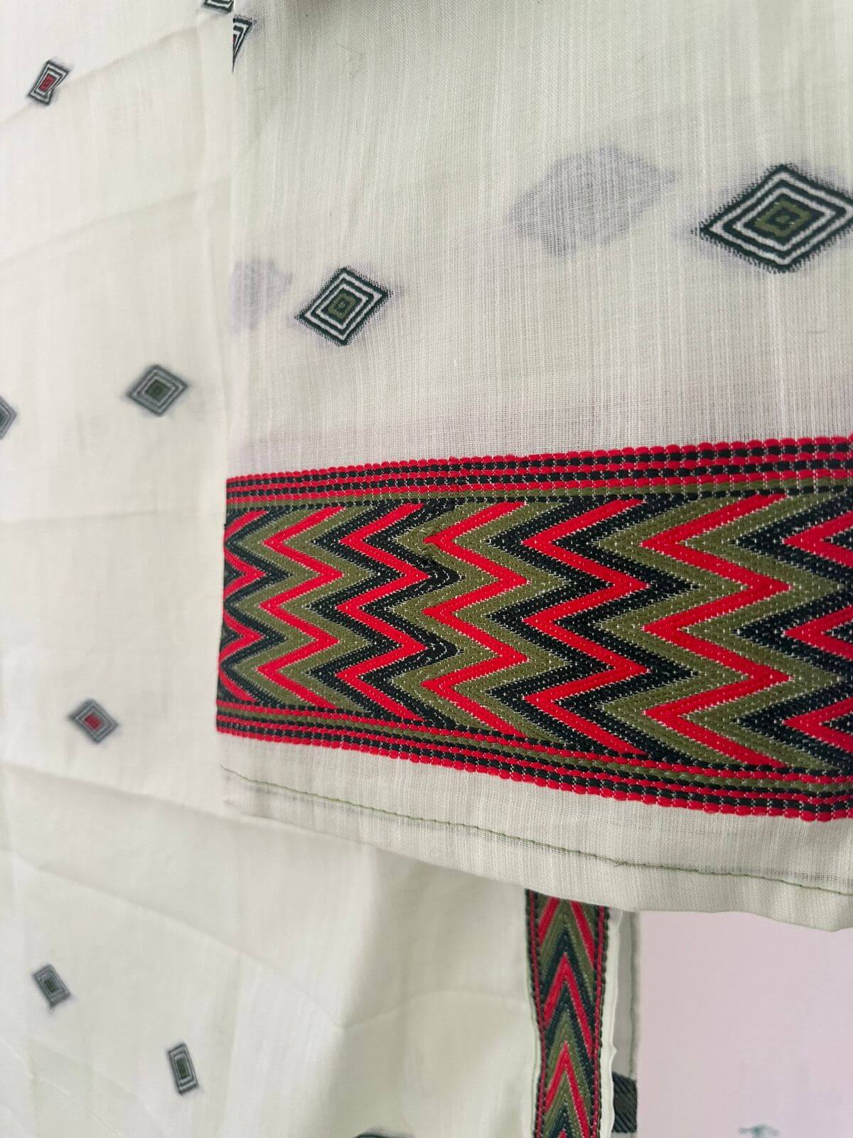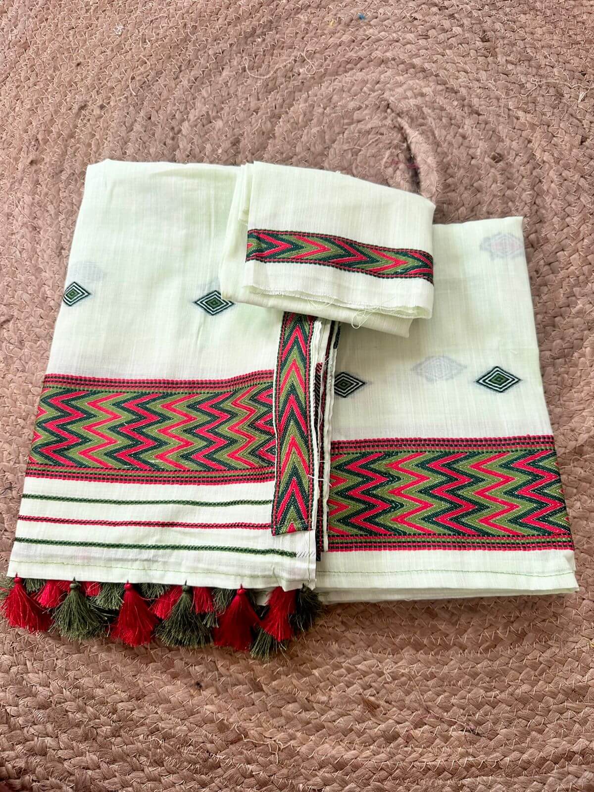 Our premium cotton ready-to-wear Mekhla Sador features a simple, elegant design, thoughtfully created for modern comfort without compromising heritage. Inspired by the vibrant cultures of the tribes of the region, it showcases striking multicoloured zigzag patterns and bold paari (borders) that add subtle character, while delicate Burfi Buta motifs are woven gracefully all over the body. The mekhla comes pre-stitched for effortless wear, paired with a ready-to-drape sador for a polished look within minutes, and includes a matching unstitched blouse piece so you can tailor it to your perfect fit.
