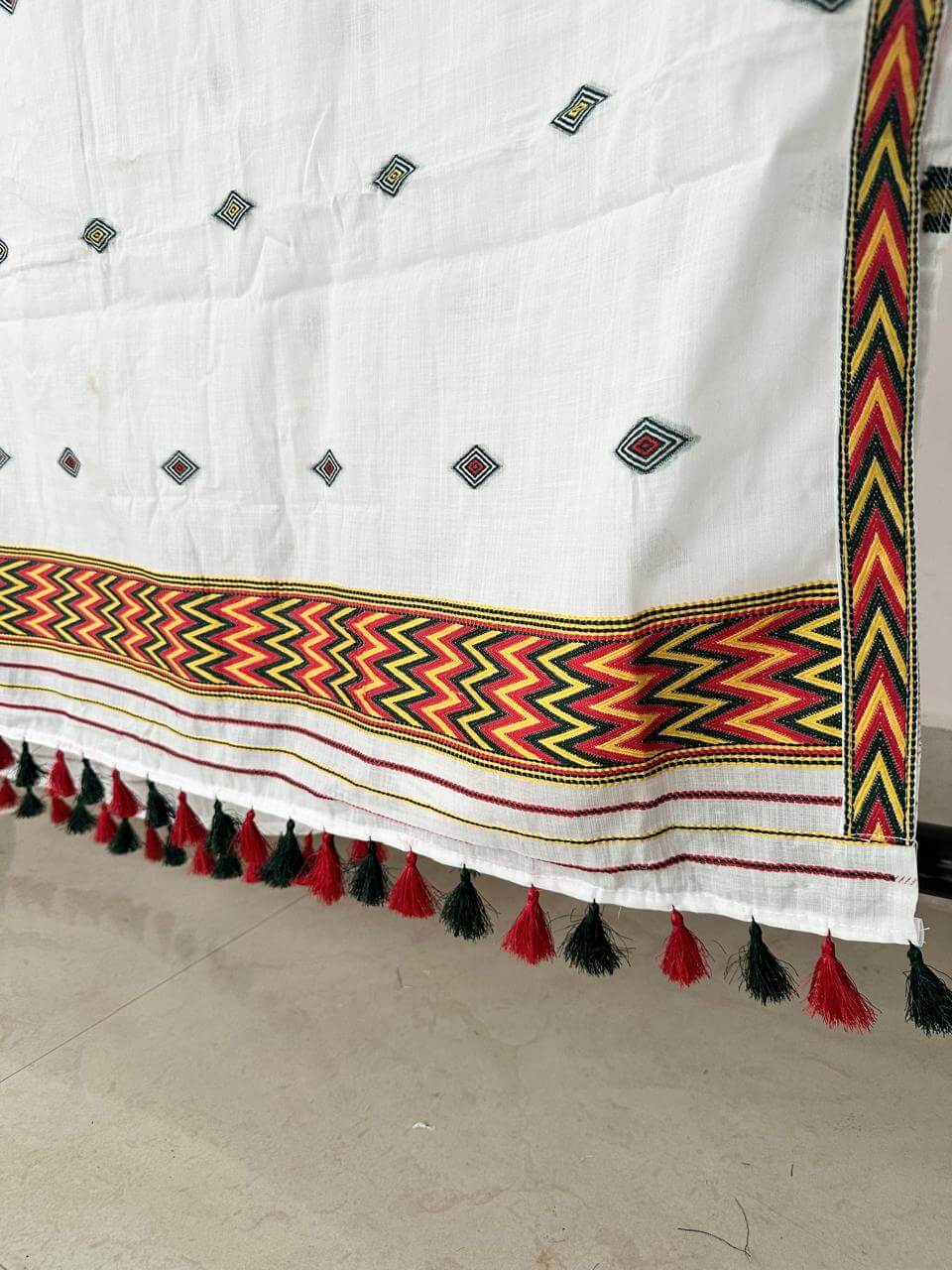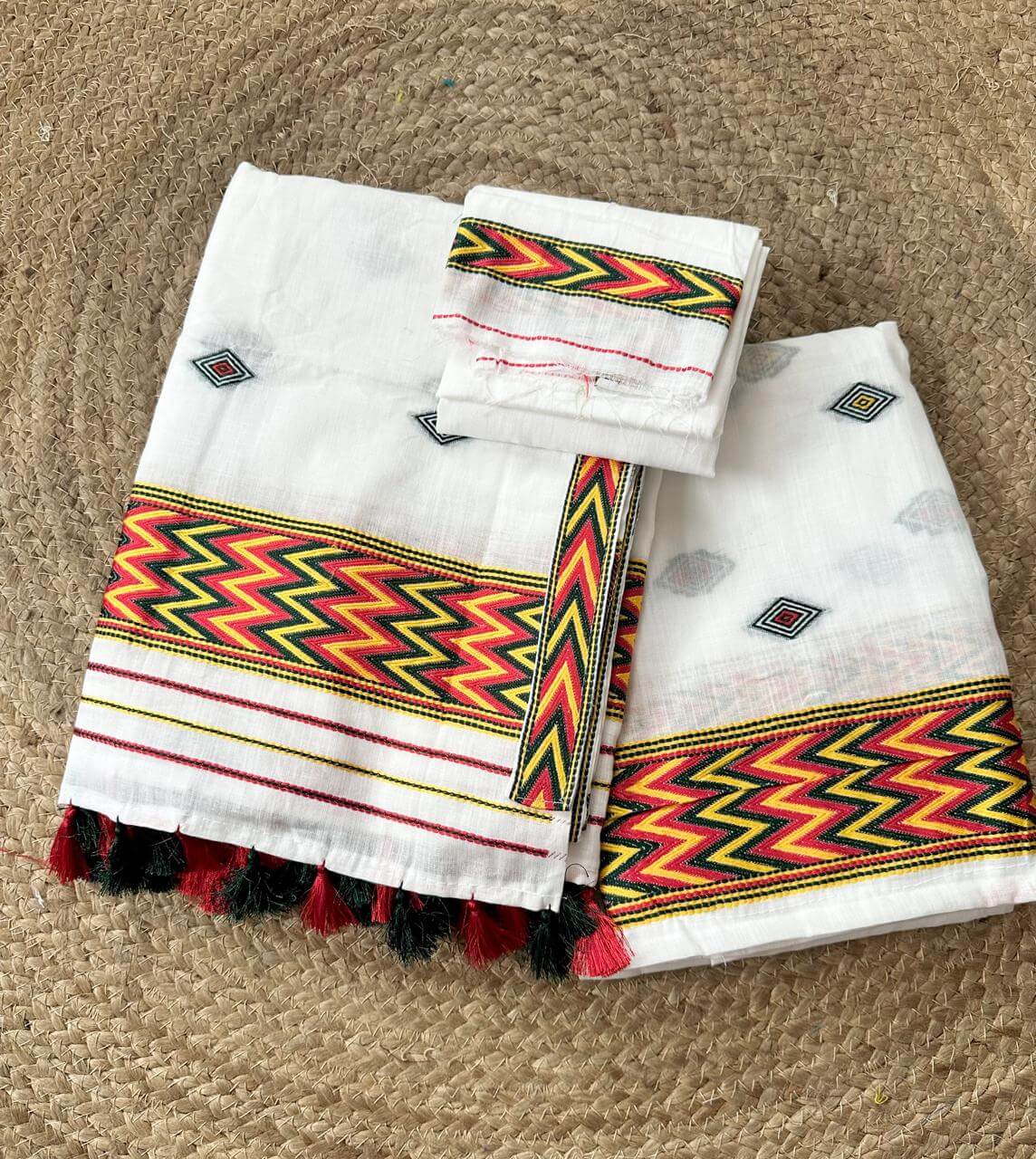 Our premium cotton ready-to-wear Mekhla Sador features a simple, elegant design, thoughtfully created for modern comfort without compromising heritage. Inspired by the vibrant cultures of the tribes of the region, it showcases striking multicoloured zigzag patterns and bold paari (borders) that add subtle character, while delicate Burfi Buta motifs are woven gracefully all over the body. The mekhla comes pre-stitched for effortless wear, paired with a ready-to-drape sador for a polished look within minutes, and includes a matching unstitched blouse piece so you can tailor it to your perfect fit.