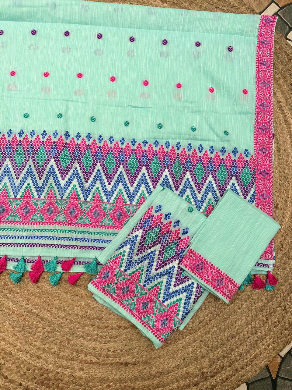 Ready-to-wear mekhela sador designed for effortless elegance and ease, these premium cotton pieces are perfect for embracing both comfort and celebration. Crafted in breathable, soft cotton, they are ideal for the summer season while being festive-friendly enough for special occasions and spring celebrations like Bohag Bihu. The soothing pastel body is beautifully enhanced with vibrant floral motifs that feel fresh, graceful, and pleasing to the eye, while delicate silver thread highlights add a subtle shimmer, elevating the overall look with a refined, premium touch.