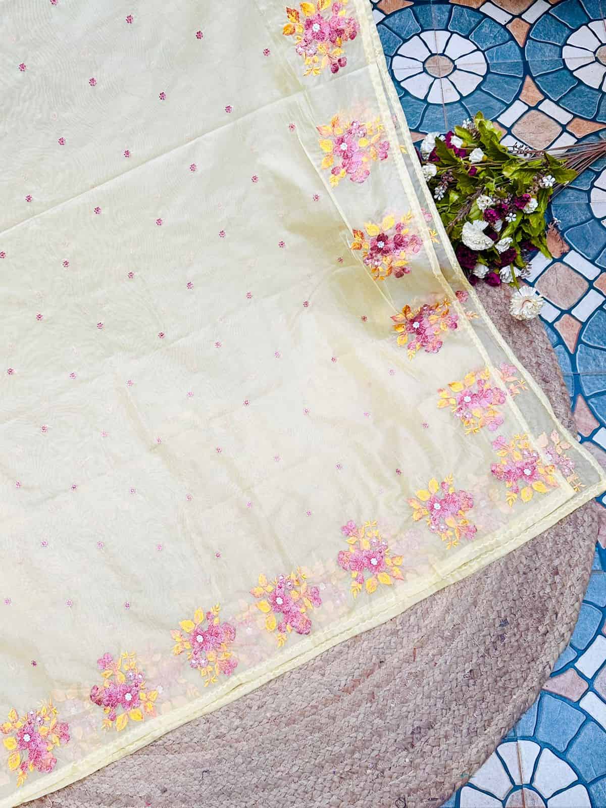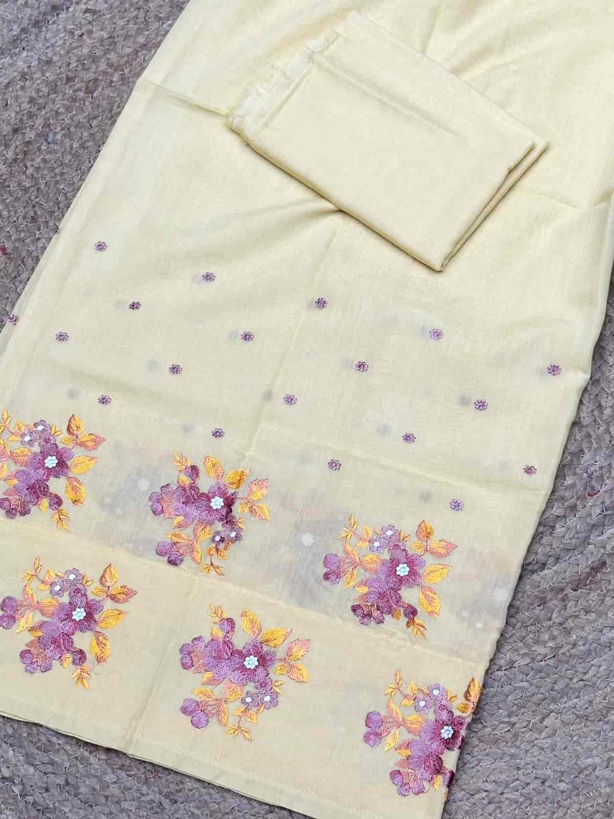 An elegant ready-to-wear set designed for timeless grace. The mekhela is crafted in soft reshmi cotton, paired with a premium cotton sador adorned with intricate floral embroidery. The blouse is provided unstitched, giving you the freedom to style it your way. Perfect for festive, traditional, and special occasions.