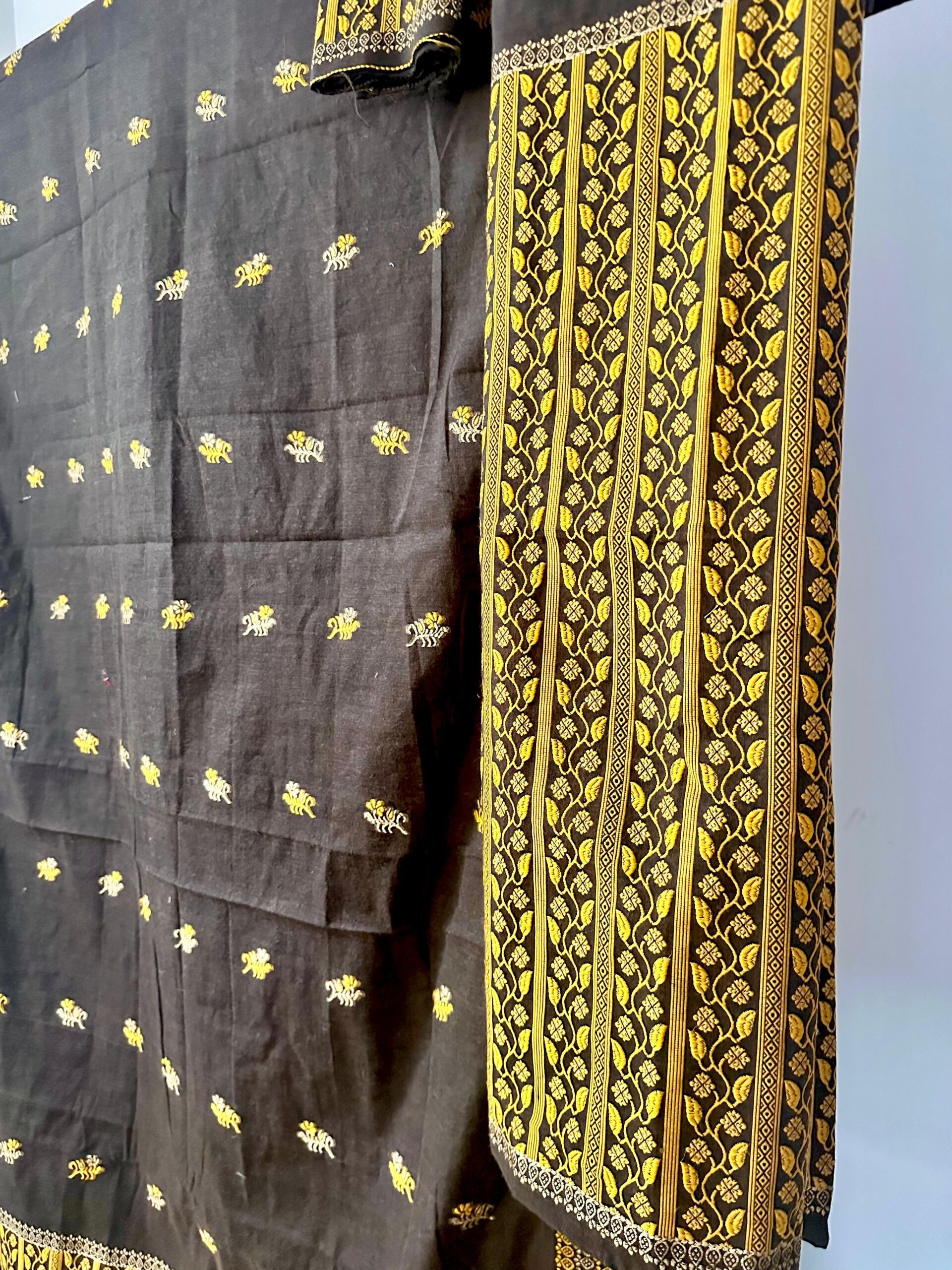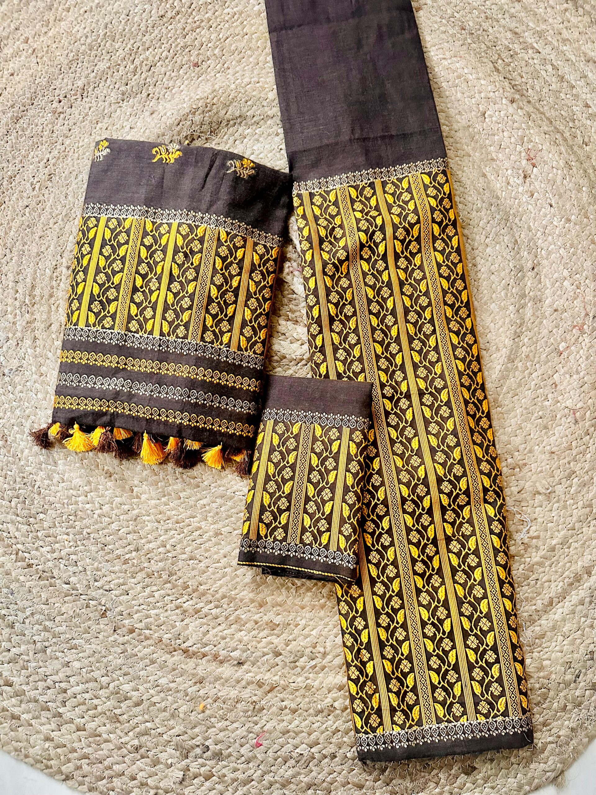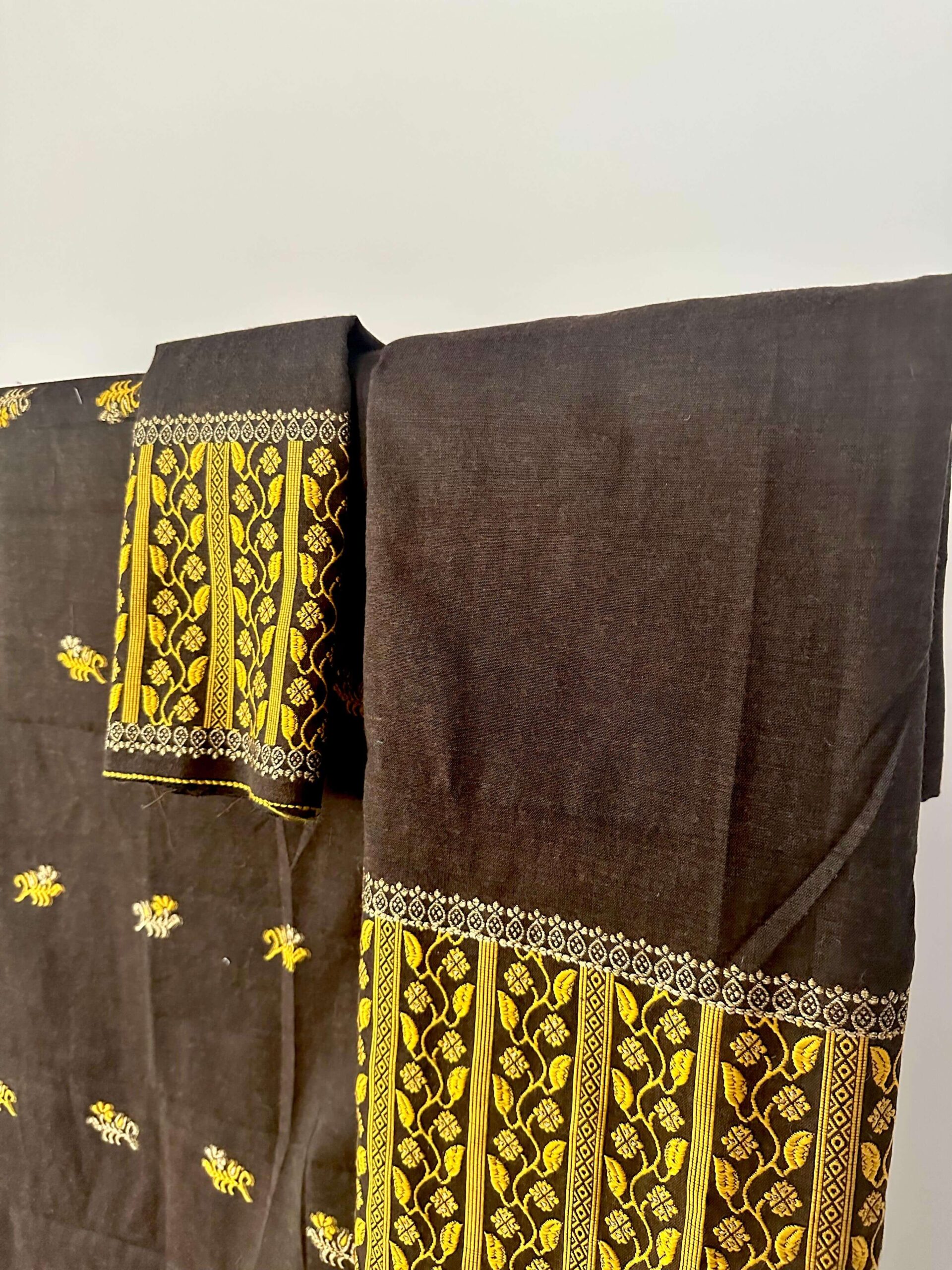 Ready-to-wear Mekhela Sador set in premium cotton, designed to offer a rich, luxurious look perfect for weddings and festive occasions—without the heaviness of silk. Adorned with striking leafy vines and floral motifs across the sador, the true highlight is the mekhela, featuring a bold, densely woven statement border that adds a unique, eye-catching appeal. Lightweight, breathable, and elegant, it comes with an attached unstitched blouse piece.