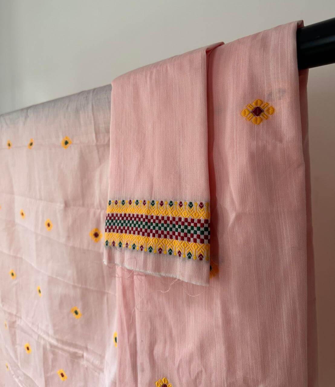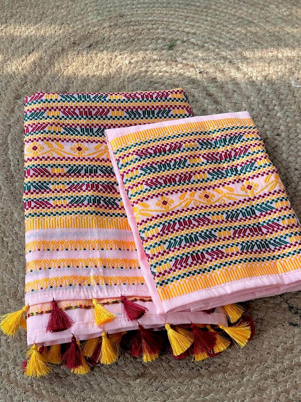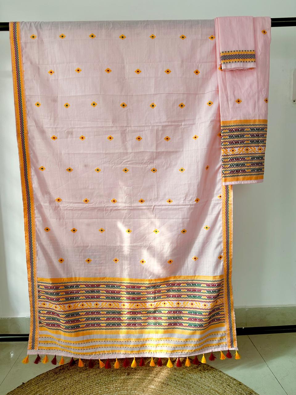 This ready-to-wear Mekhela Sador set is crafted in premium cotton, offering effortless elegance with everyday comfort. Inspired by vibrant tribal floral motifs, the design is intricately enhanced with geometric line detailing woven in multiple colours, creating a distinctive visual appeal while preserving the essence of traditional craftsmanship. Lightweight, breathable, and refined in finish, it is well-suited for festive gatherings and cultural occasions. The blouse piece included with the set is unstitched.