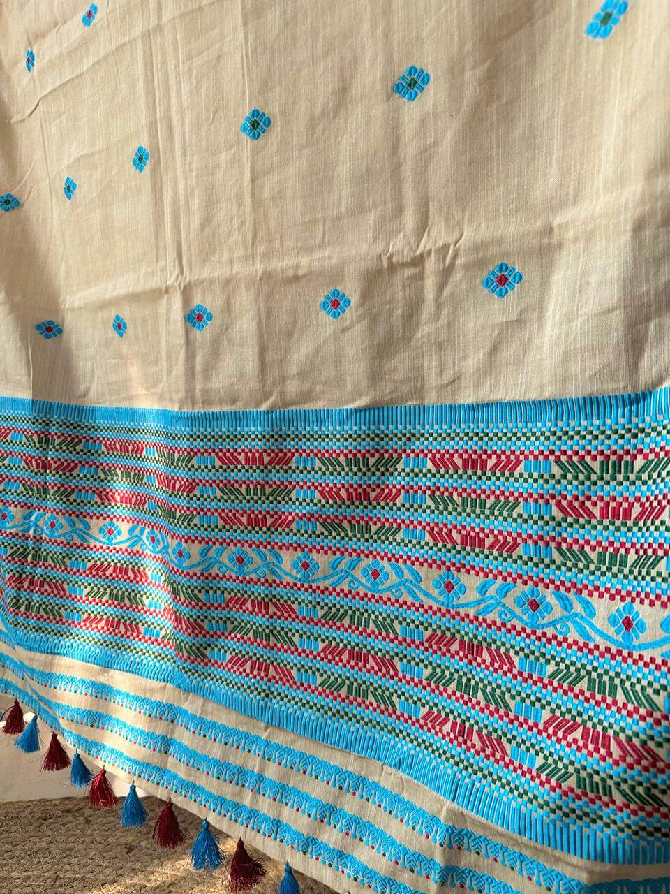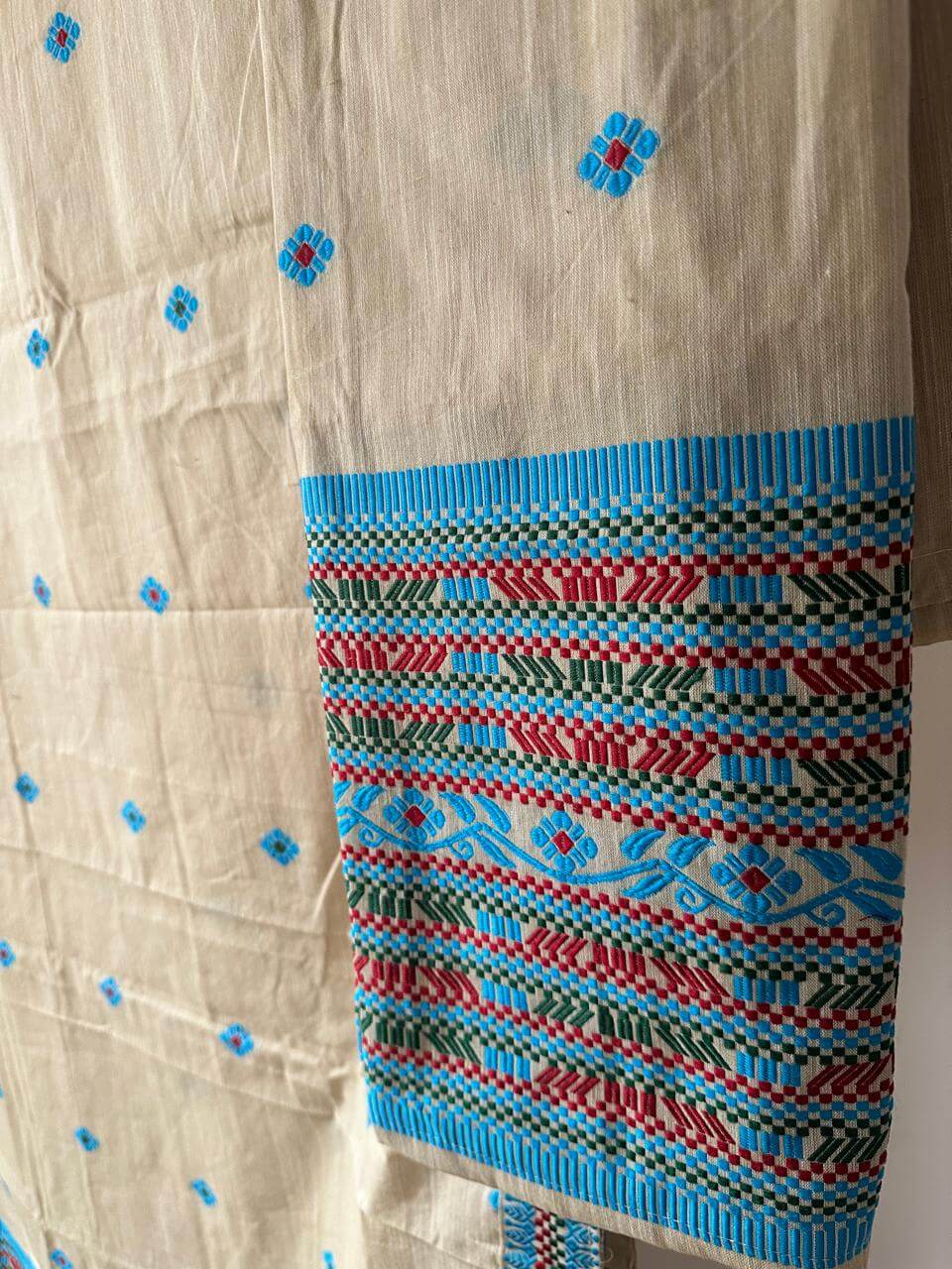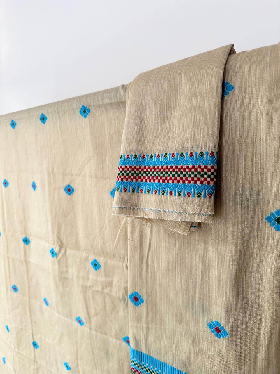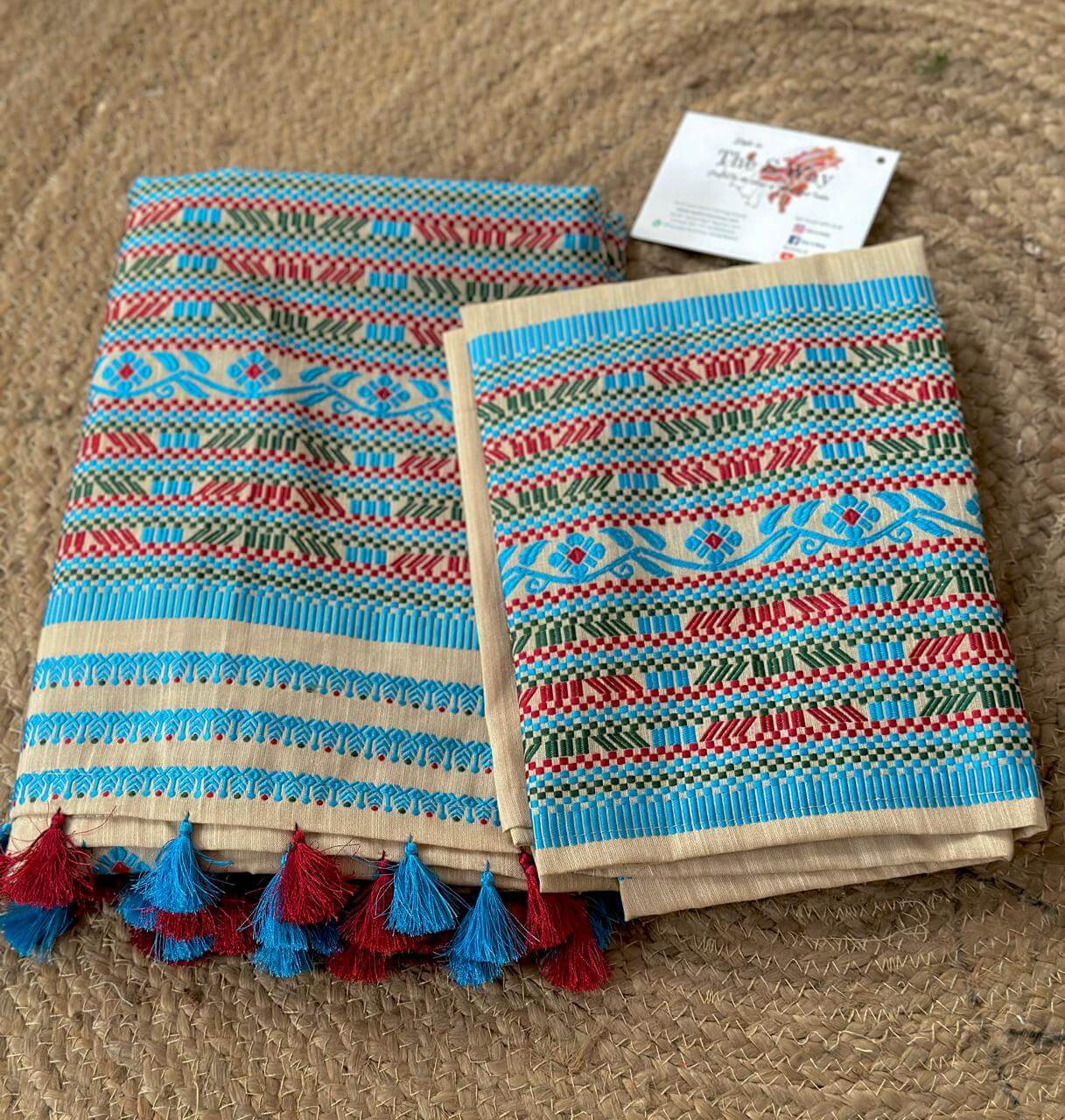 This ready-to-wear Mekhela Sador set is crafted in premium cotton, offering effortless elegance with everyday comfort. Inspired by vibrant tribal floral motifs, the design is intricately enhanced with geometric line detailing woven in multiple colours, creating a distinctive visual appeal while preserving the essence of traditional craftsmanship. Lightweight, breathable, and refined in finish, it is well-suited for festive gatherings and cultural occasions. The blouse piece included with the set is unstitched.