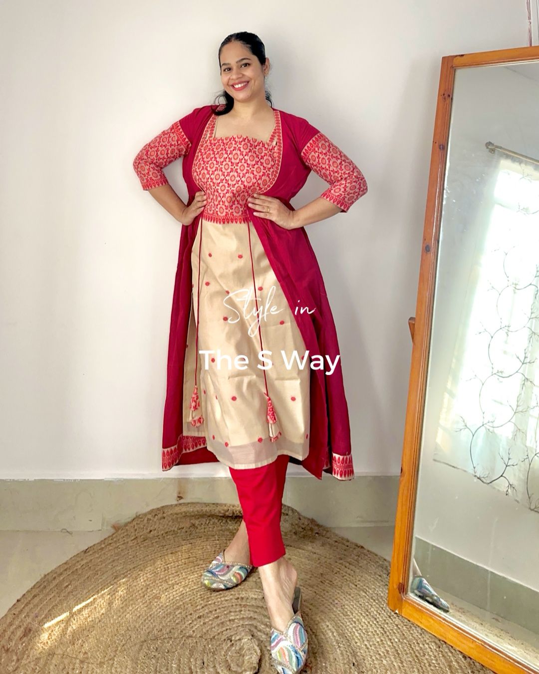 A refined two-piece set featuring a sleeveless cotton silk kurta in muga color, paired with a handloom cotton overcoat. Intricate handball detailing adds artisanal charm—perfect for elegant occasions.