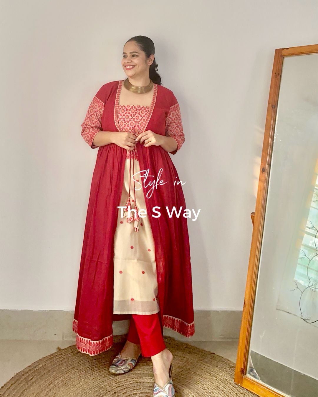 Celebrate timeless sophistication with this exquisite two-piece set. The sleeveless kurta, crafted from cotton-based silk in a rich muga hue, offers a graceful and refined look. Layered with a handloom cotton overcoat, this ensemble is elevated by intricate handball detailing on the sleeves and the chest, adding a touch of artisanal charm. Perfect for festive occasions, cultural gatherings, and elegant evenings.