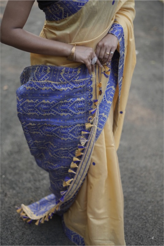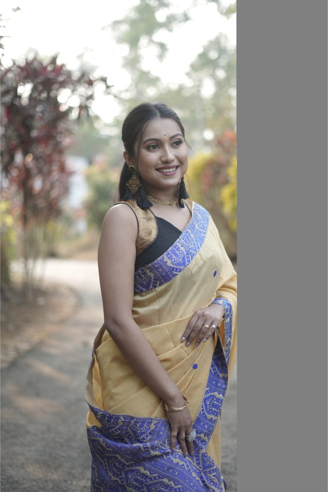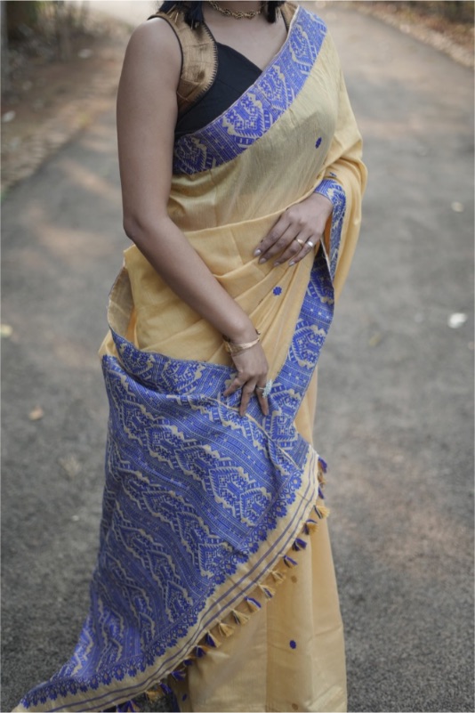 A gorgeous handloom saree in a thread dyed to achieve Muga Silk colour with intricately woven royal blue motifs. The pallu of the saree is a piece of art and speaks volumes of the craftsmanship. The saree is 100% premium silk cotton. The saree comes with a blouse piece of 1 m, the saree size is 5.5 m