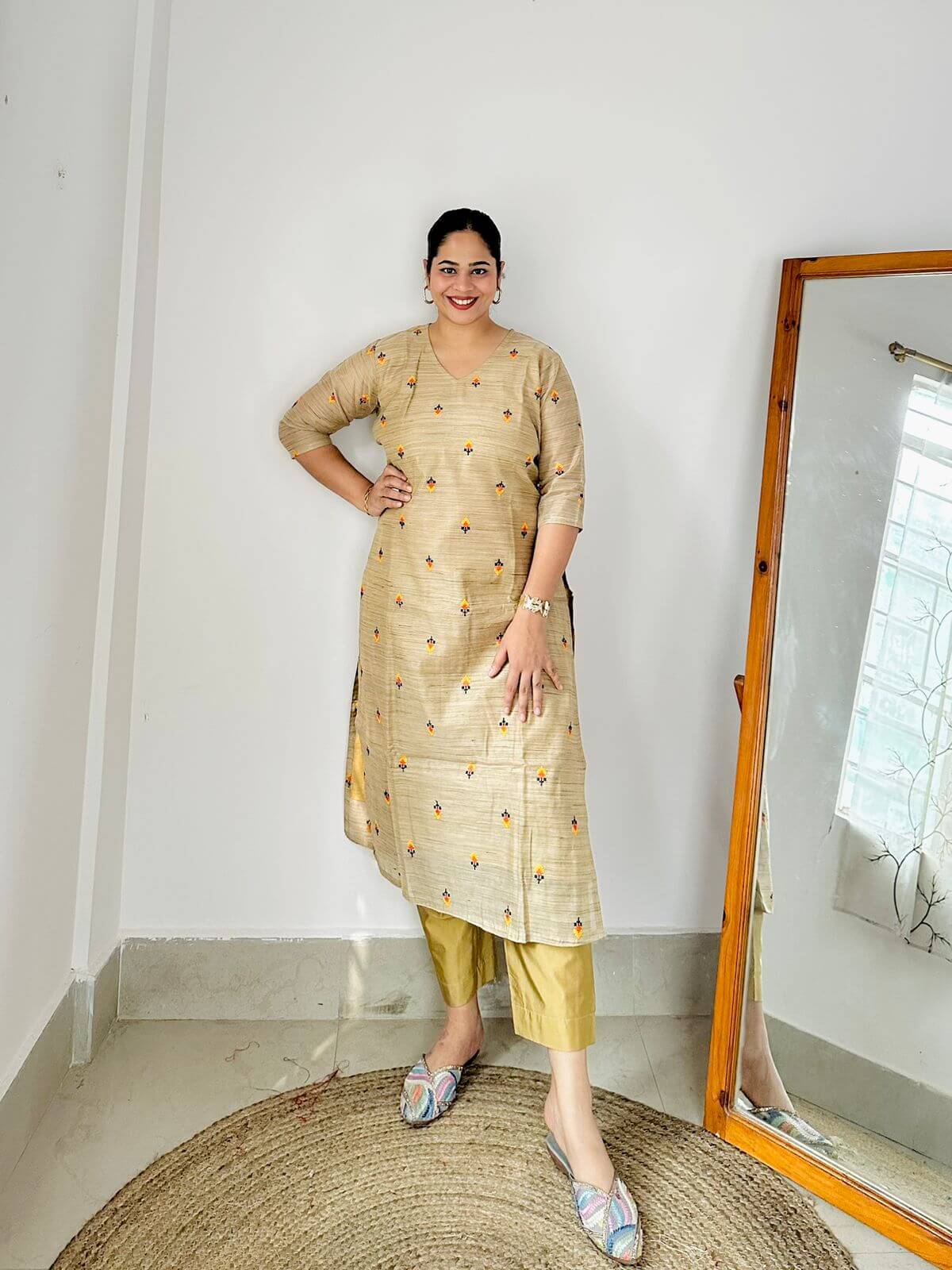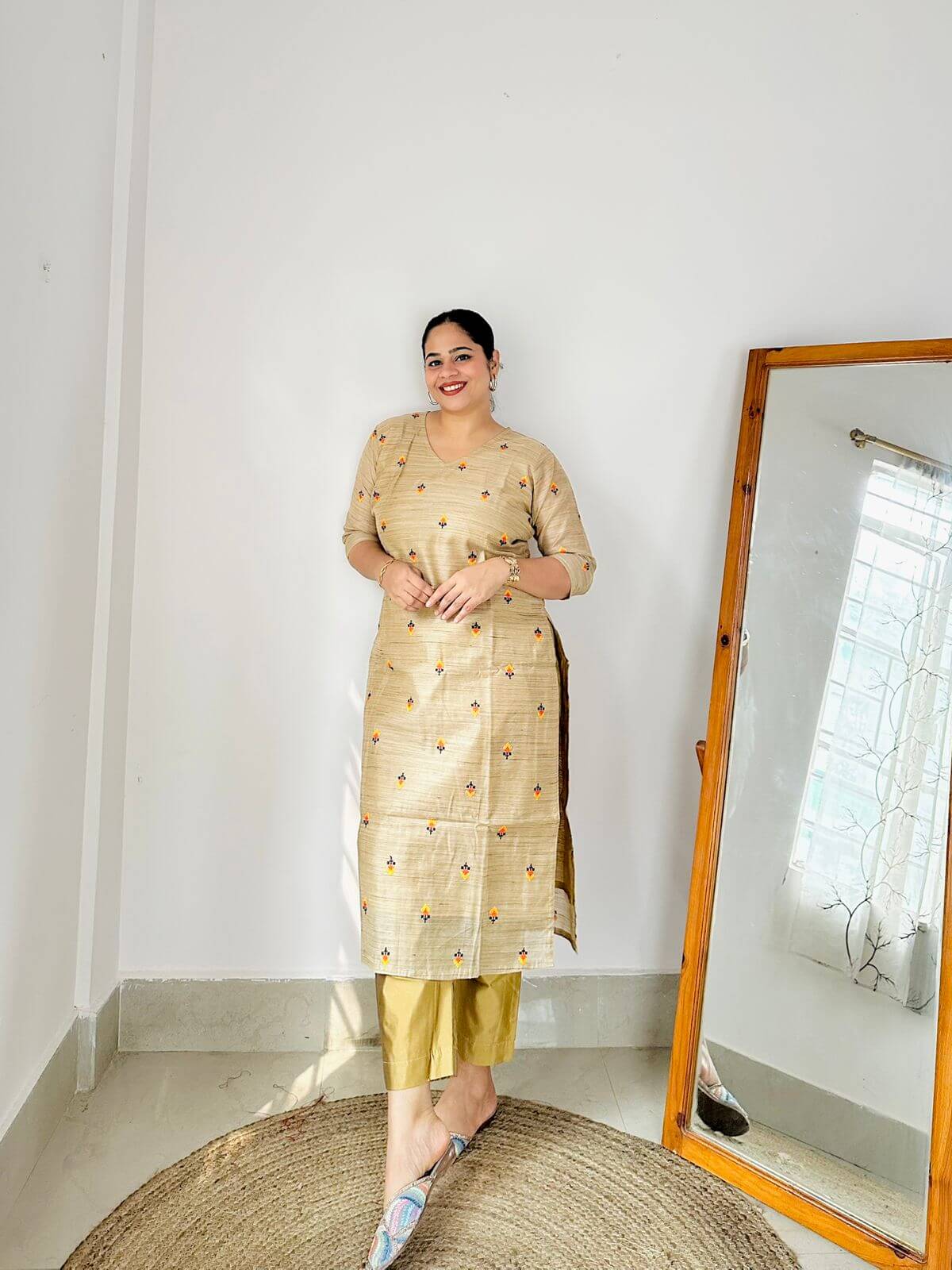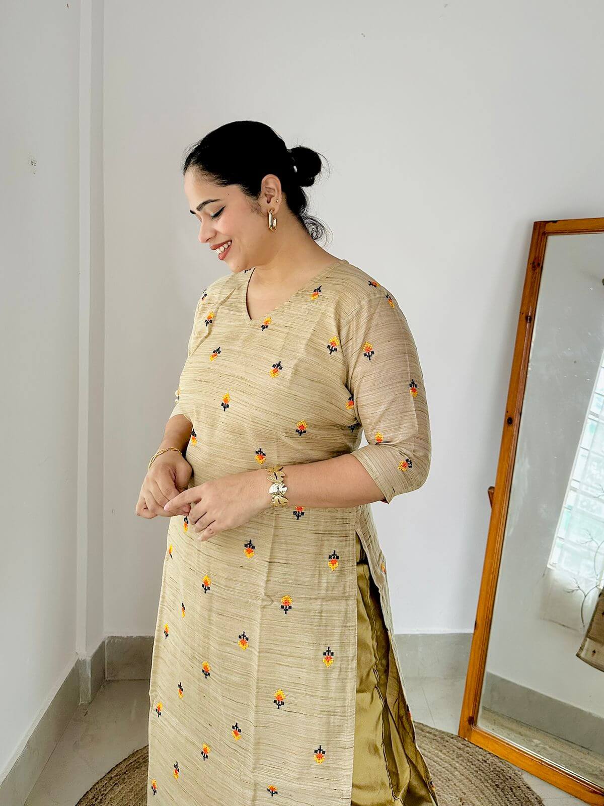 This is a handloom Ghisa silk kurta with intricate hand embroidered cross stitched motifs on it. This is a sophisticated, minimalist piece that can be a evergreen addition to your wardrobe.