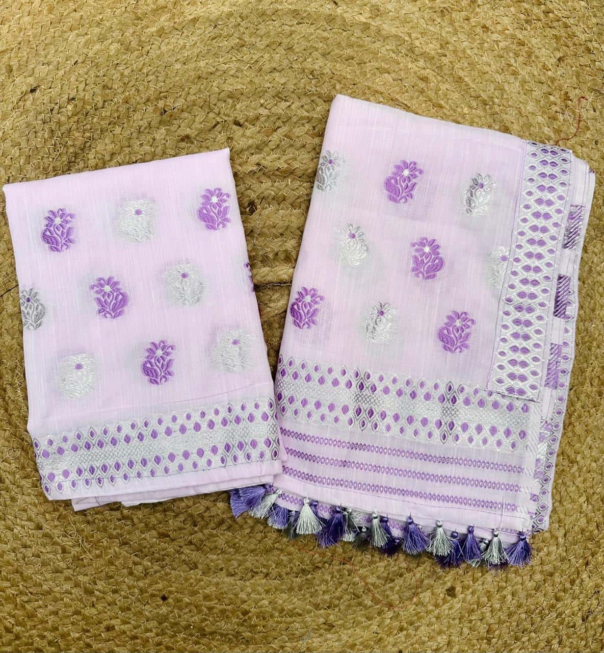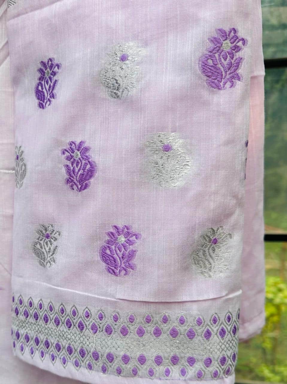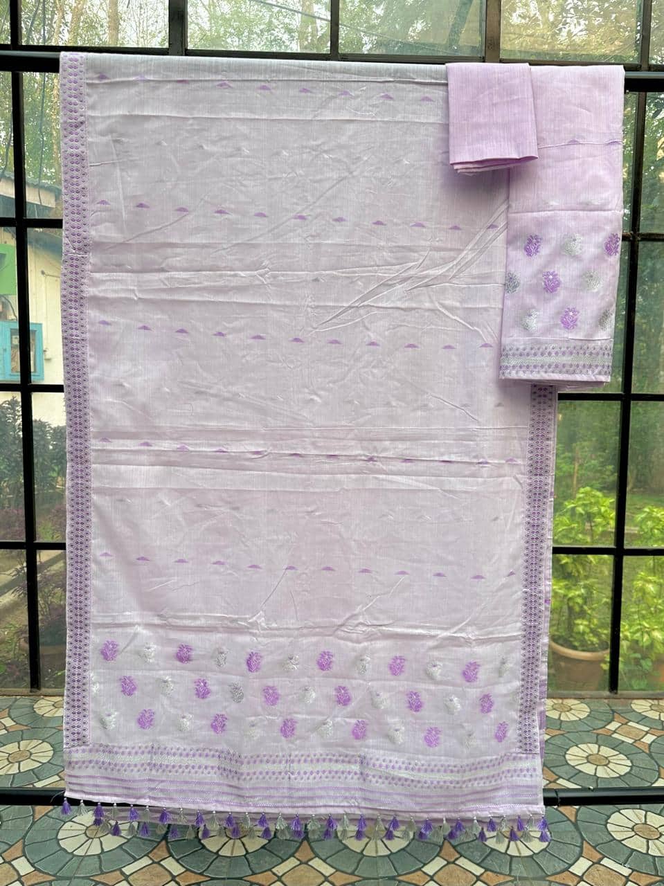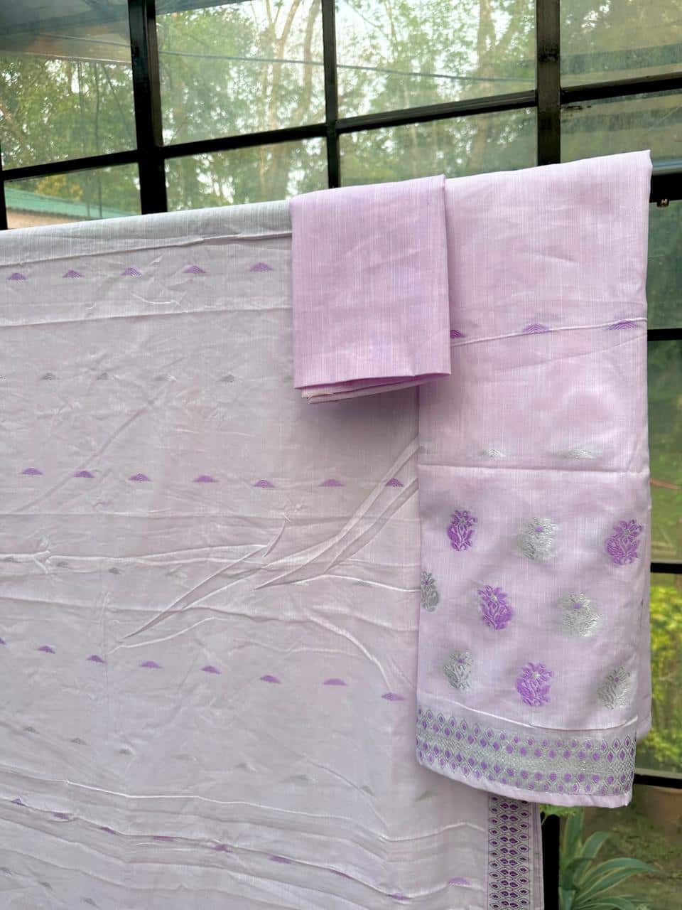 Ready-to-wear mekhela sador crafted in soft, breathable cotton for all-day comfort and ease. Pocket-friendly and designed in beautiful pastel hues, this piece is perfect for everyday wear while maintaining an elegant, graceful appeal. Adorned with delicate floral motifs and subtle silver thread highlights, it adds just the right touch of refinement without being overwhelming. It comes with an attached unstitched blouse piece, allowing for personalized styling. Ideal for casual outings, daily workwear, or even thoughtful gifting, this set brings together comfort, versatility, and understated style effortlessly.
