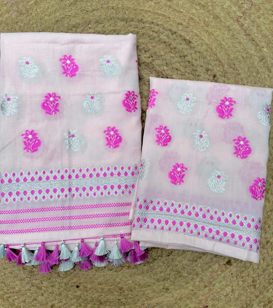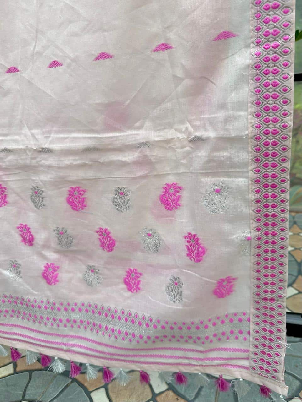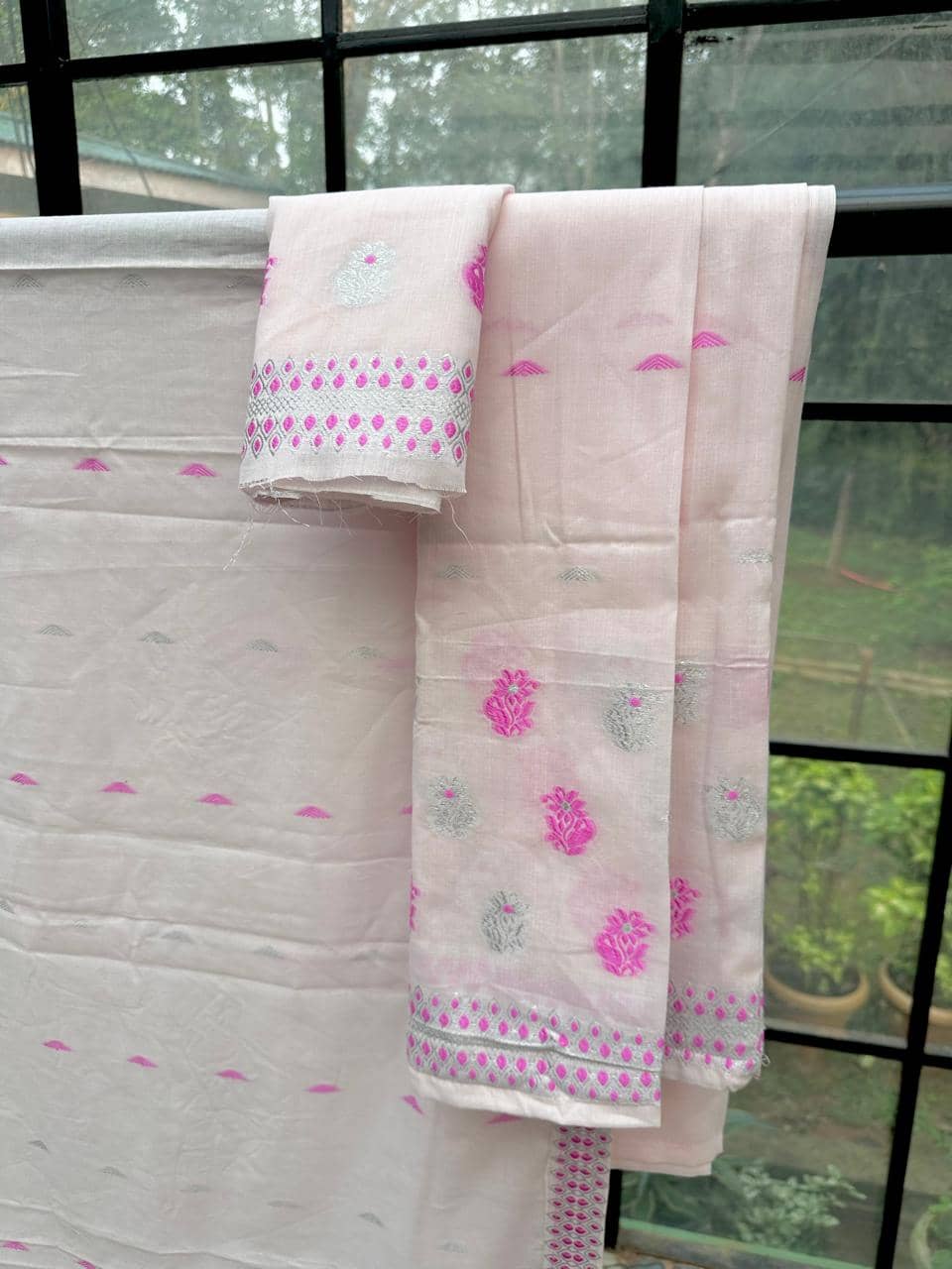 Ready-to-wear mekhela sador crafted in soft, breathable cotton for all-day comfort and ease. Pocket-friendly and designed in beautiful pastel hues, this piece is perfect for everyday wear while maintaining an elegant, graceful appeal. Adorned with delicate floral motifs and subtle silver thread highlights, it adds just the right touch of refinement without being overwhelming. It comes with an attached unstitched blouse piece, allowing for personalized styling. Ideal for casual outings, daily workwear, or even thoughtful gifting, this set brings together comfort, versatility, and understated style effortlessly.