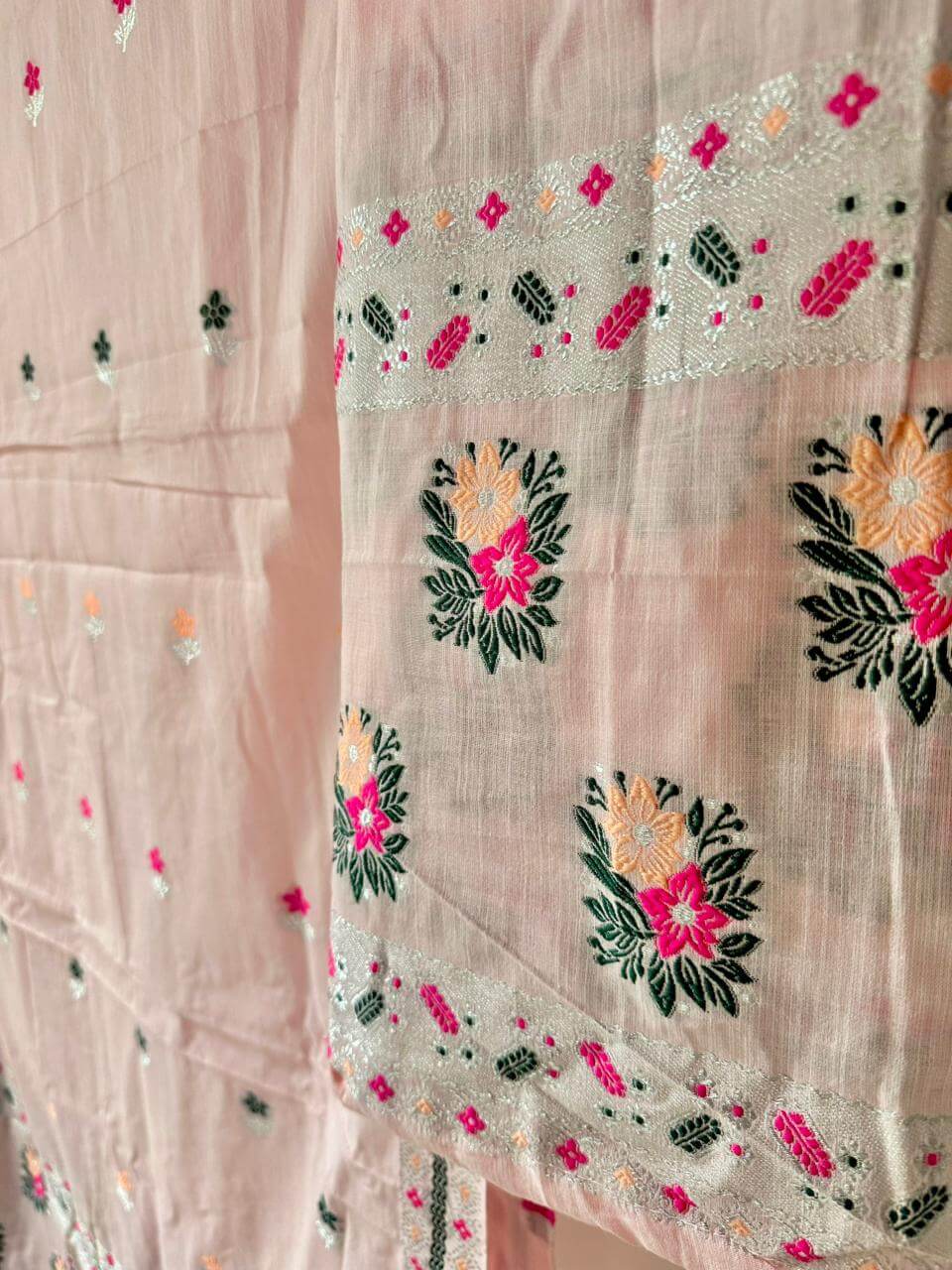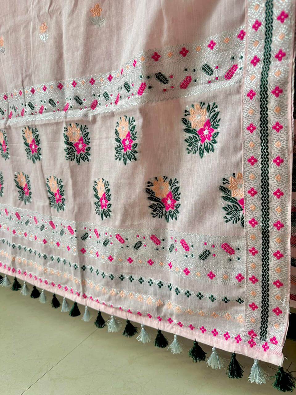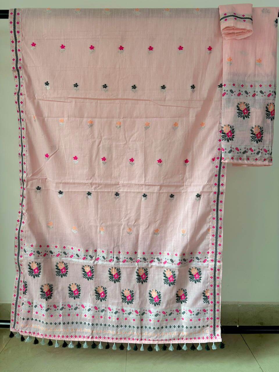 Step into effortless elegance with our ready-to-wear premium cotton Mekhela Sador, designed for comfort and modern grace. Crafted in soft pastel and light hues, it features delicately scattered floral motifs across the body that create a fresh, spring-inspired look without feeling heavy. Light, breathable, and beautifully colored, it’s perfect for everyday elegance and festive moments alike. Blouse piece comes unstitched.