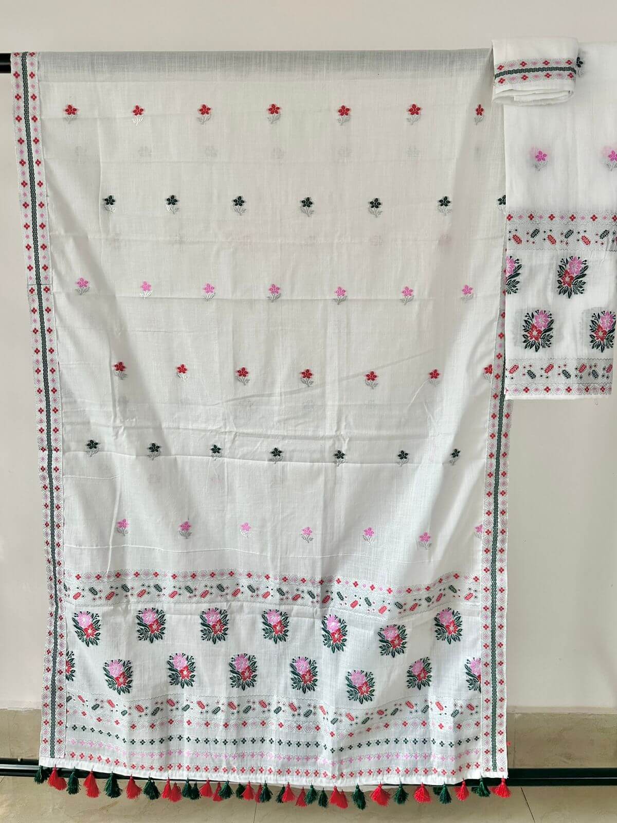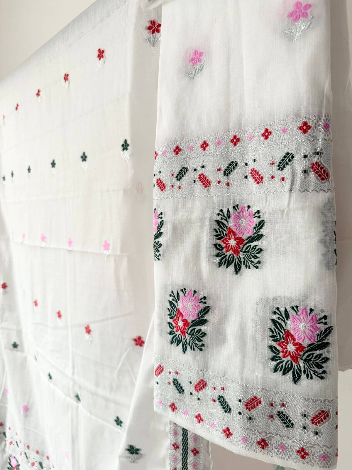 Step into effortless elegance with our ready-to-wear premium cotton Mekhela Sador, designed for comfort and modern grace. Crafted in soft pastel and light hues, it features delicately scattered floral motifs across the body that create a fresh, spring-inspired look without feeling heavy. Light, breathable, and beautifully colored, it’s perfect for everyday elegance and festive moments alike. Blouse piece comes unstitched.