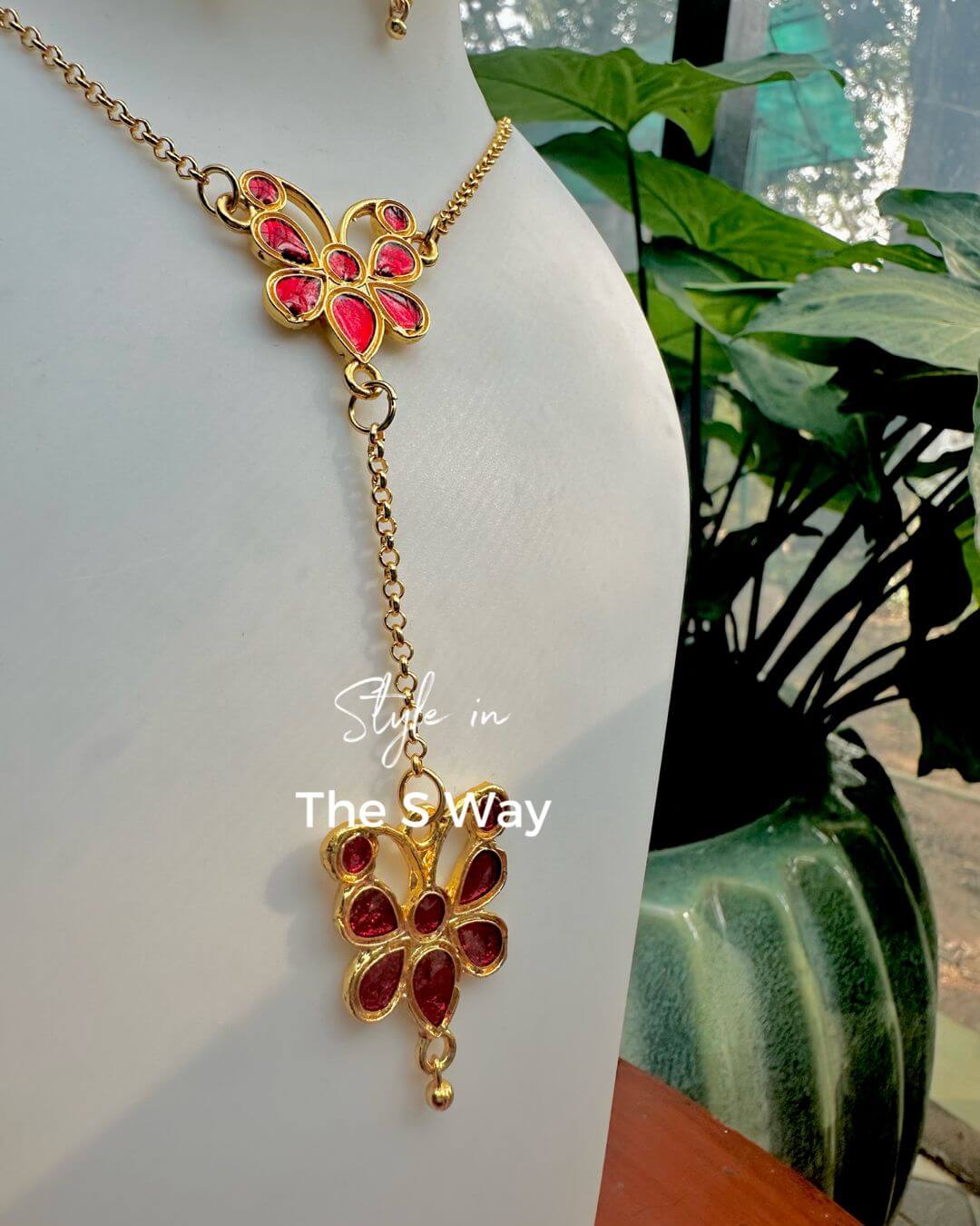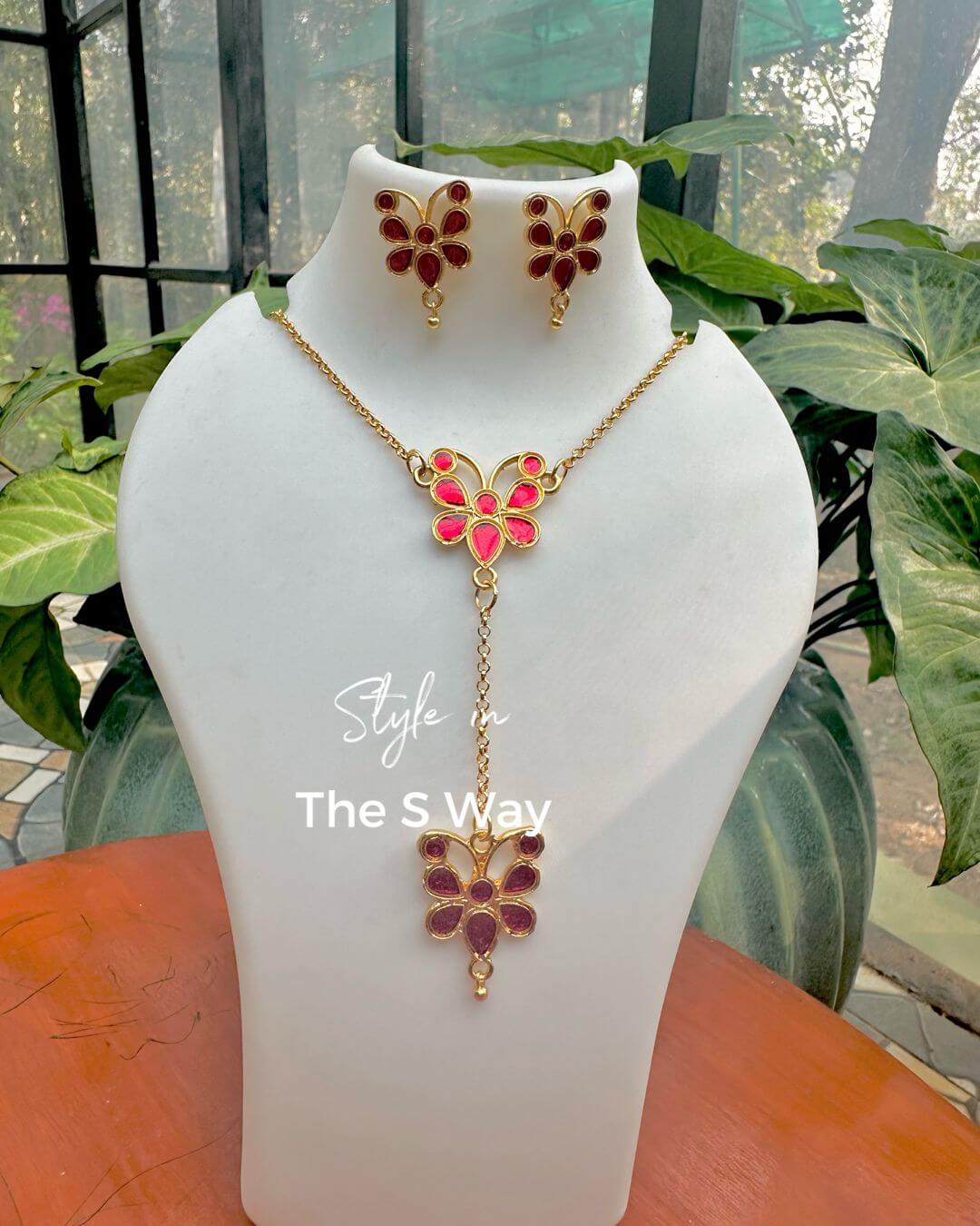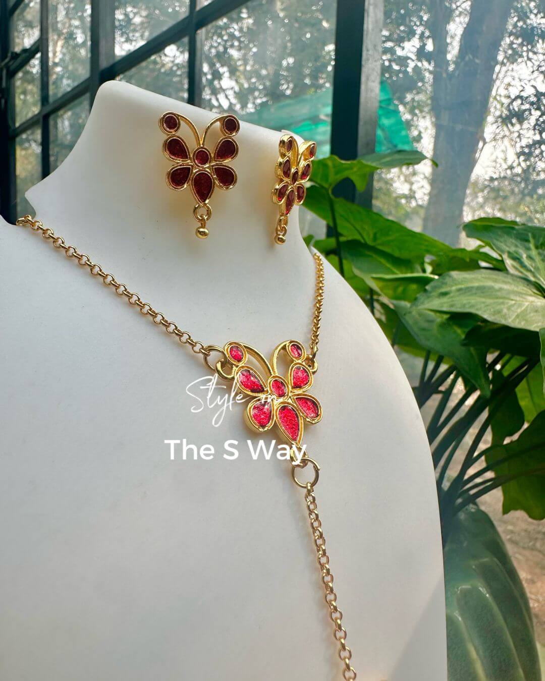 Make a bold festive statement with this elegant red butterfly motif jewellery set. Designed in a rich gold-toned finish, the necklace features vibrant red enamel detailing with a graceful drop-chain pendant that adds movement and charm. The look is completed with matching butterfly earrings, making it perfect for weddings, festive occasions, and traditional celebrations.