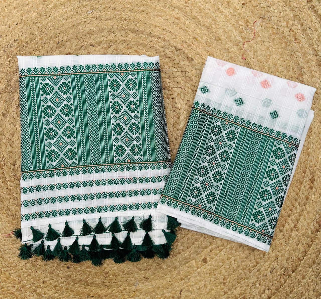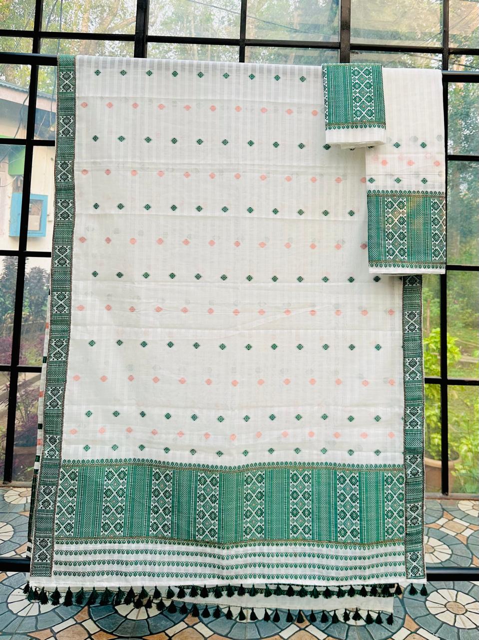 A ready-to-wear mekhela sador crafted in premium Nuni cotton, this elegant piece features a pristine white body adorned with the traditional gadi weave—beautifully structured checkered patterns that add subtle texture and heritage charm. Accentuated with intricate traditional motifs in refined, graceful hues, the design strikes a perfect balance between simplicity and sophistication. Lightweight, breathable, and exceptionally comfortable, it is ideal for festive occasions as well as formal or official settings, making it a versatile choice for women of all ages—from the young to the graceful and mature—who appreciate timeless elegance.