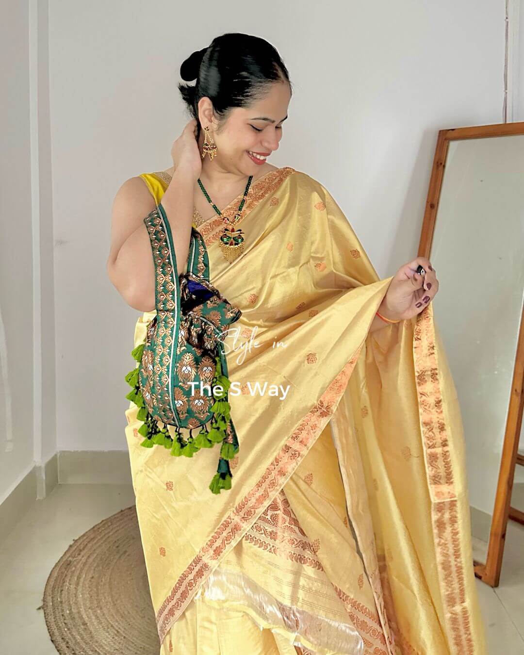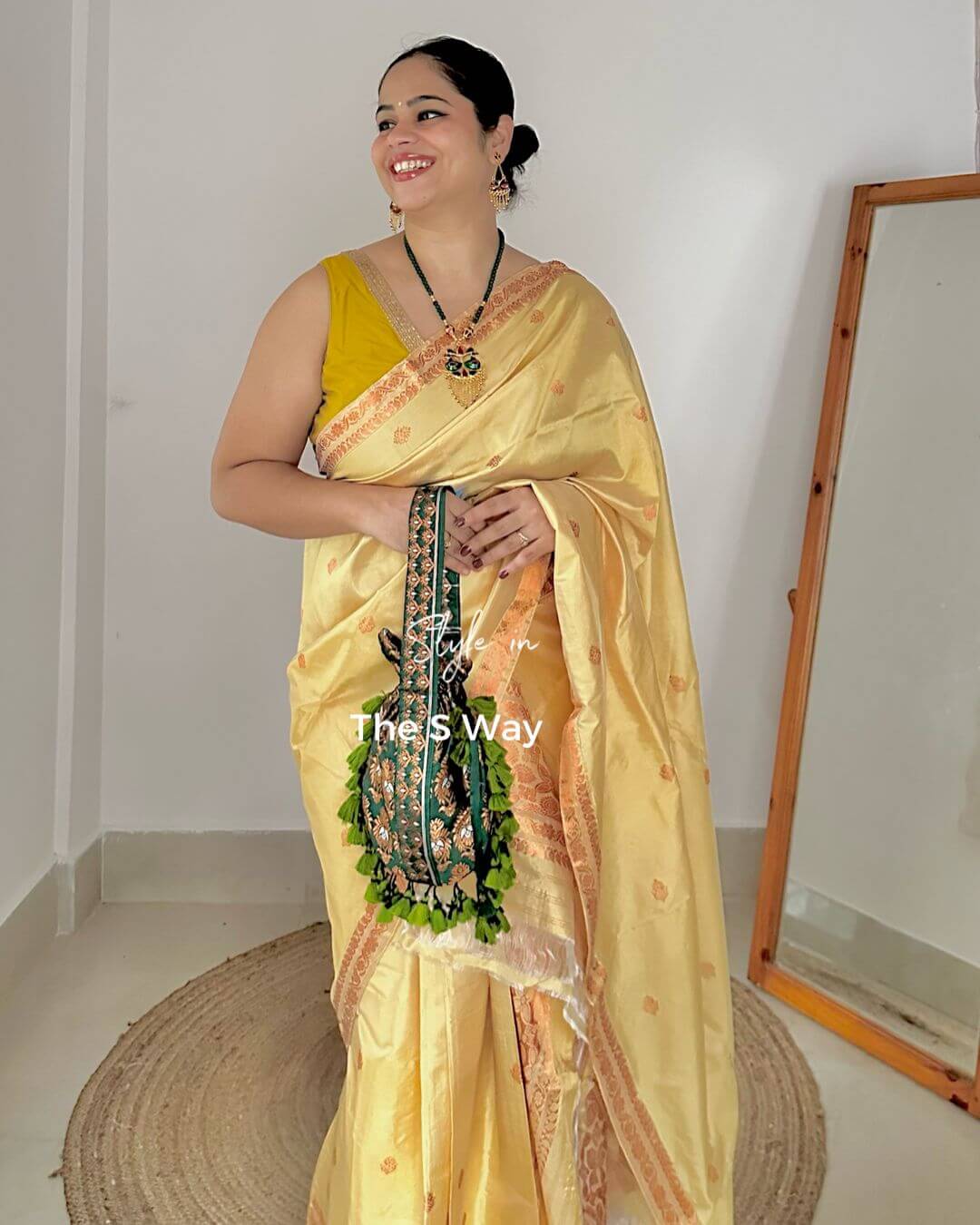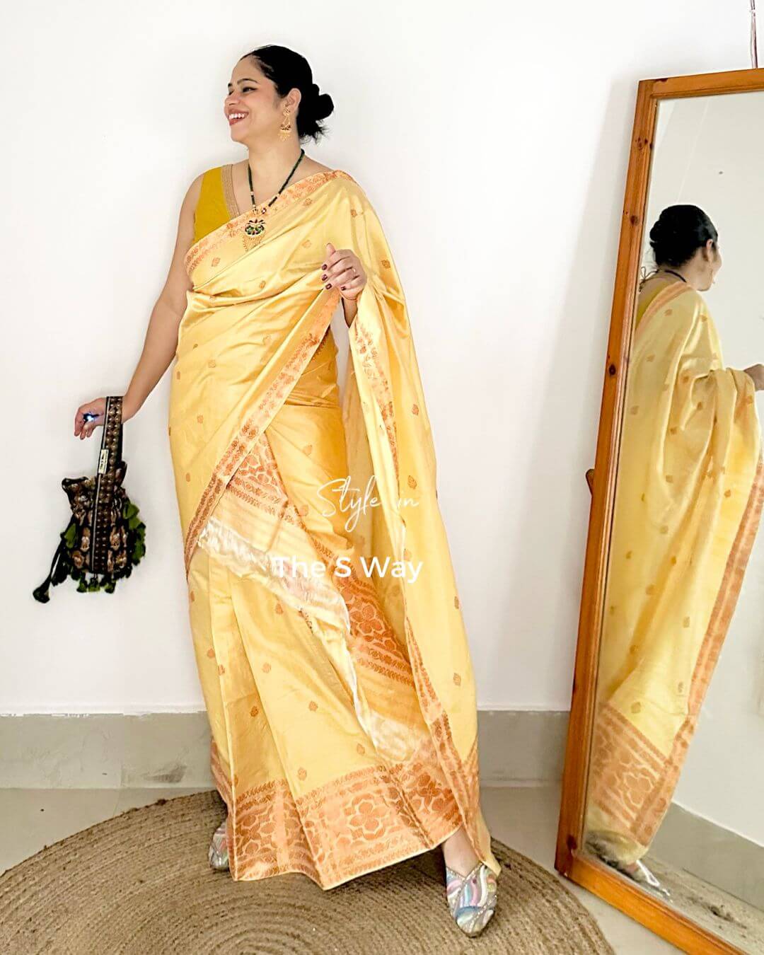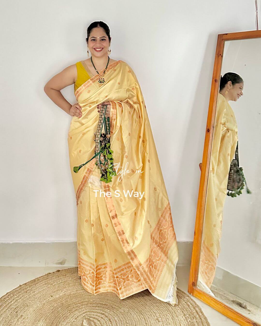 This Silk Mark Certified Pure Paat Mekhela-Sador Set is handwoven in Sualkuchi, renowned as the silk village of Assam. The ensemble comes in a soothing butter-yellow shade enriched with elegant rose-gold zari, giving it a soft, luminous finish.