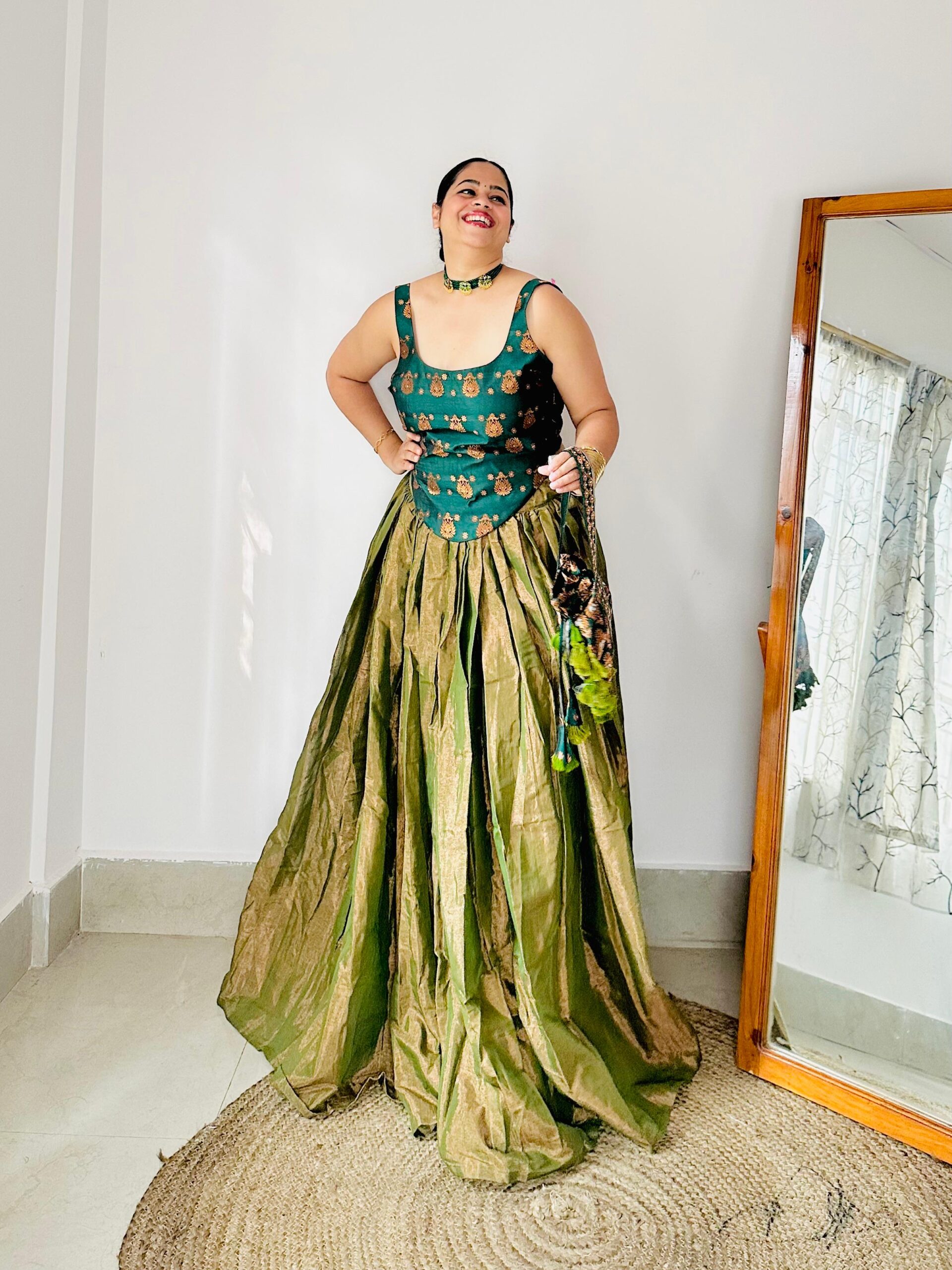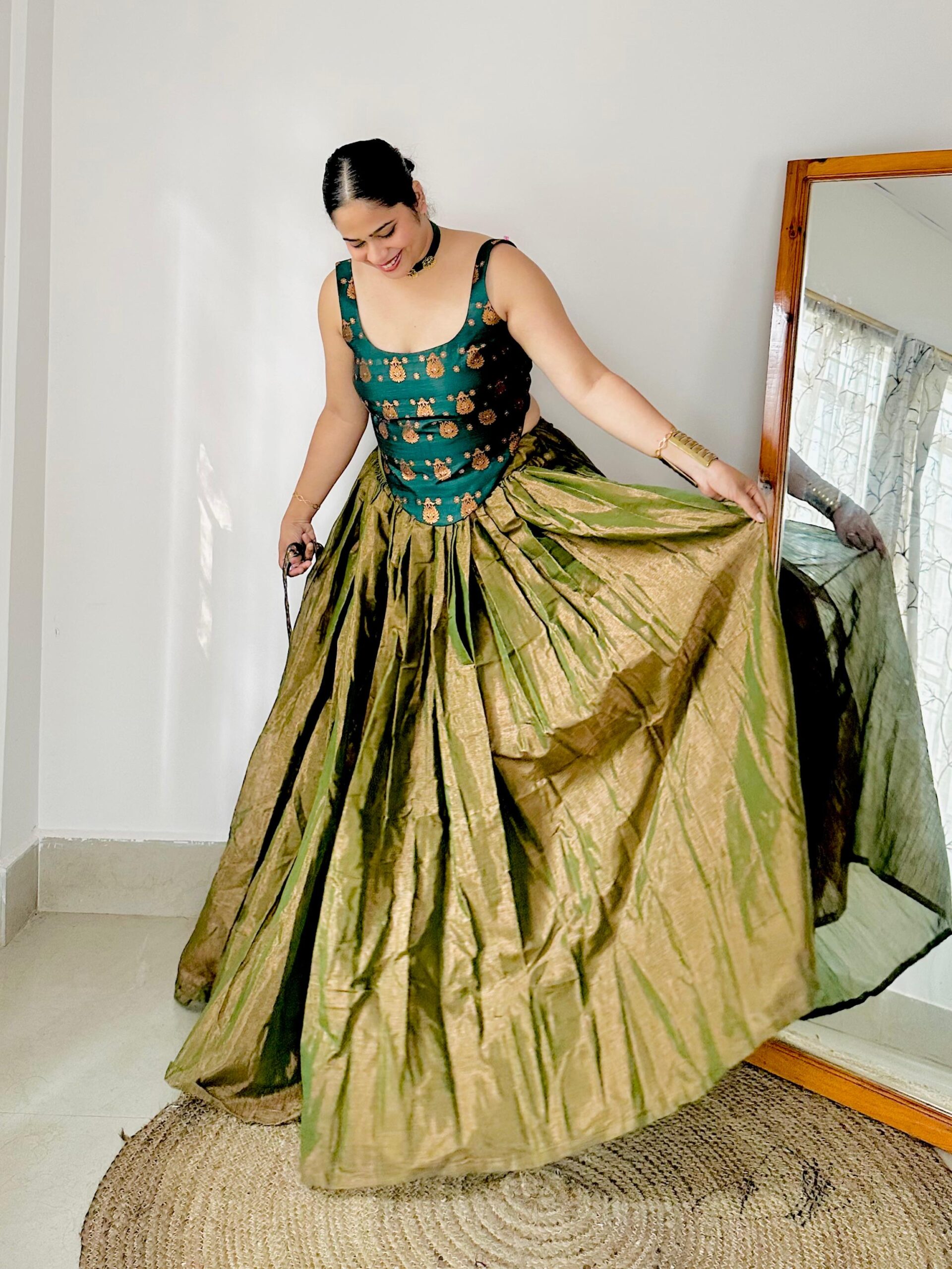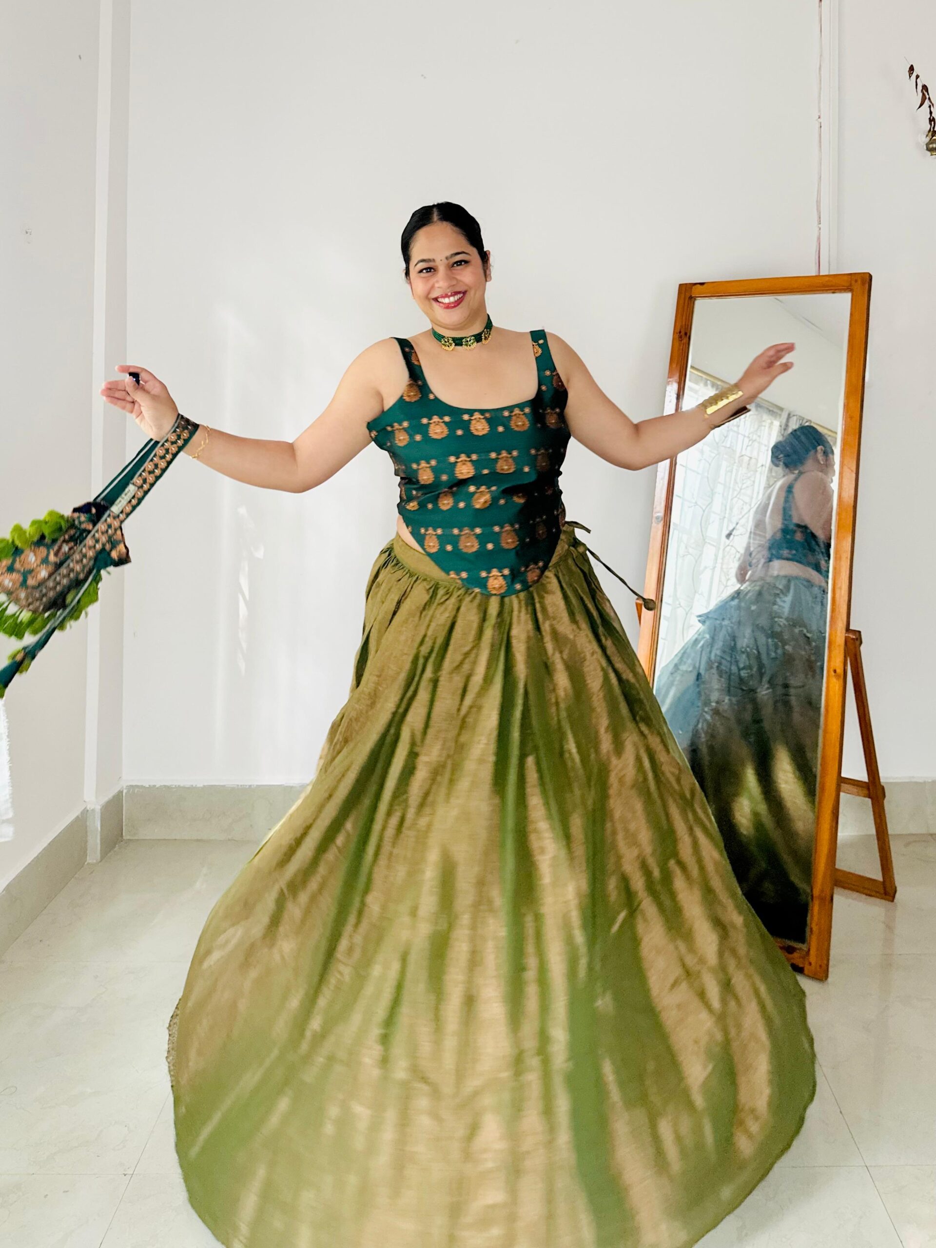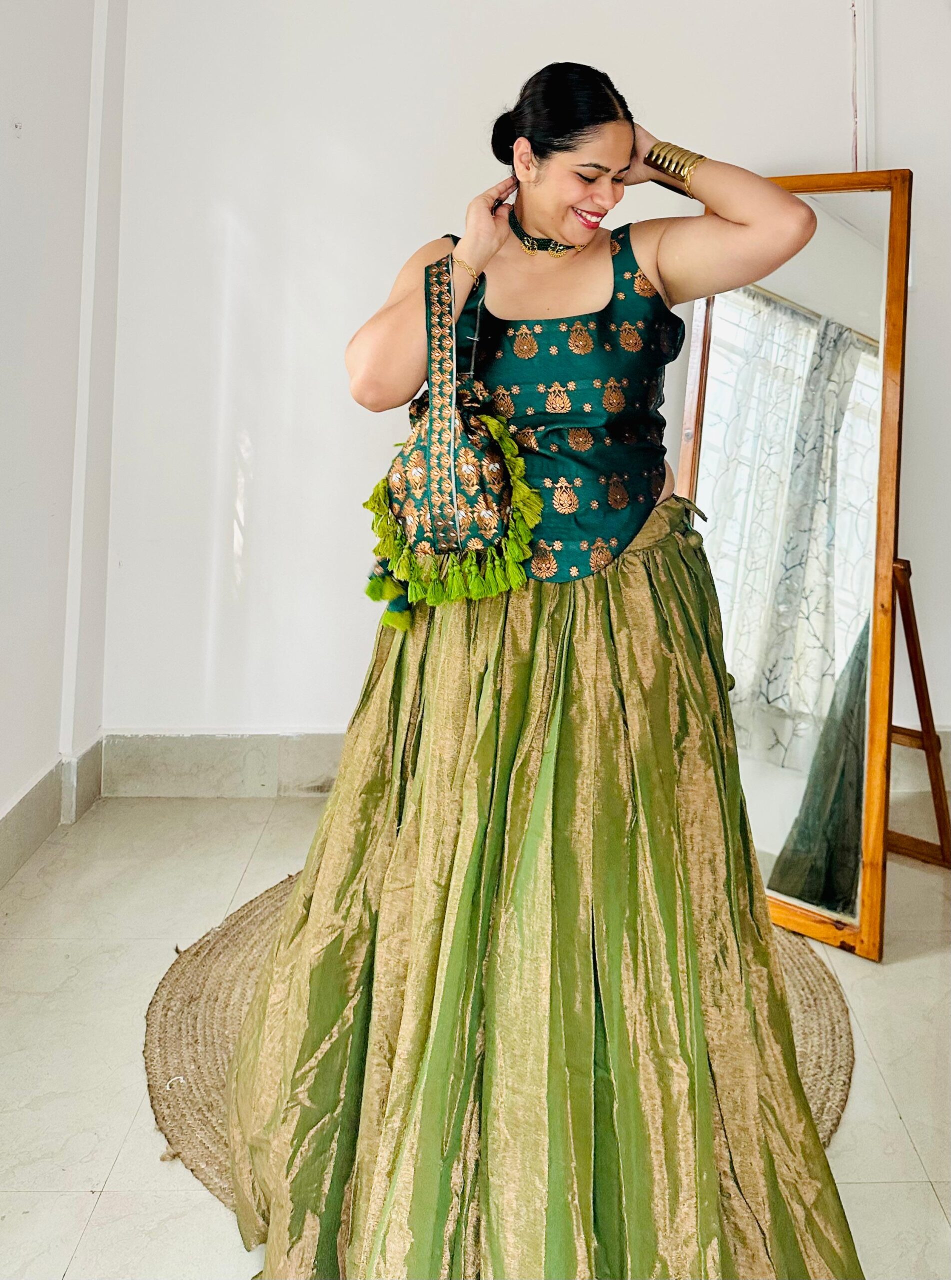 This Zari Tissue Handloom Full-Flared Skirt is crafted in a rich golden-green hue, offering a graceful flow and elegant sheen. Designed without ken-ken, the skirt retains a natural fall and lightweight comfort. A versatile statement piece suitable for festive and special occasions.