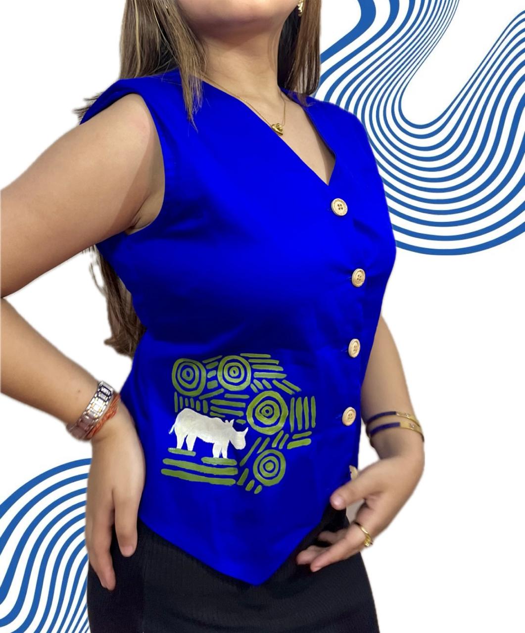 Celebrate Assamese pride with this vibrant royal blue waistcoat in luxurious cotton silk. Adorned with hand-painted artwork featuring the iconic one-horned rhino and abstract tribal-inspired motifs, it’s a true fusion of culture and contemporary style. Designed with a buttoned front and sleek fit, the piece is perfect for festive wear, cultural events, or as a bold statement layer over casual outfits.