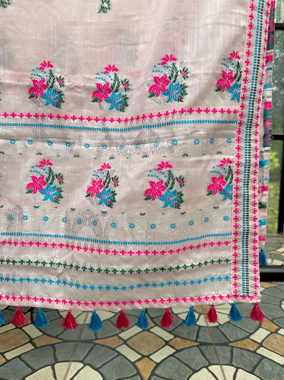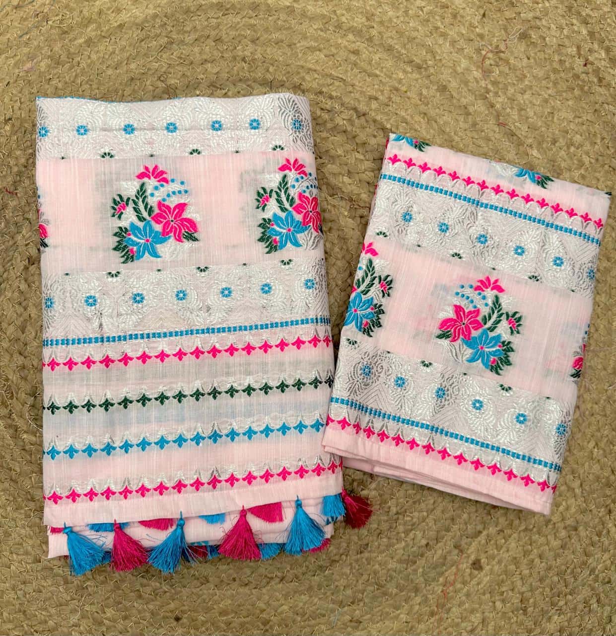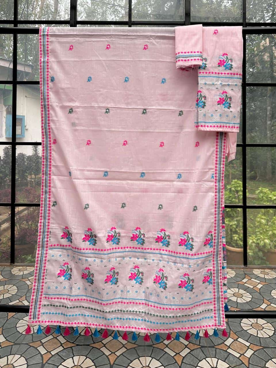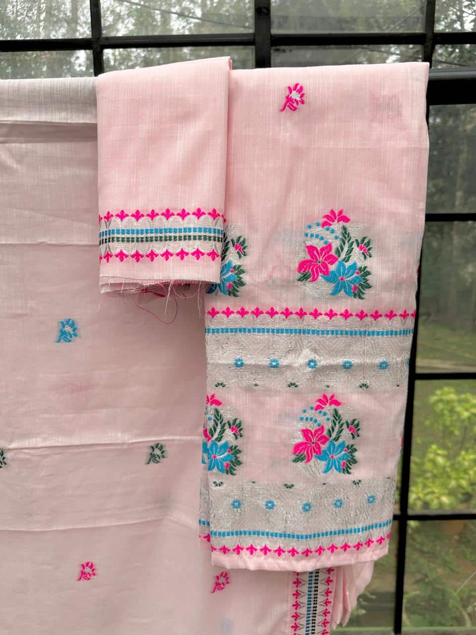 Ready-to-wear mekhela sador designed for effortless elegance and everyday ease, this piece blends comfort with a refined, premium appeal. Crafted from soft, high-quality cotton in soothing pastel tones with a graceful white base, it feels light and breathable—perfect for spring and the upcoming summer season. The highlight lies in its delicate silver thread detailing along the borders, adding a subtle sheen that elevates the entire look with understated sophistication. Versatile enough for festive occasions as well as office wear, and paired with an unstitched blouse piece for flexible styling, this ensemble is made for the modern woman who values both elegance and convenience.