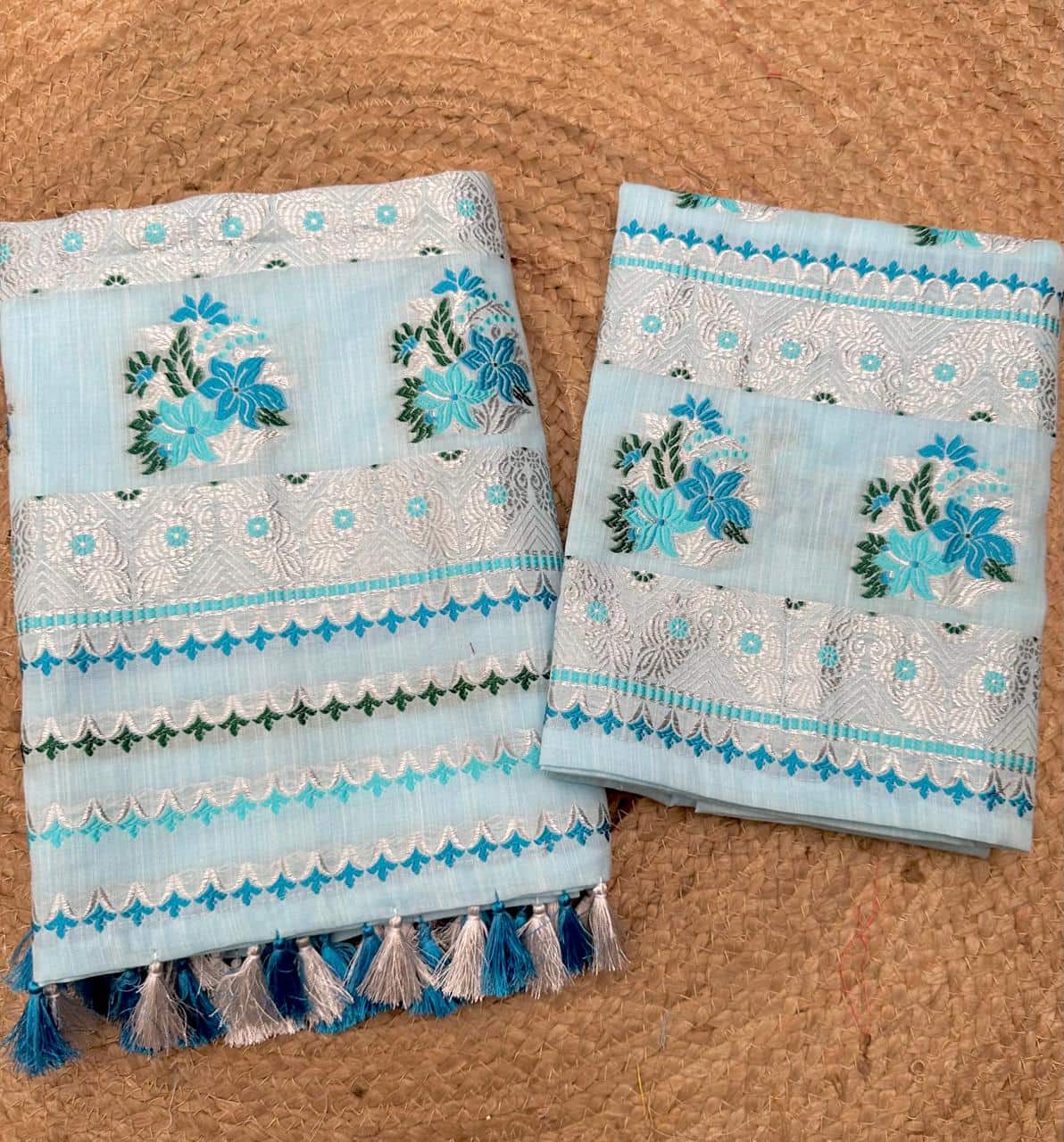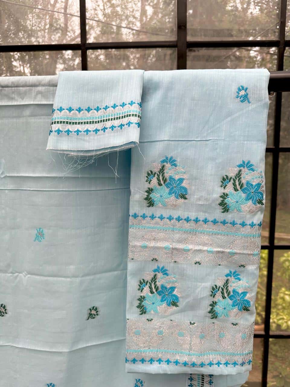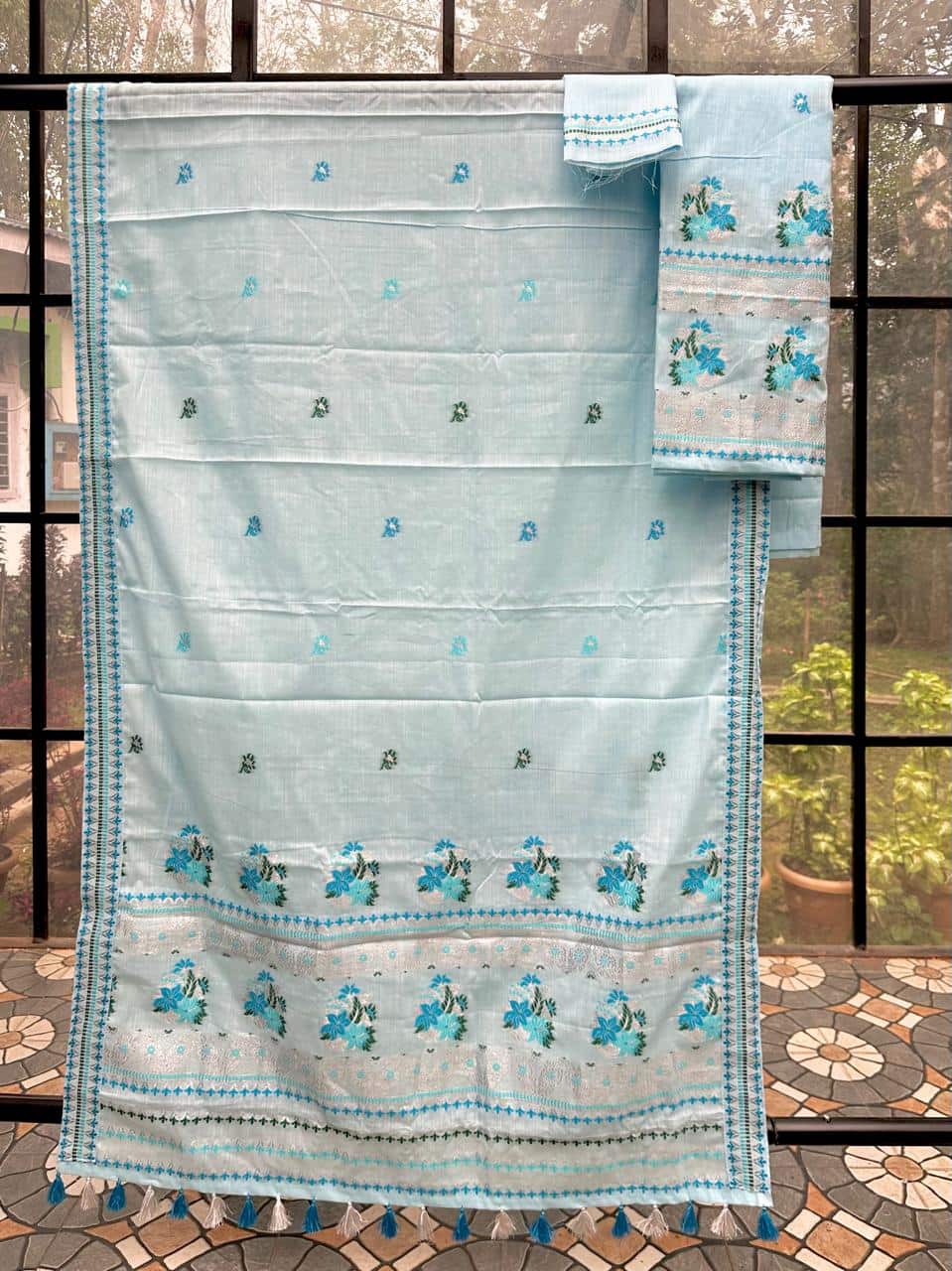Ready-to-wear mekhela sador designed for effortless elegance and everyday ease, this piece blends comfort with a refined, premium appeal. Crafted from soft, high-quality cotton in soothing pastel tones with a graceful white base, it feels light and breathable—perfect for spring and the upcoming summer season. The highlight lies in its delicate silver thread detailing along the borders, adding a subtle sheen that elevates the entire look with understated sophistication. Versatile enough for festive occasions as well as office wear, and paired with an unstitched blouse piece for flexible styling, this ensemble is made for the modern woman who values both elegance and convenience.